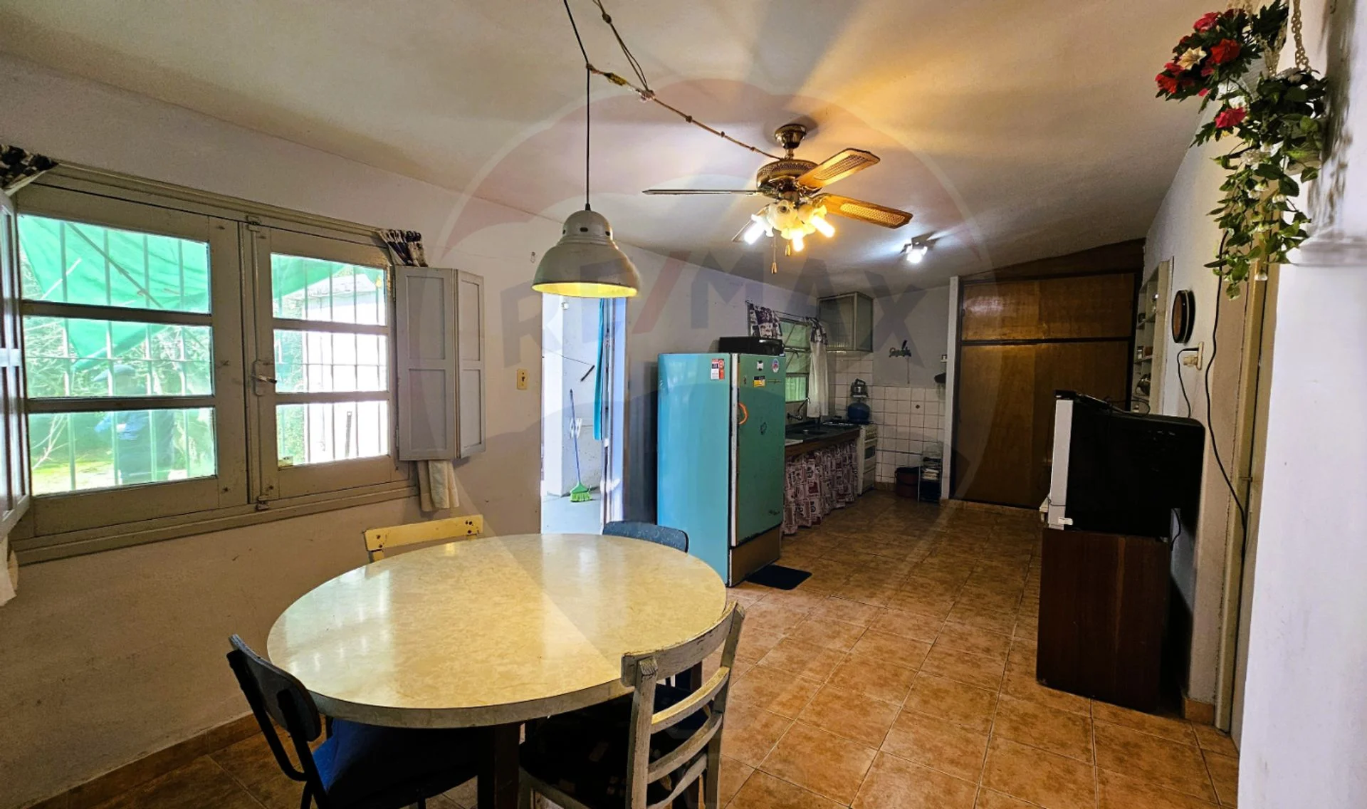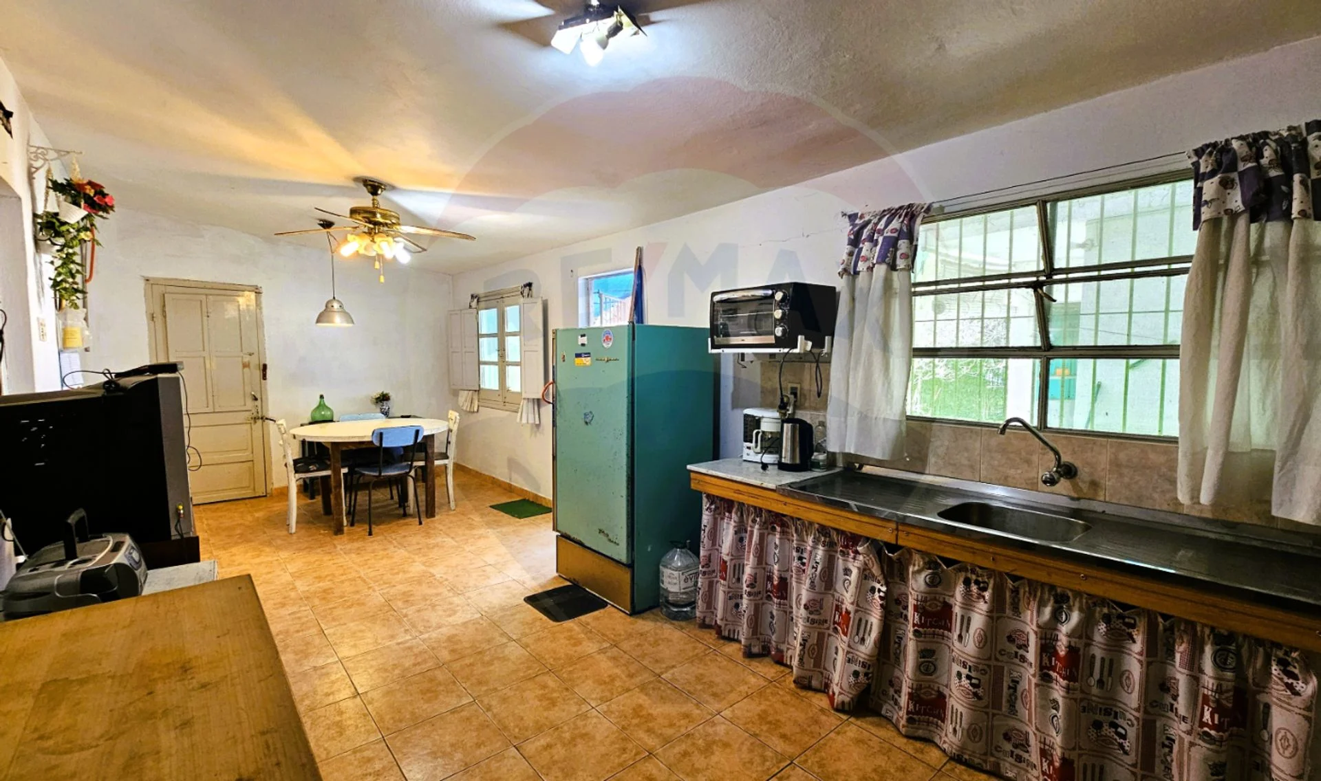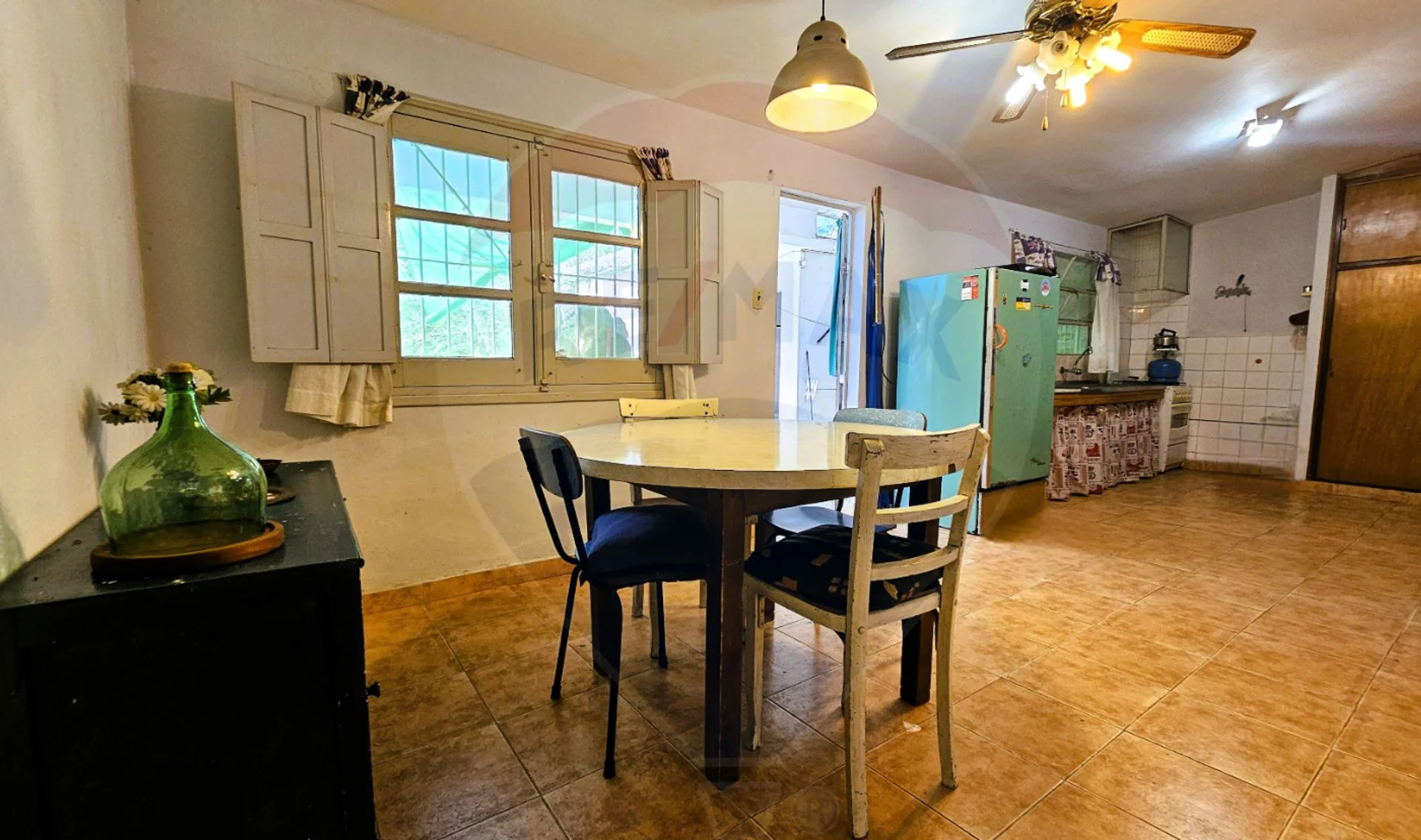Cocina comedor de buen tamaño, con doble ingreso desde el exterior (una puerta al fondo con sobrepuerta de reja, y otra desde cochera lateral).