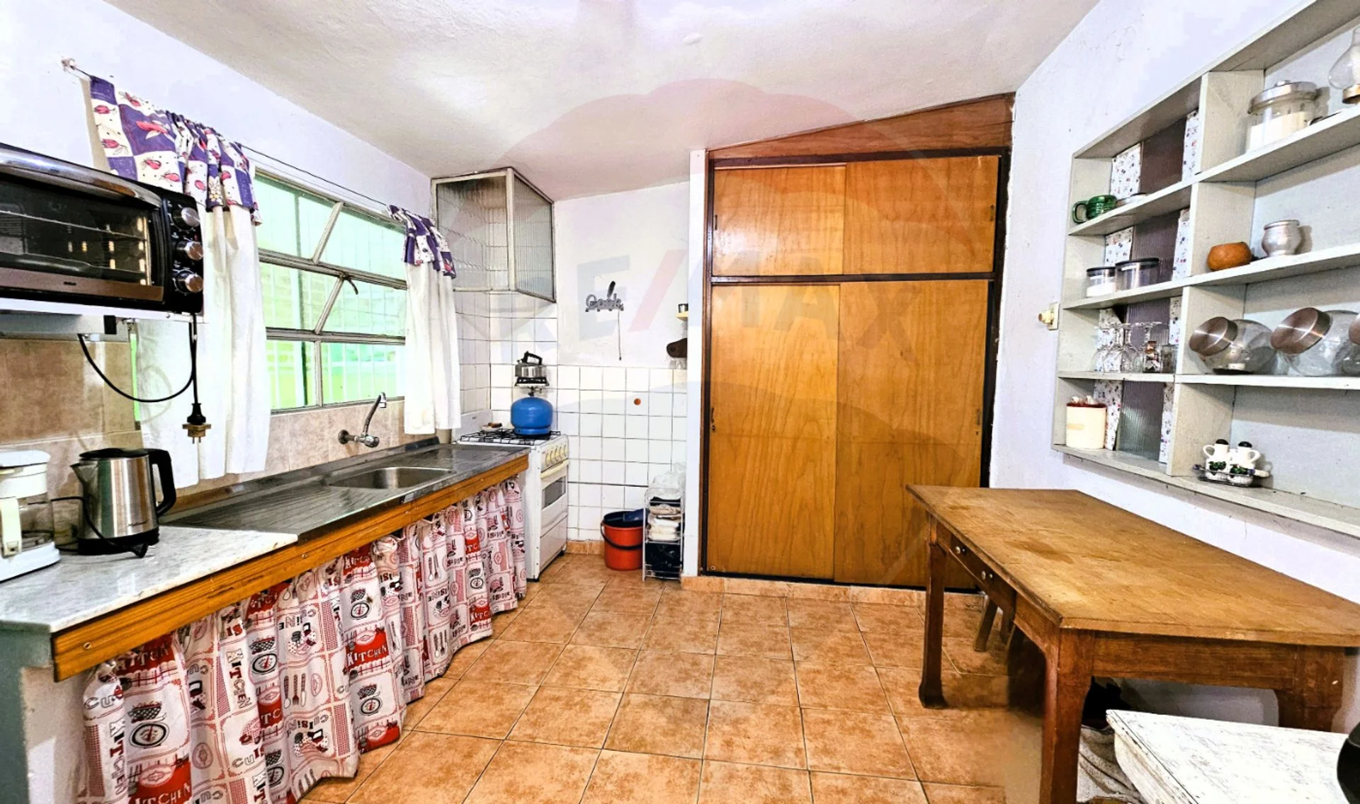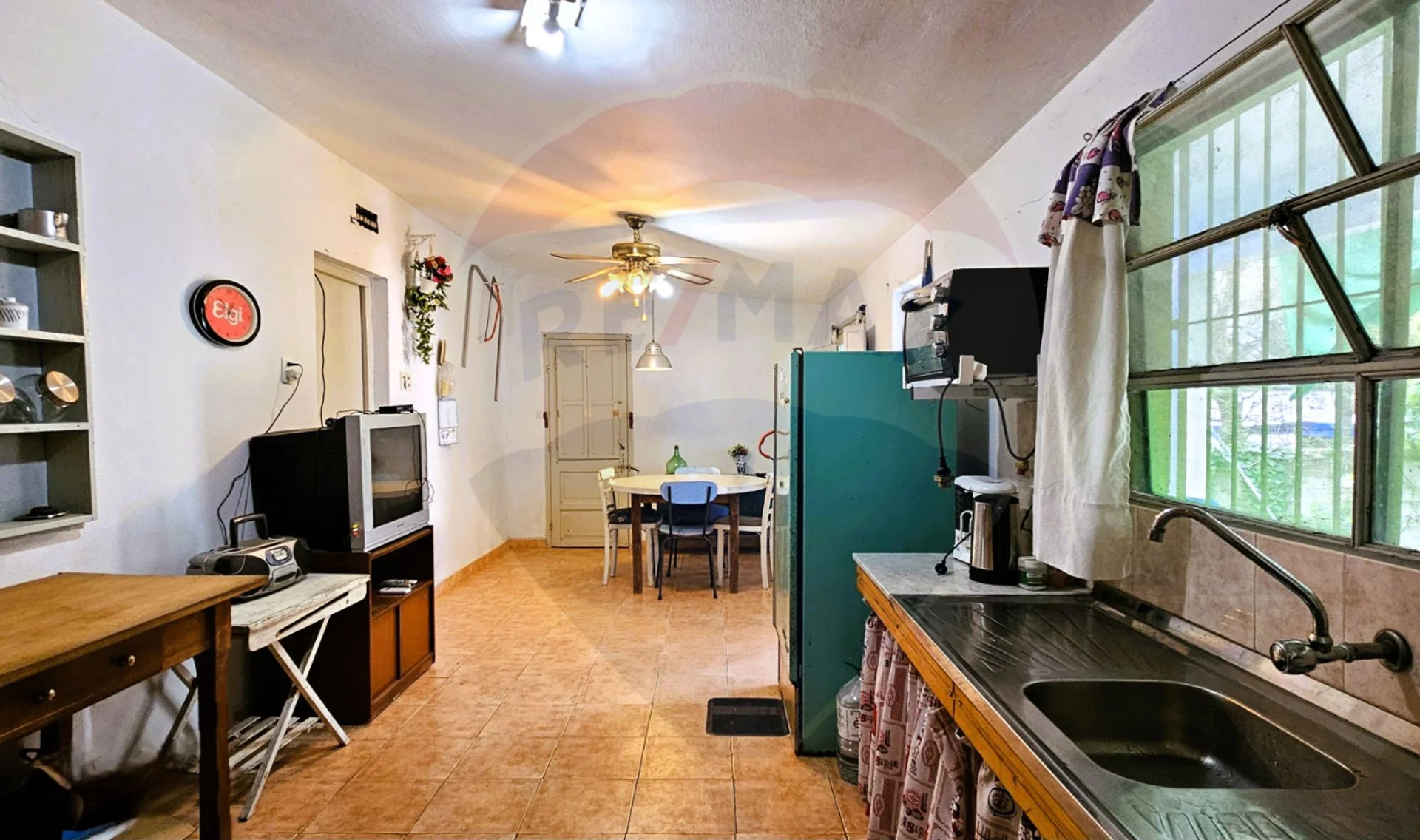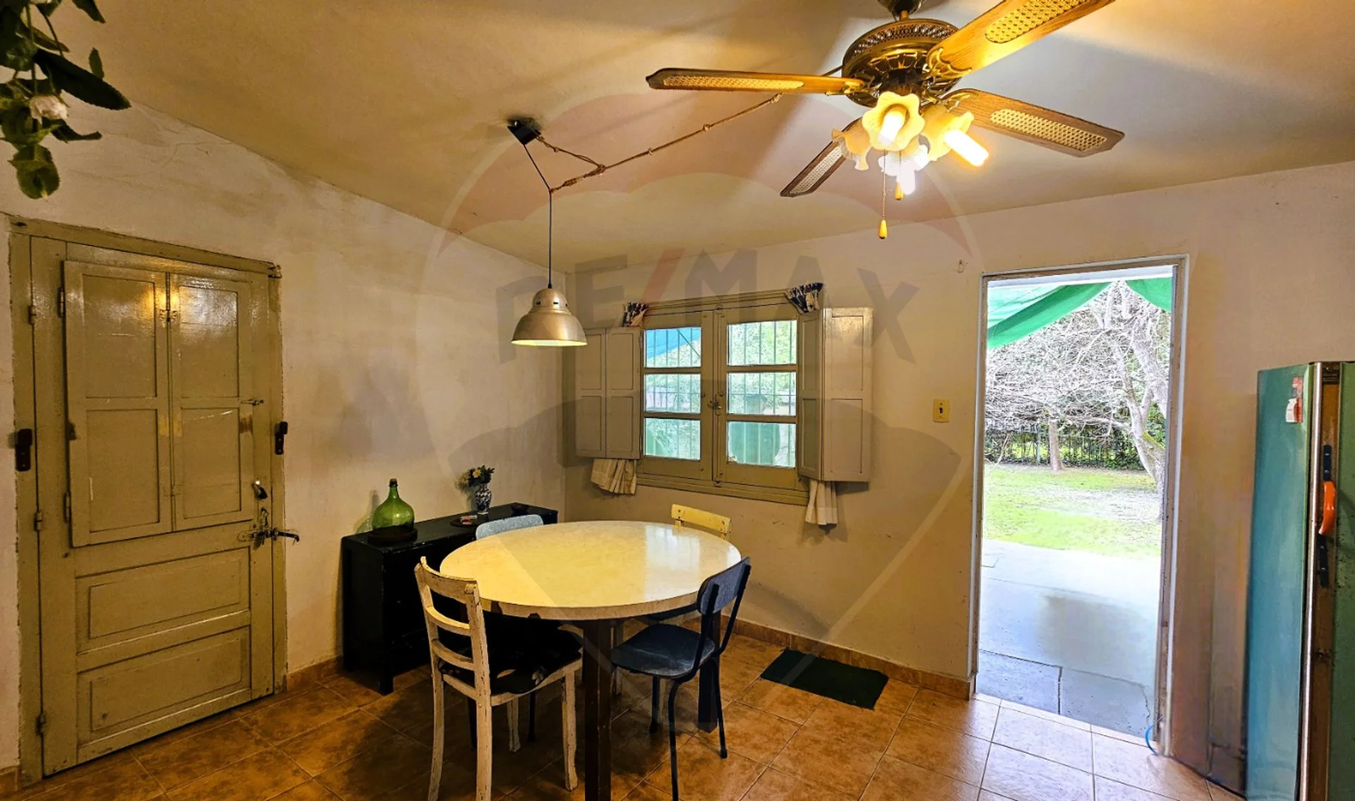 Cocina comedor de buen tamaño, con doble ingreso desde el exterior (una puerta al fondo con sobrepuerta de reja, y otra desde cochera lateral).