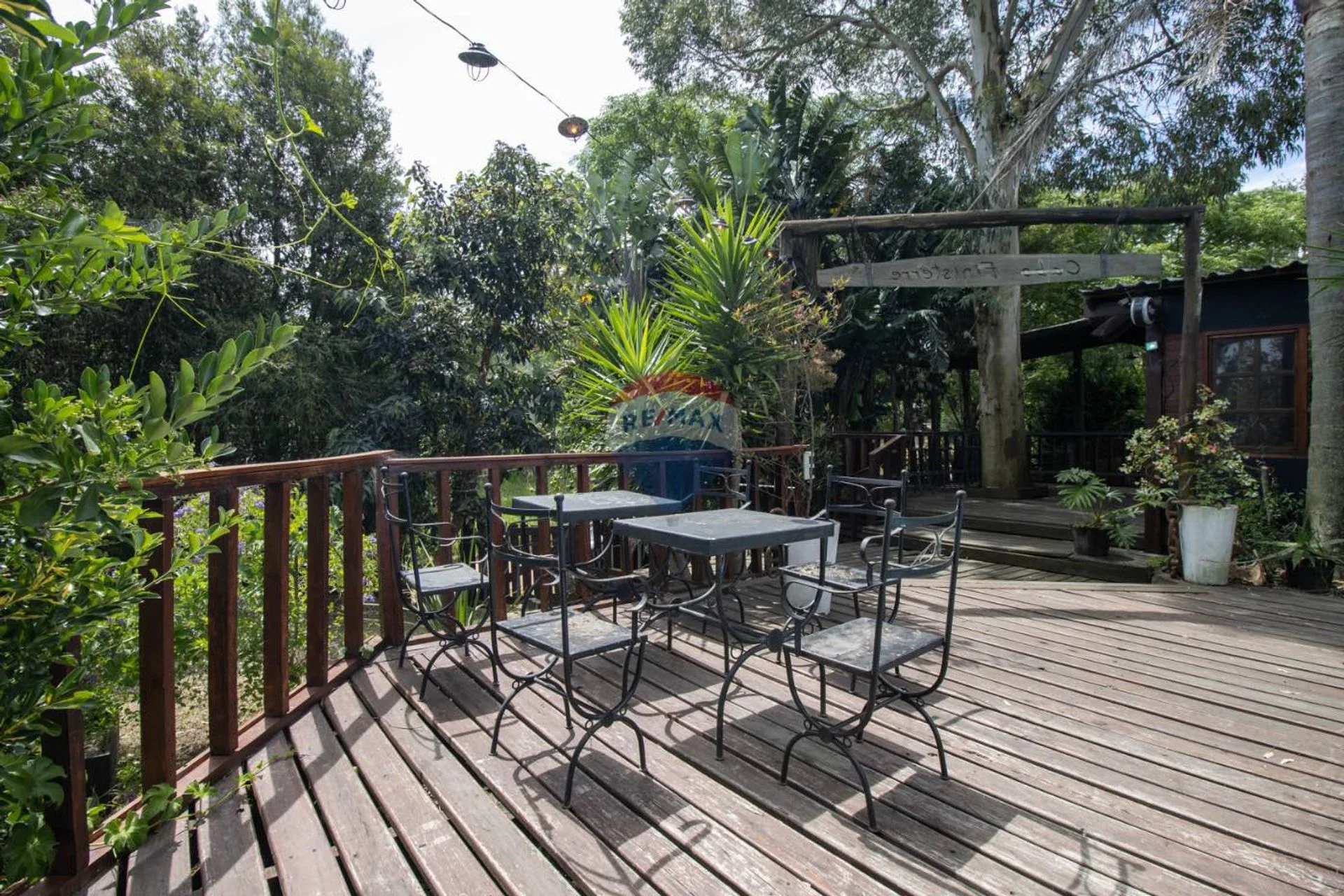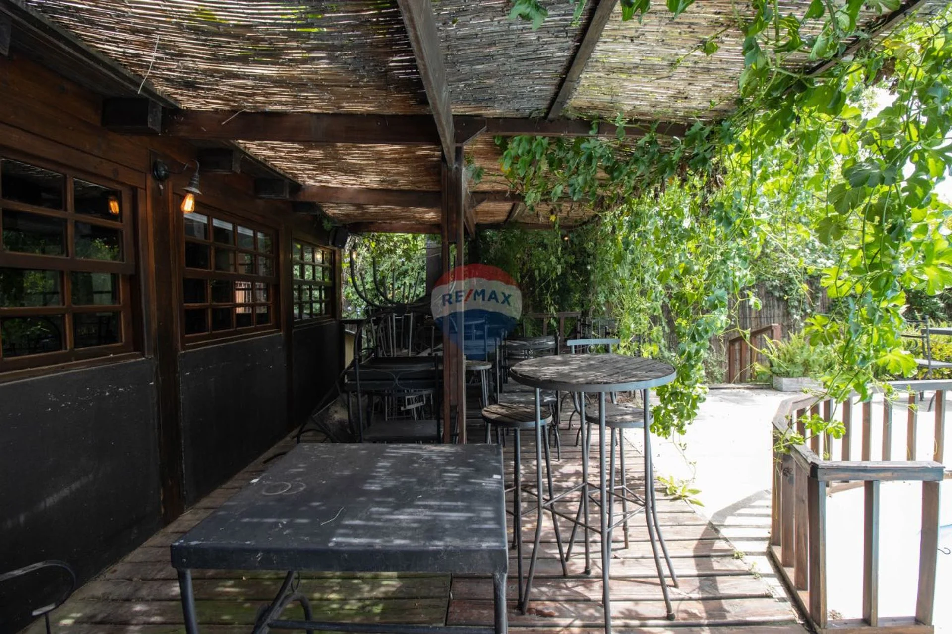 Unos pasos más adelante, aparece el segundo deck, protegido por una pérgola de madera que genera un ambiente más íntimo. Banquetas, mesas largas y luz cálida lo transforman en el lugar perfecto para grupos, celebraciones o charlas largas con vista al verde. Cada rincón parece diseñado para que los visitantes se sientan cómodos, conectados y a gusto. El restaurante también cuenta con una rampa de acceso, garantizando que todos puedan disfrutar del espacio sin límites.