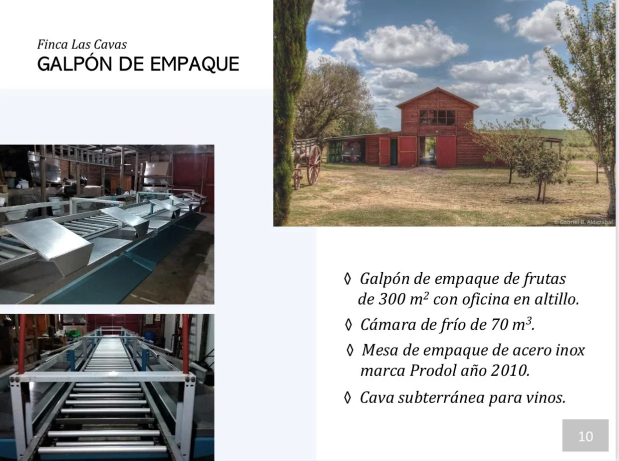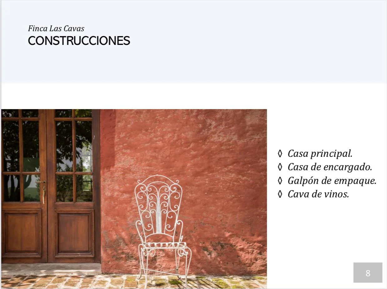 Cuenta con una casona que data del siglo XIX, que puede ser utilizada como alojamiento y ya esta funcionando en plataformas como booking y Airbnb, ademas de instalaciones varias que pueden ser utilizadas para realizar recorridos turísticos, como un galpón de empaques y una cava de vino.