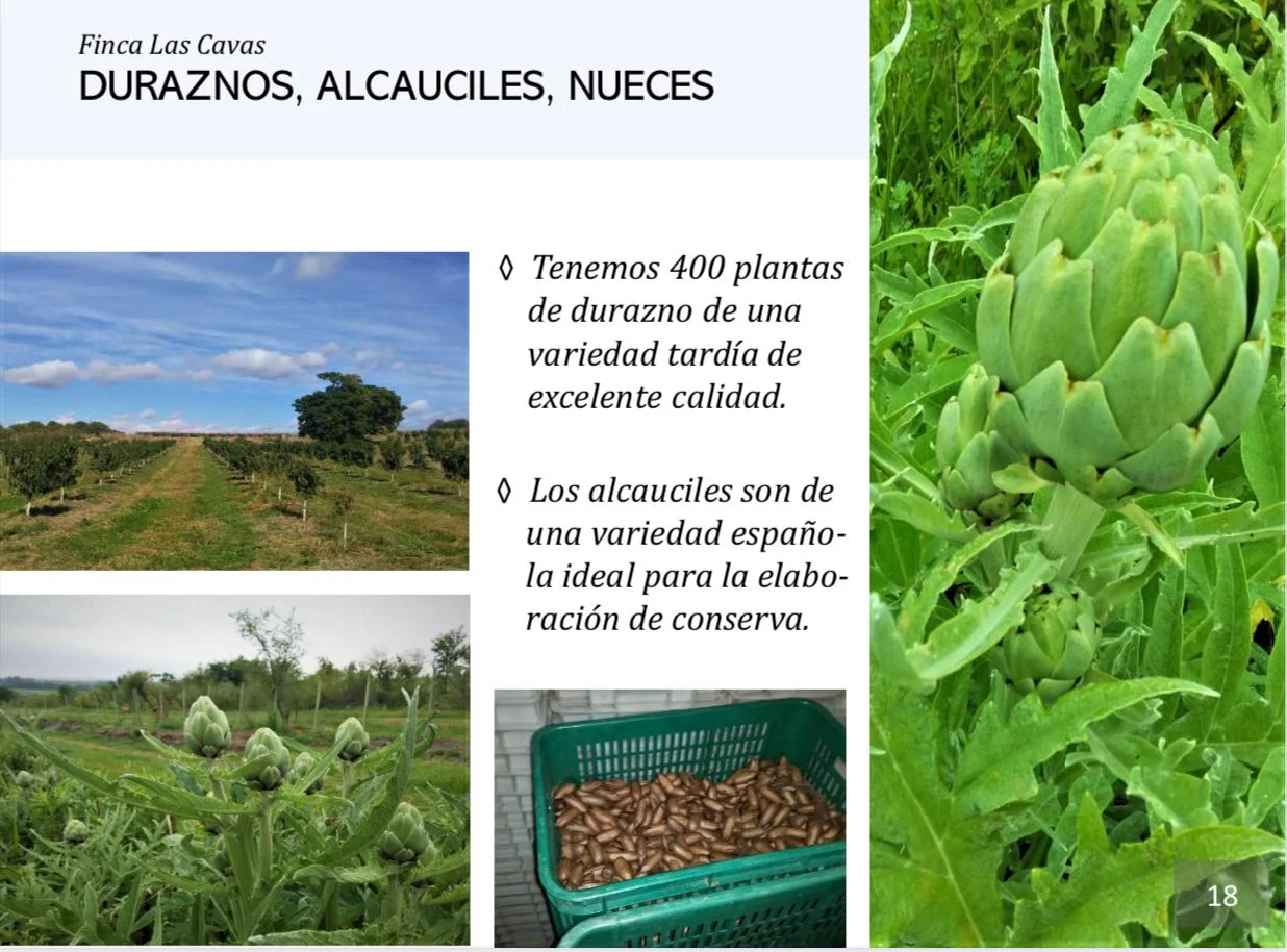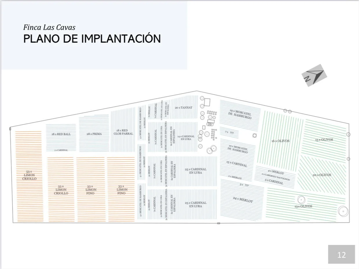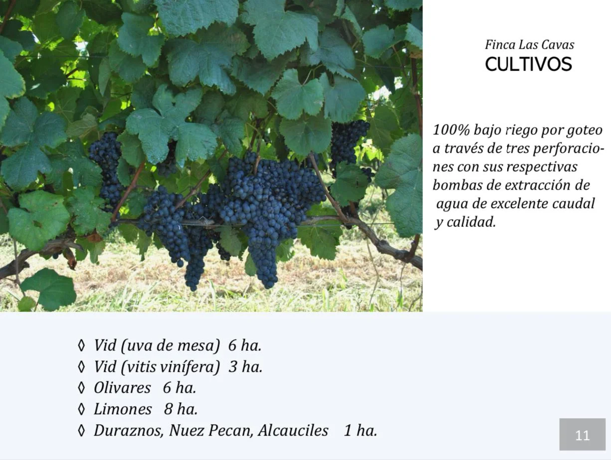 Esta finca cuenta con Viñedos, limoneros, olivos, durazneros, nogales pecan y alcauciles, lo que permite la producción de varios productos con bastante demanda y que a la vez pueden ser utilizados en la actividad del enoturismo.