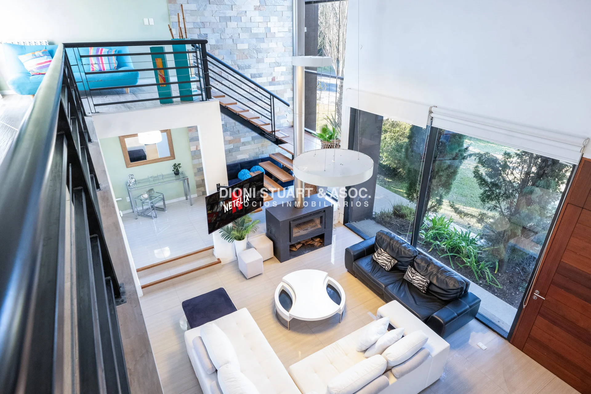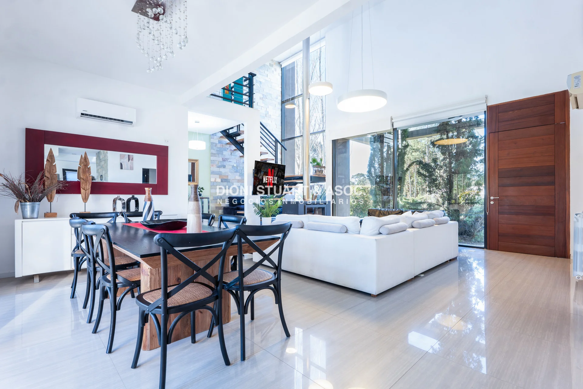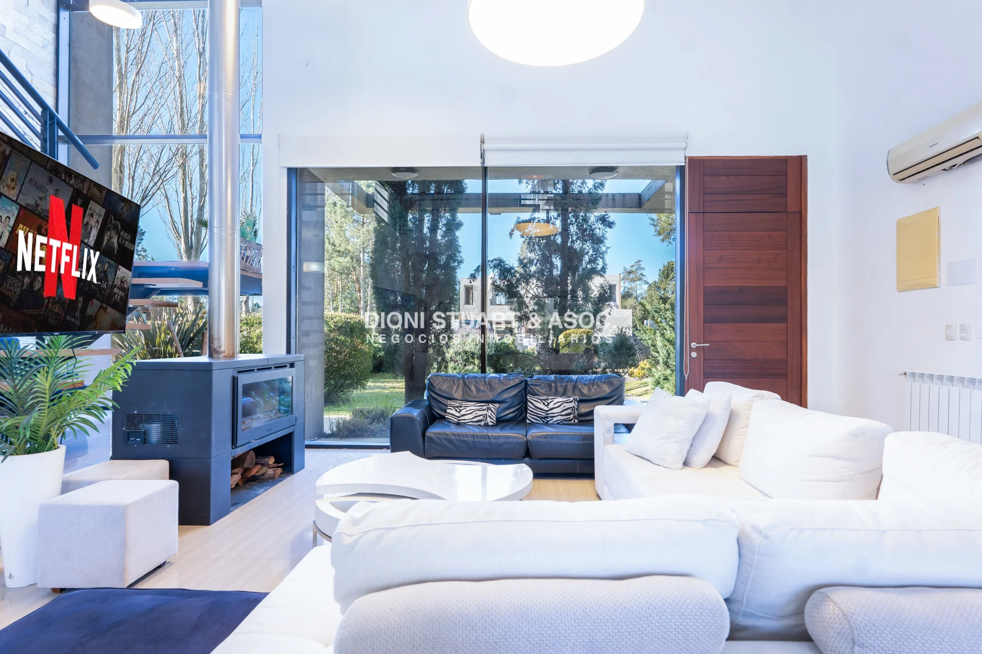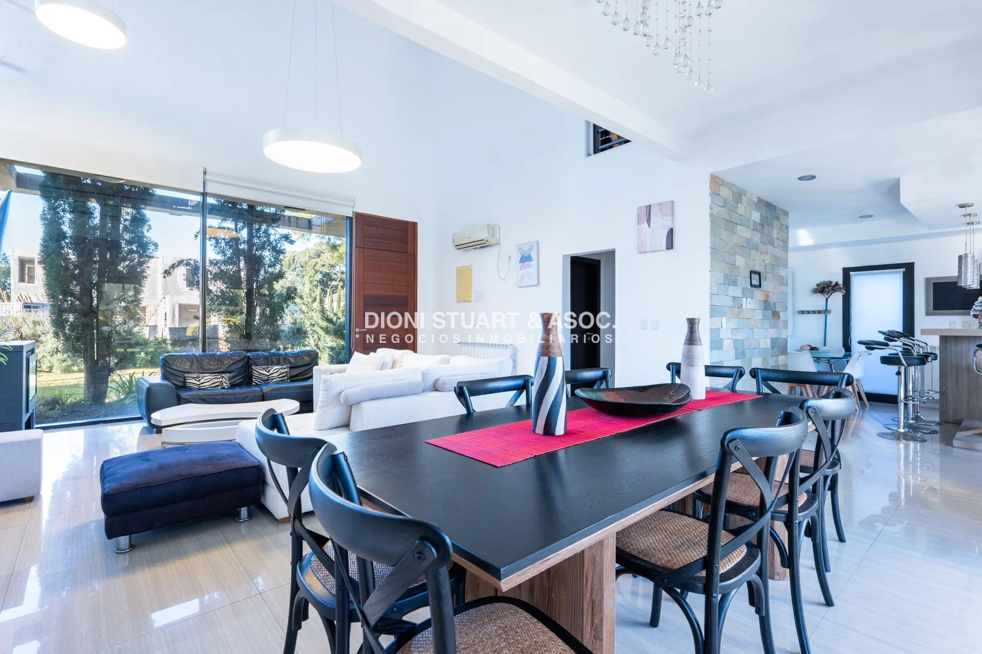 La propiedad consta de dos plantas, en planta baja un amplio living-comedor con hogar a leña, aire acondicionado, y amplios ventanales de en doble altura que permiten la entrada de luz natural todo el día, cocina estilo americana con barra y isla americana, totalmente equipada, con vistas al jardín. A demás, en planta baja encontramos dormitorio con placares empotrados, ante baño y baño. En el segundo piso, encontramos un dormitorio tipo oficina con dos camas de 1 plaza, ideal para niños o invitados, un segundo dormitorio con placard, y el dormitorio principal en suite con walk-in closet. Es importante destacar que en todo su interior a demás de tener Aires acondicionados también cuenta con paneles en pared que funcionan con gas, ideales para mantener la casa en un clima perfecto durante el invierno.