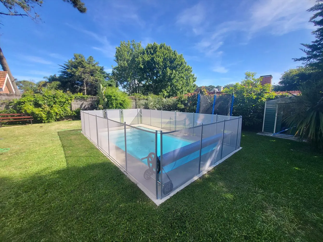 Cochera techada para un auto, amplio fondo con piscina climatizada.