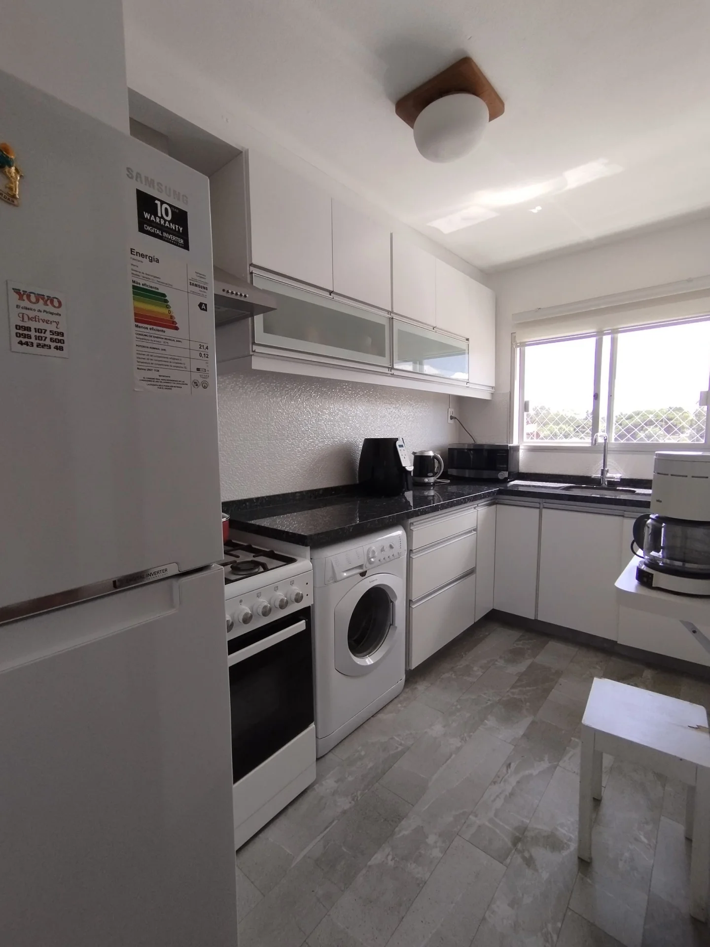 Cocina reciclada, con todas las comodidades. Heladera con freezer, microondas, lavarropas.