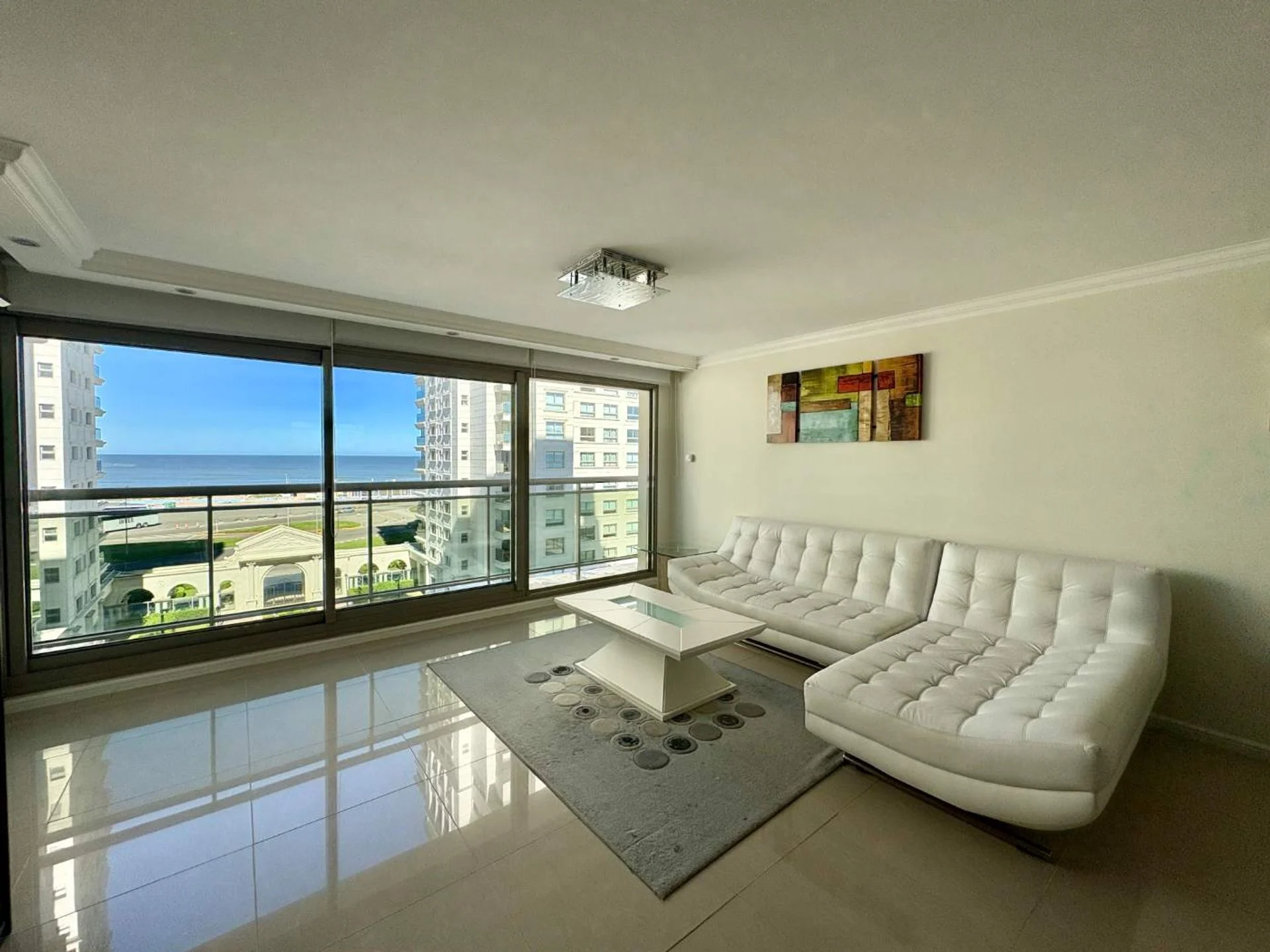 Living - comedor: Un espacioso y luminoso living con grandes ventanales que ofrecen vista a playa brava.