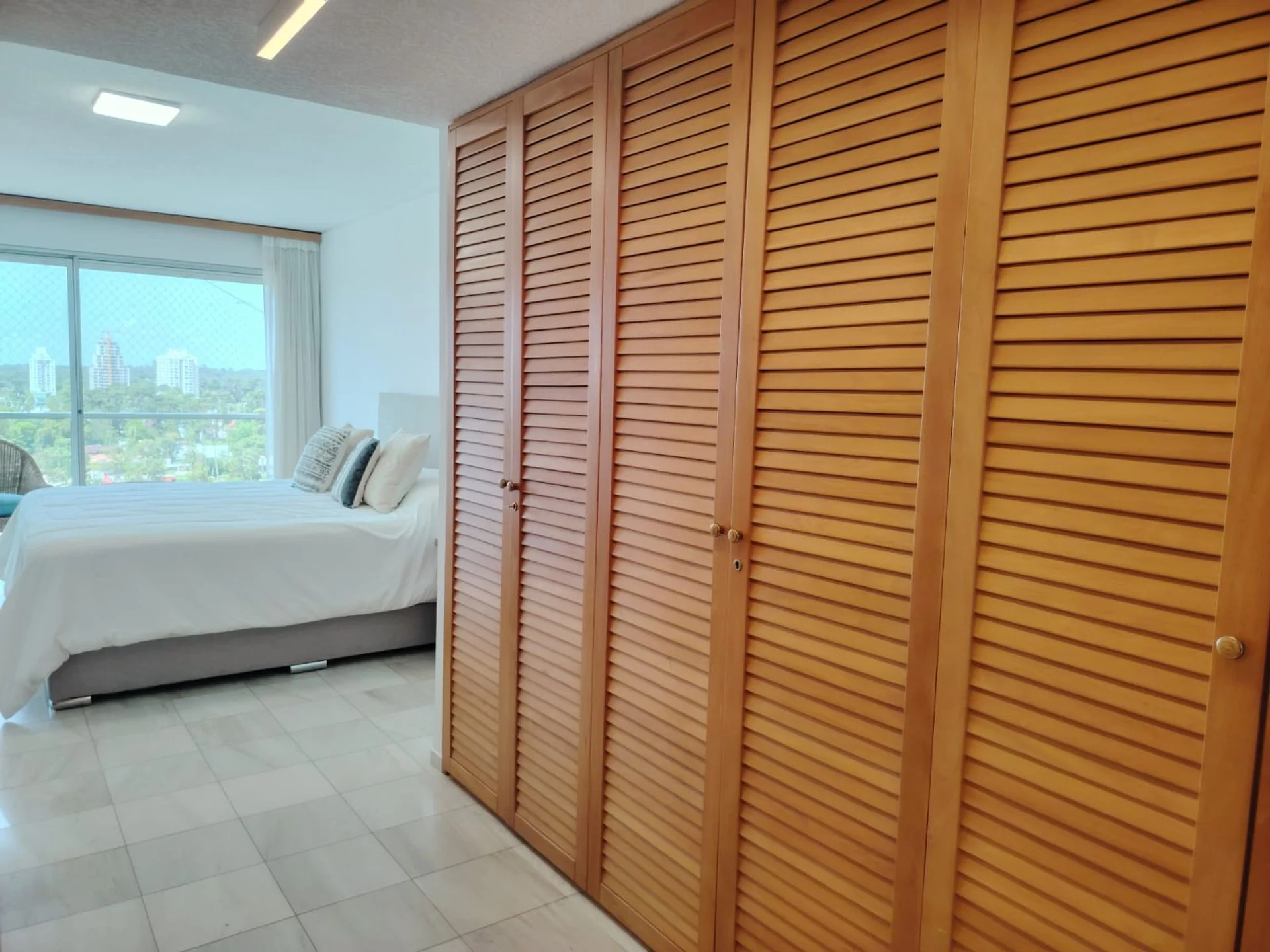 Dispone de tres dormitorios en suite, todos con aire acondicionado y cortinas motorizadas, destacándose la suite principal por su confort y luminosidad.