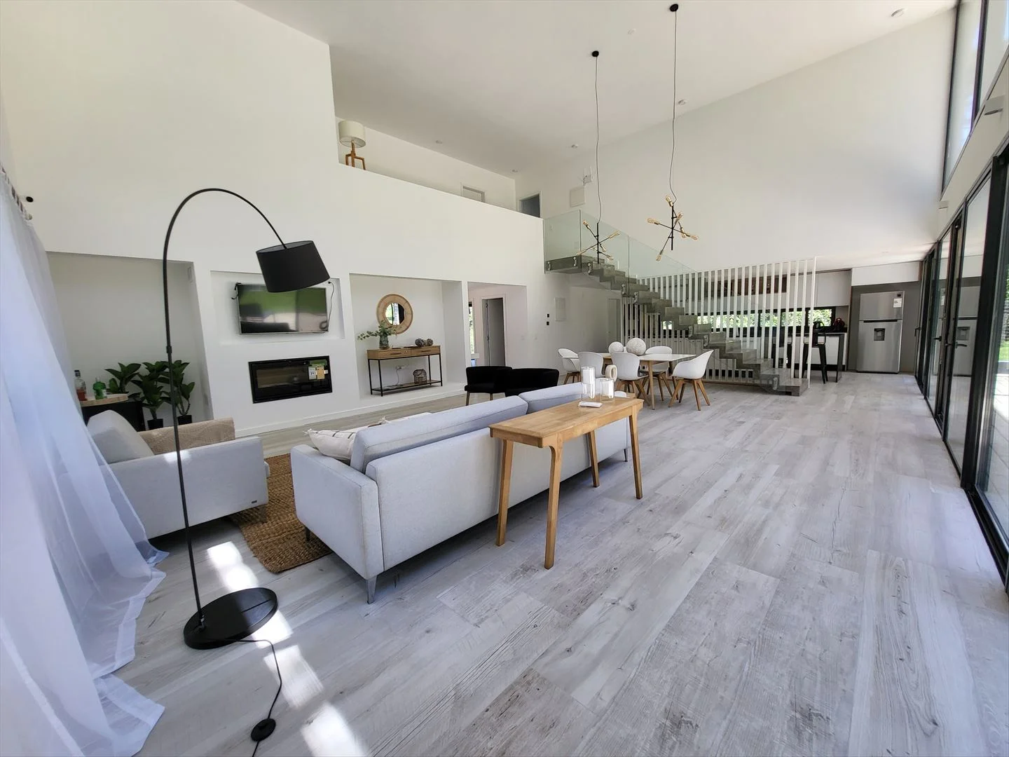 Moderno diseño de líneas puras con ambientes amplios y luminosos. Grandes ventanales que integran el exterior con el interior, generando espacios llenos de luz y de naturaleza.