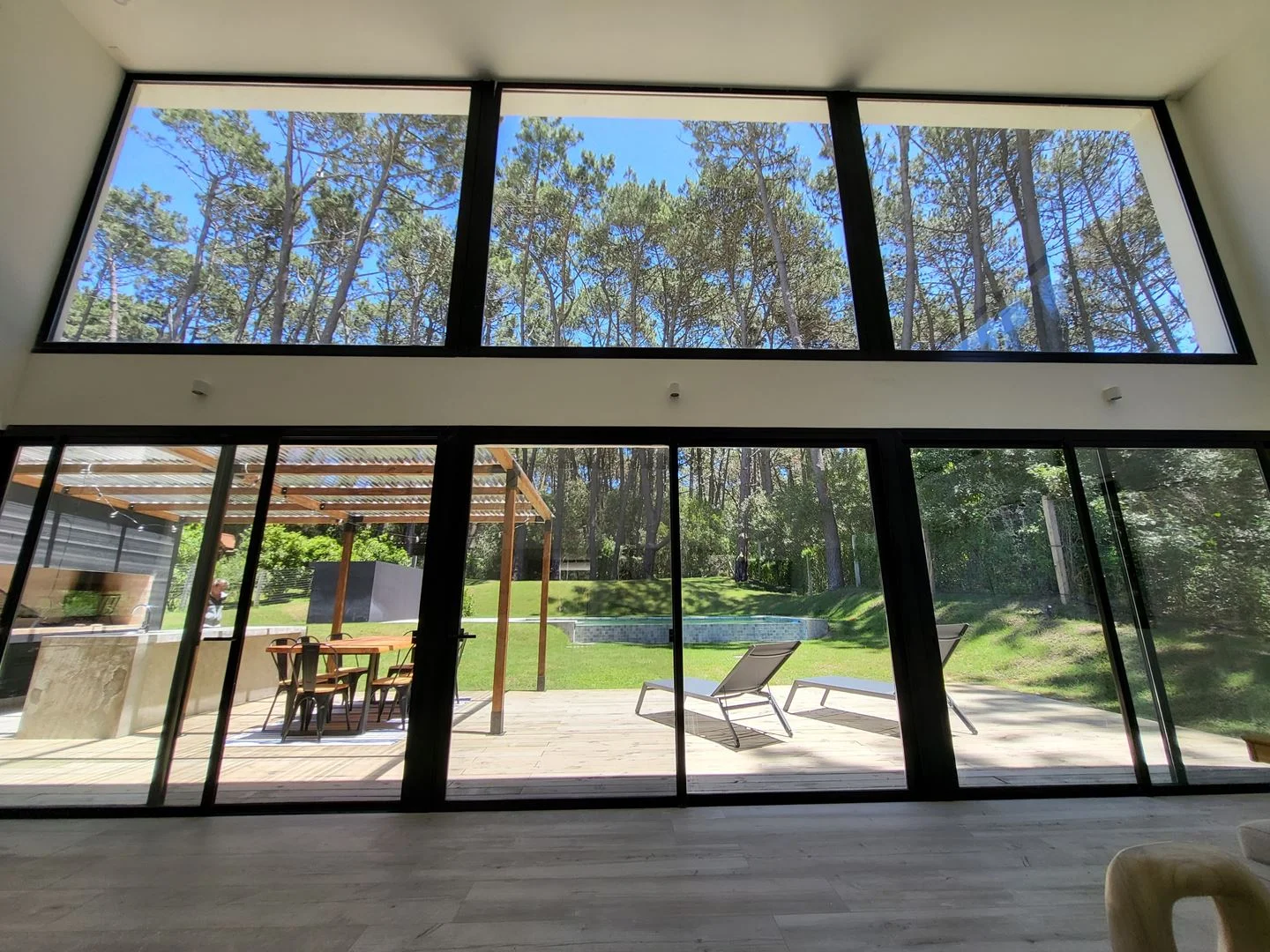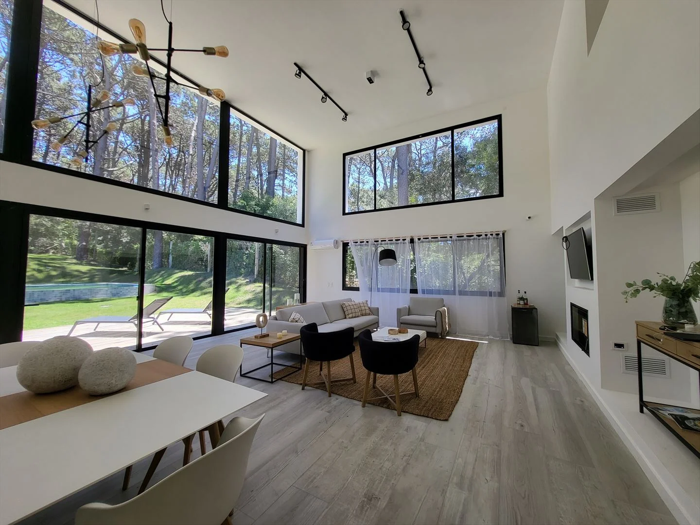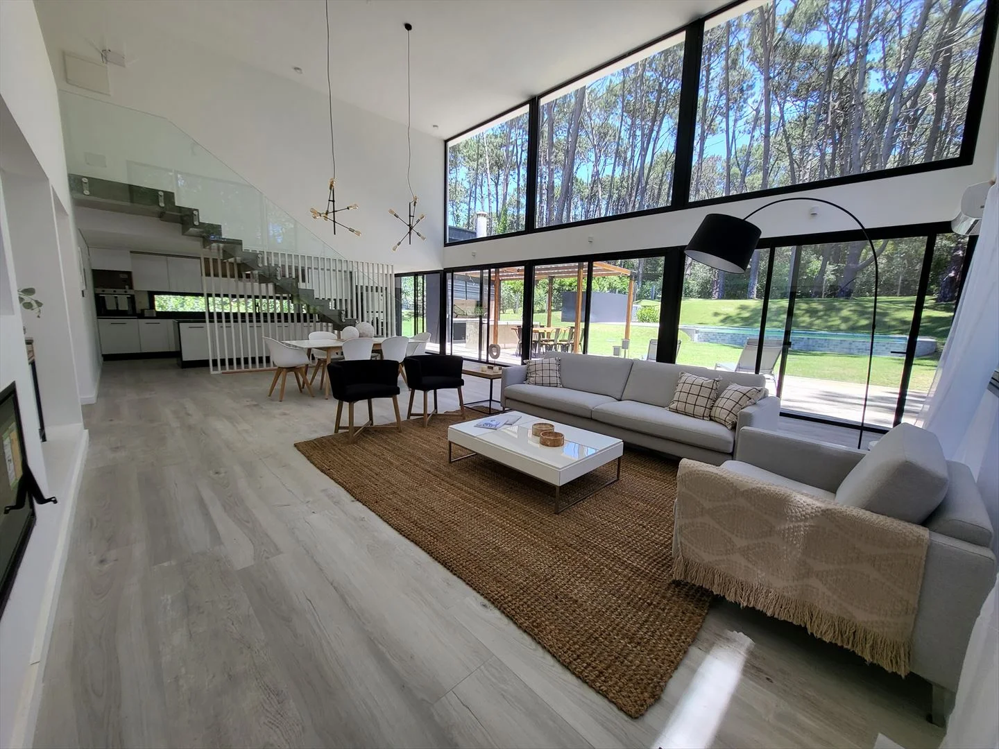 Living-comedor con doble altura, con vistas al bosque. Salida a deck con parrillero, piscina infinita y gran fondo verde.