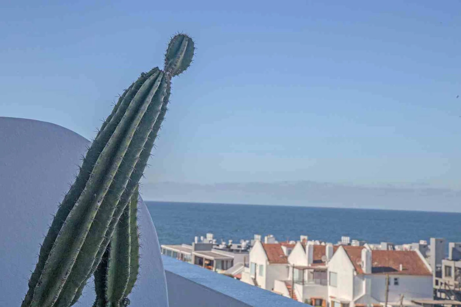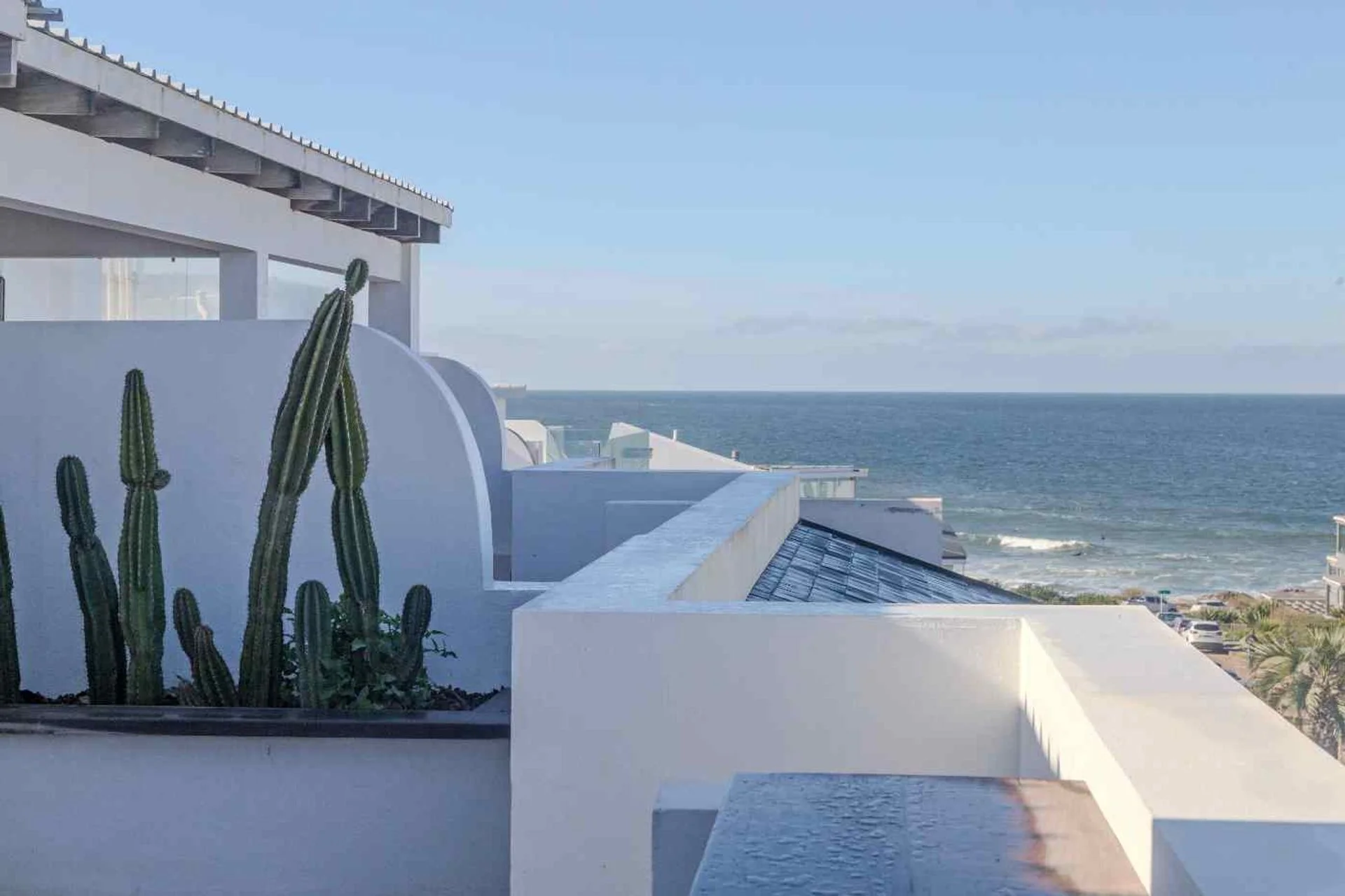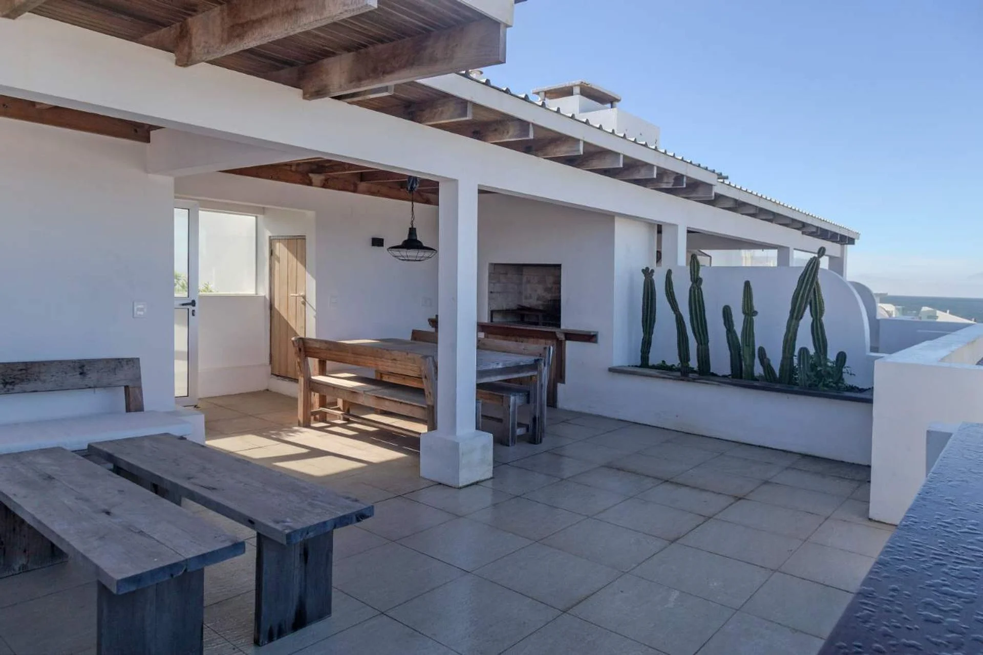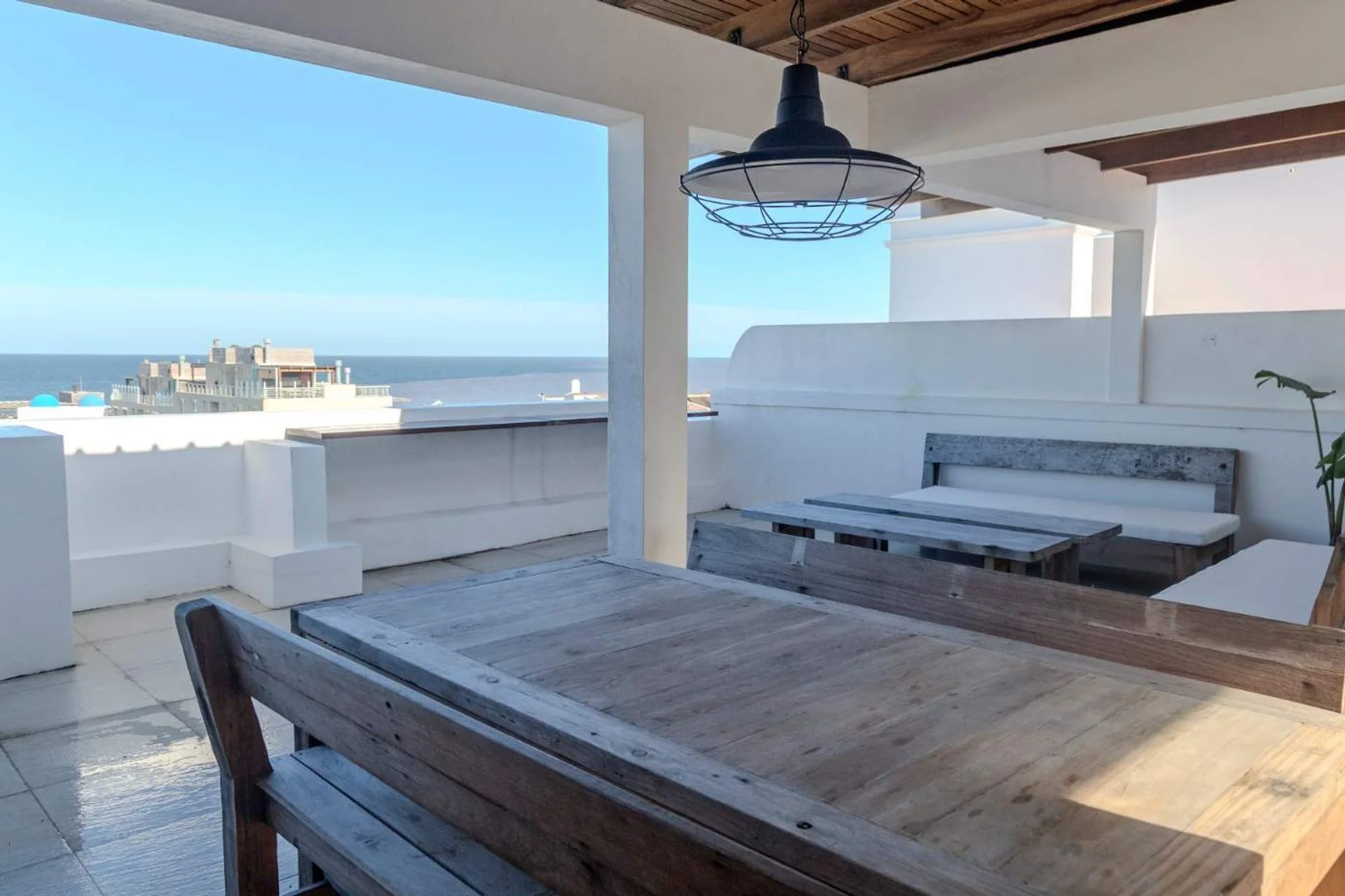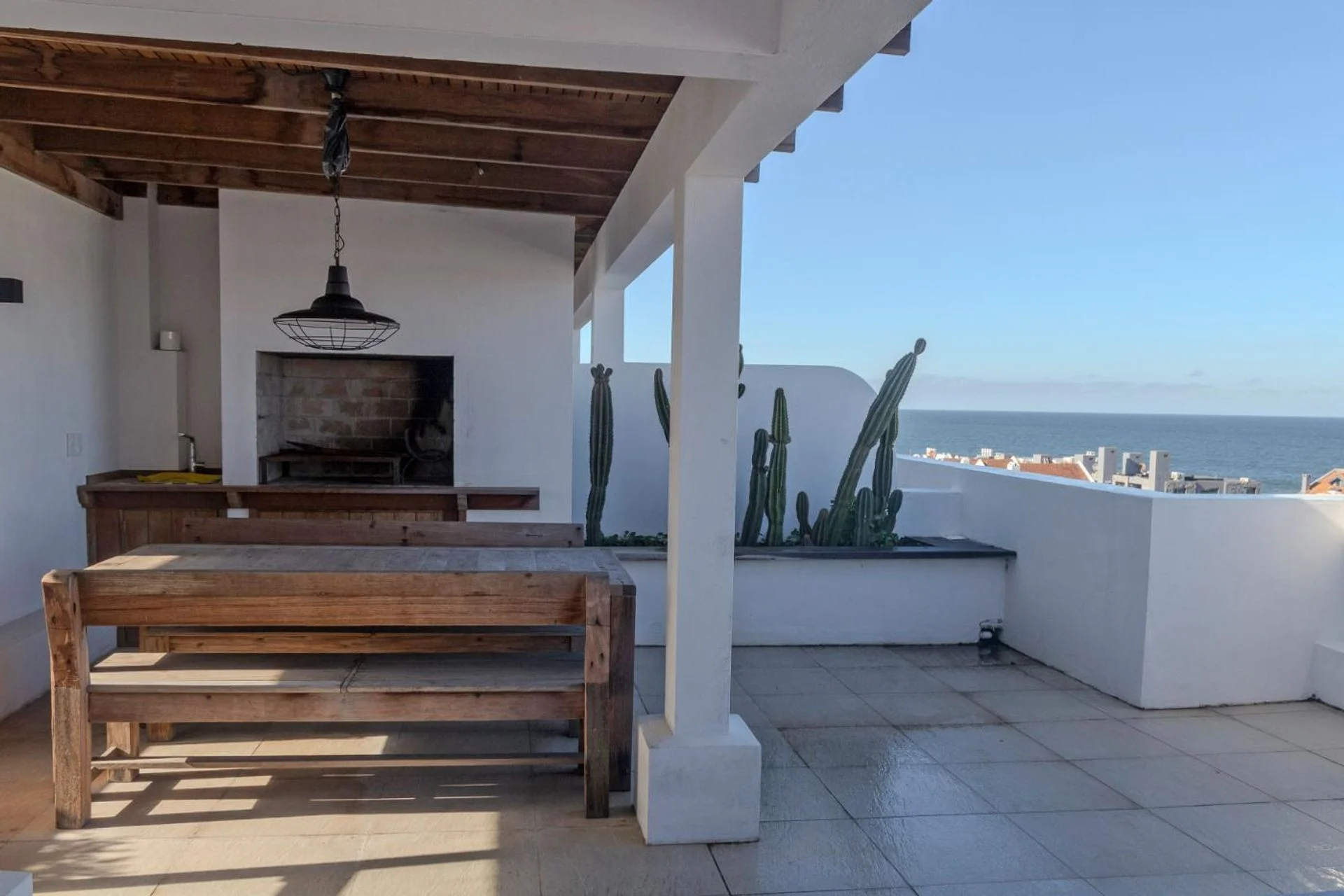 Una amplia terraza penthouse con excelente vista al mar, juego de mesa sillas y reposeras con parrillero