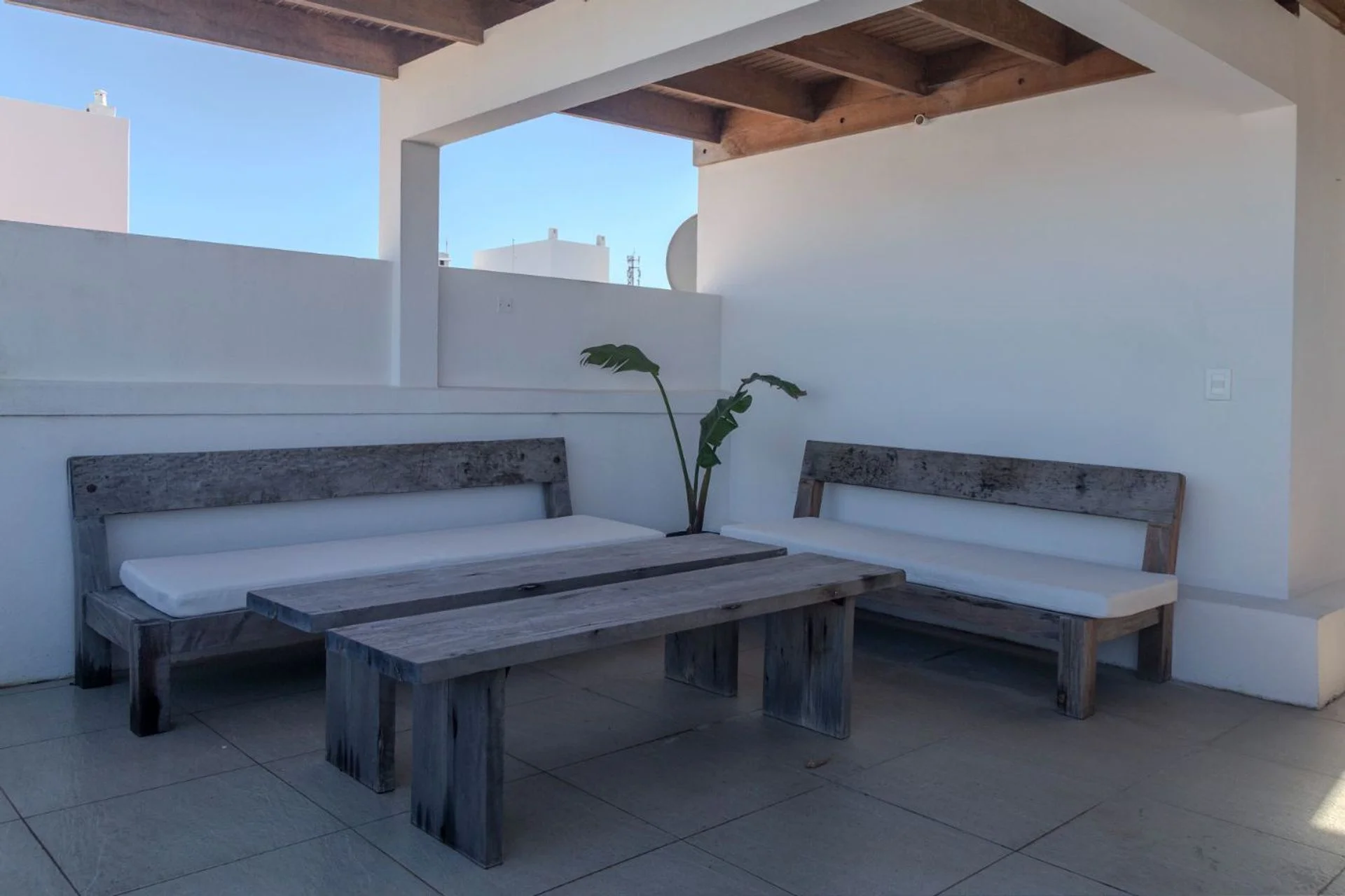 Una amplia terraza penthouse con excelente vista al mar, juego de mesa sillas y reposeras con parrillero