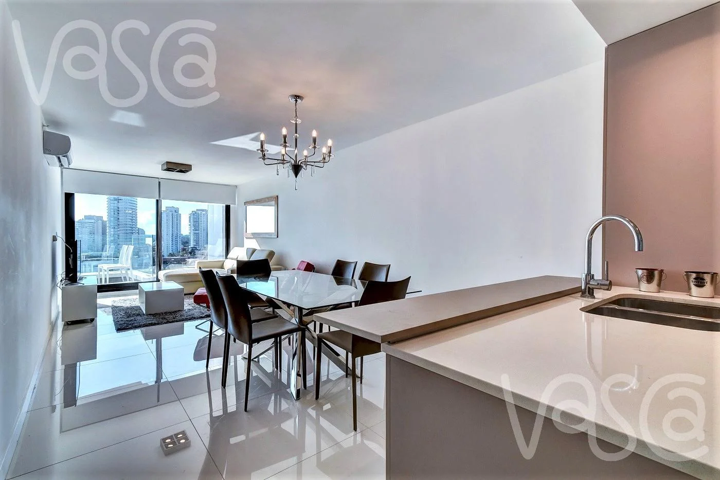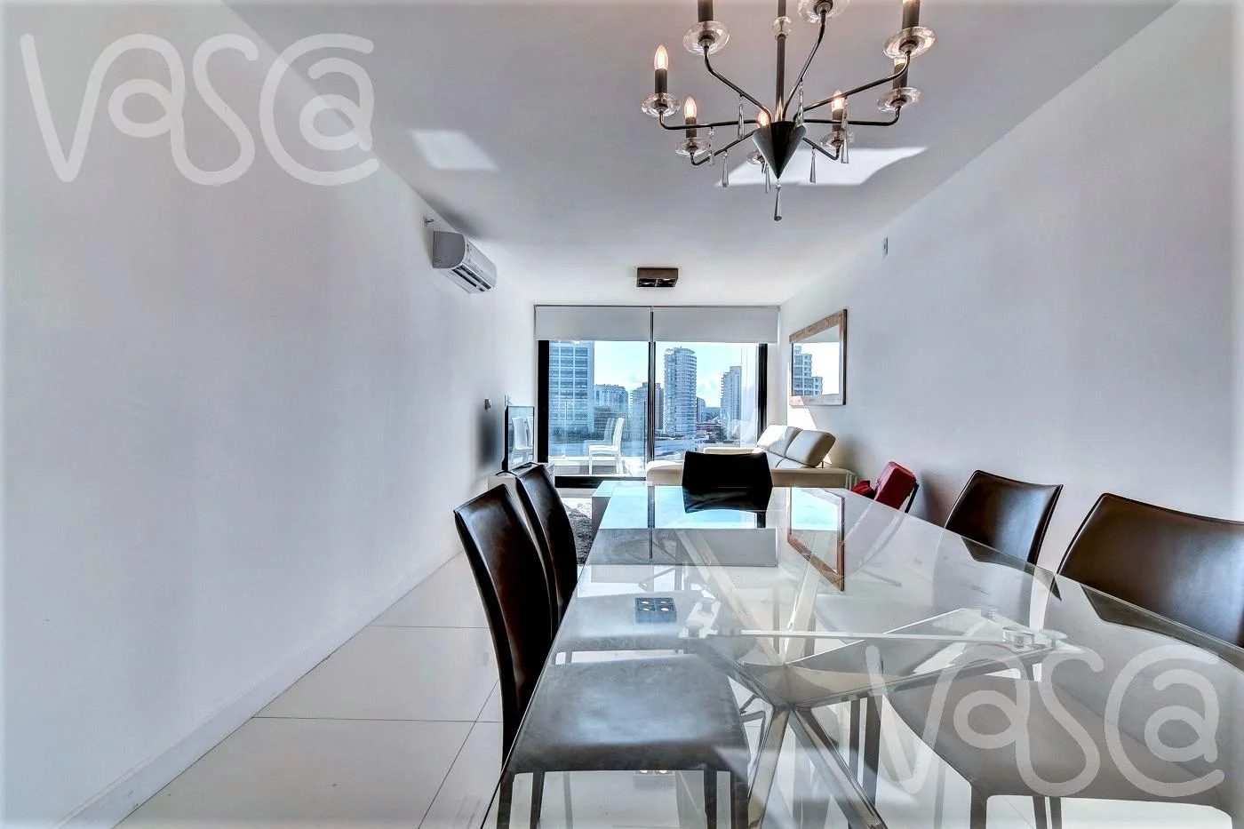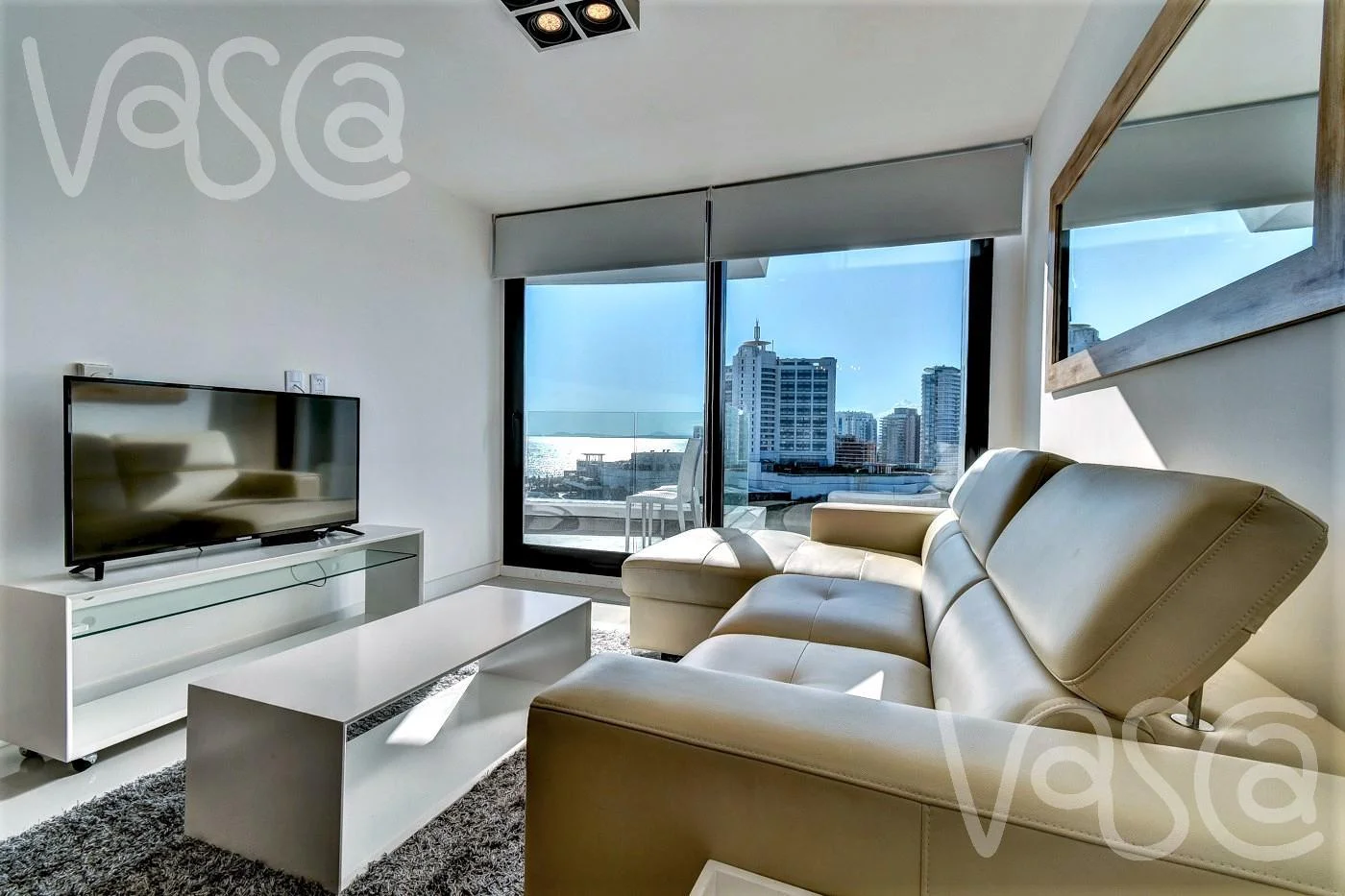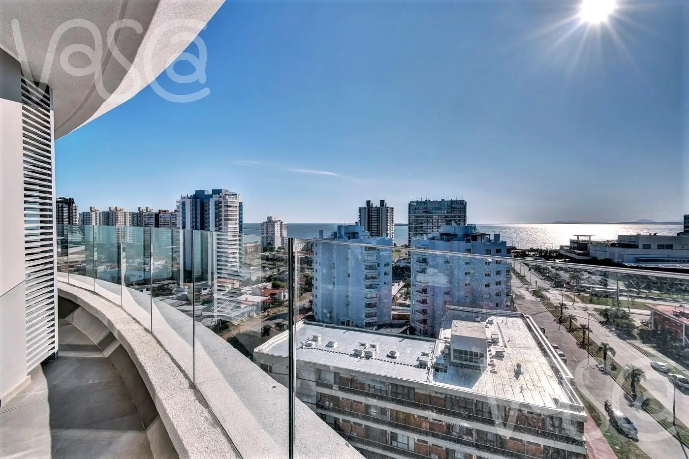 Ubicado en un piso alto, con vista al mar se encuentra este apartamento en excelentes condiciones. Dos dormitorios, el principal en suite y con vestidor, y con amplios ventanales que permiten salir al balcón desde todos los ambientes. Living comedor con cocina integrada, área de lavadero y balcón que bordea todo el depto.