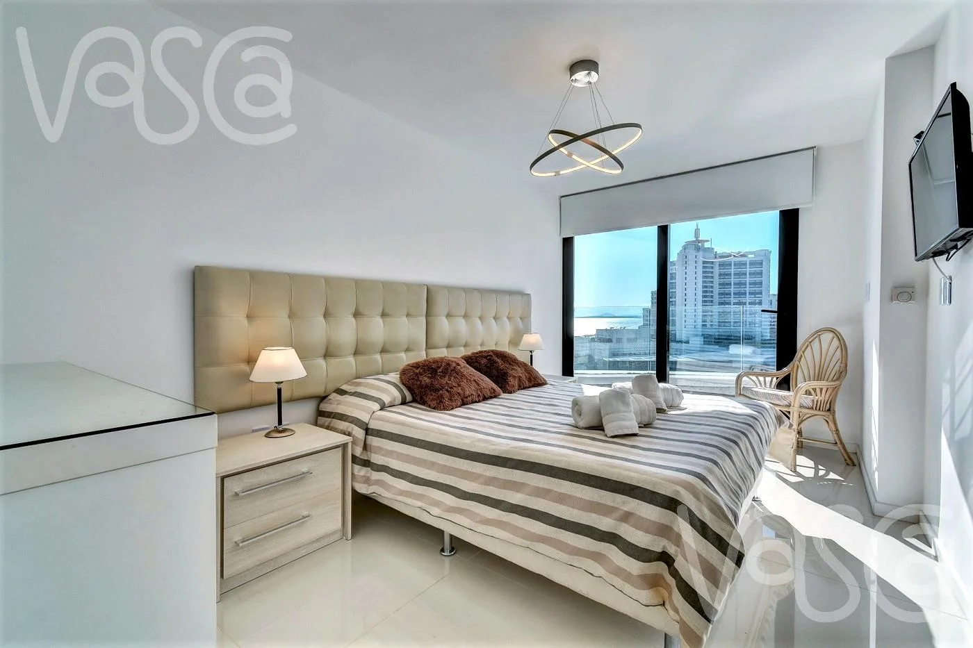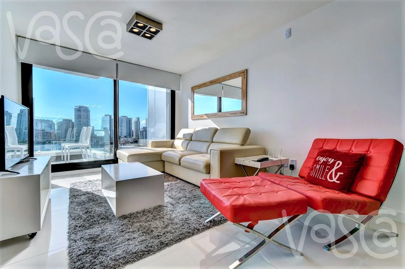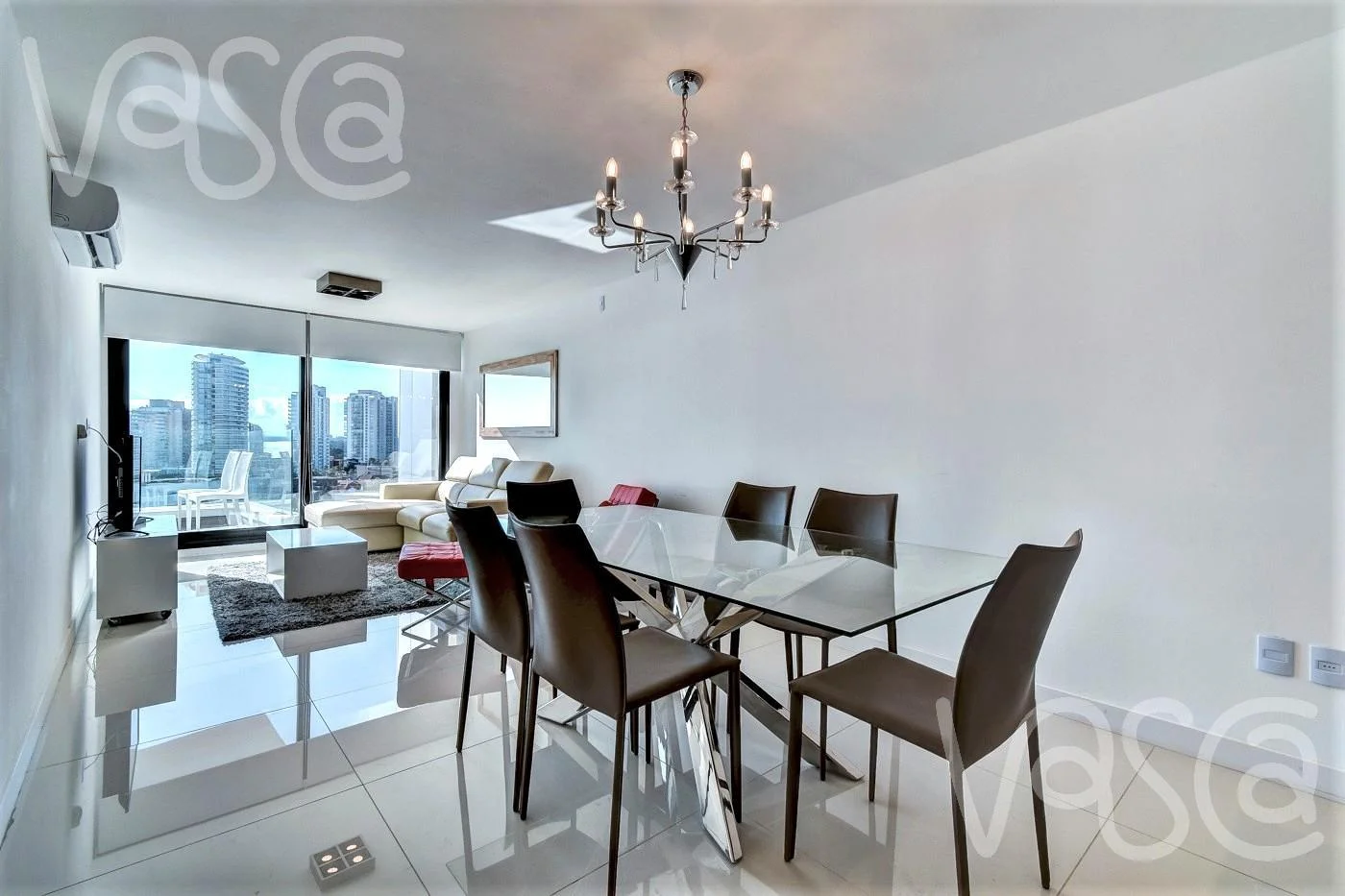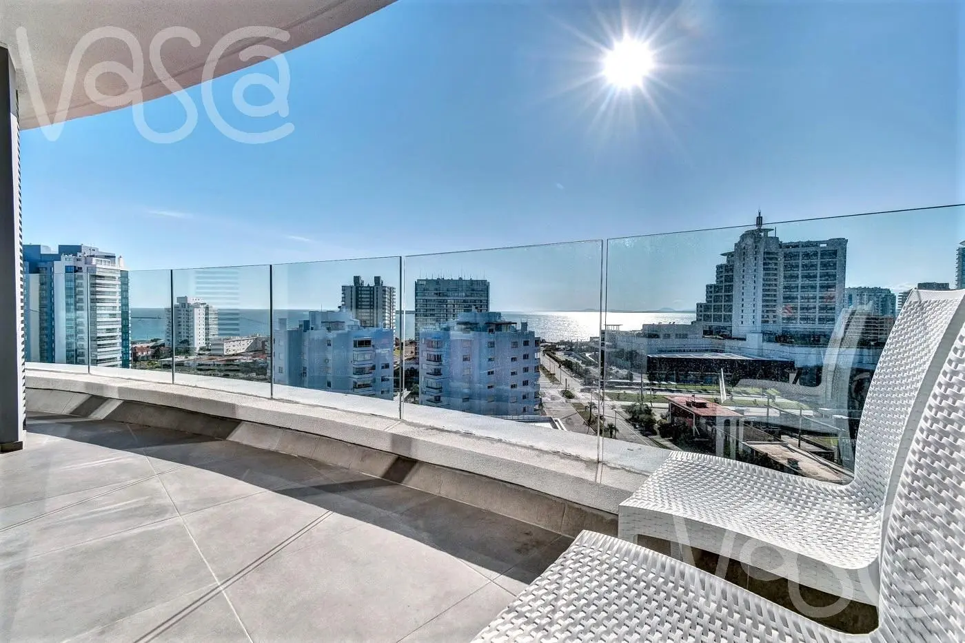Ubicado en un piso alto, con vista al mar se encuentra este apartamento en excelentes condiciones. Dos dormitorios, el principal en suite y con vestidor, y con amplios ventanales que permiten salir al balcón desde todos los ambientes. Living comedor con cocina integrada, área de lavadero y balcón que bordea todo el depto.