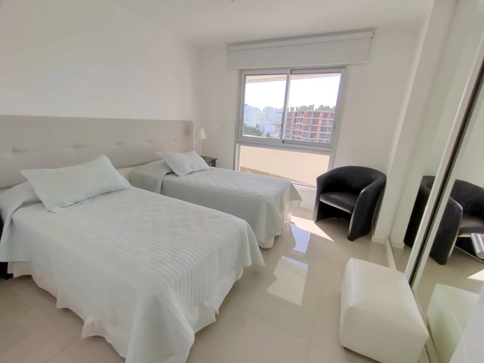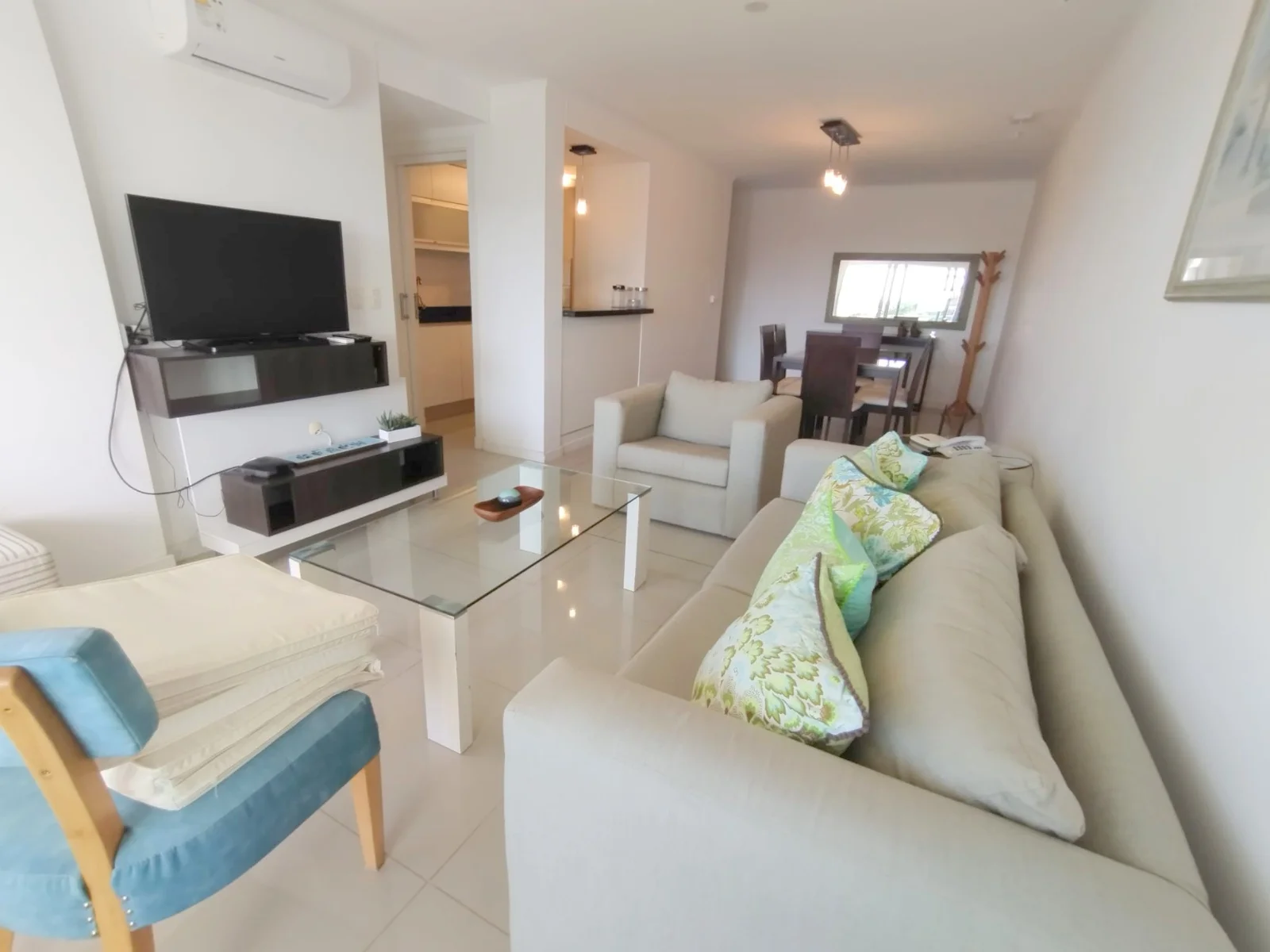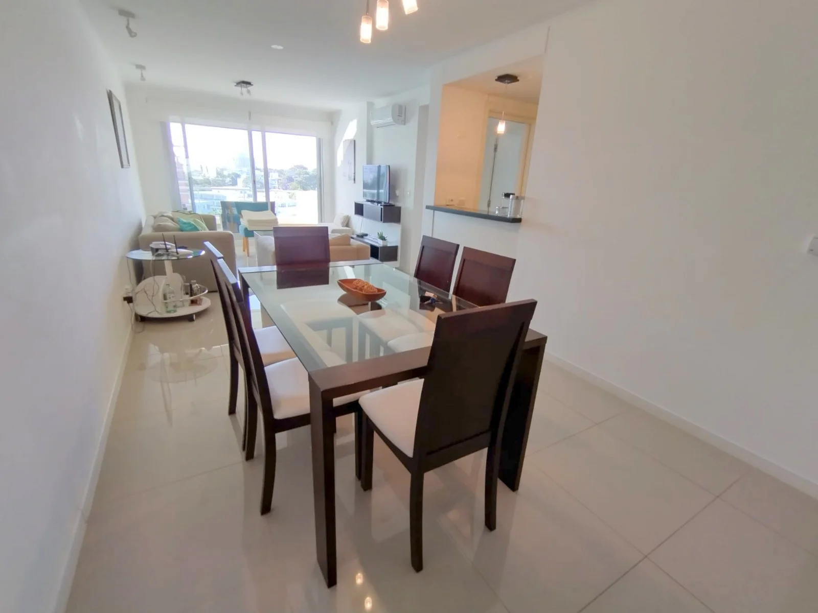 El apartamento cuenta con 3 ambientes distribuidos en 2 dormitorios, 2 baños, una cocina completamente equipada y un living comedor que se extiende hacia un balcón privado. Entre sus características destacan WiFi, placards, lavadero, aire acondicionado y la posibilidad de tener teléfono e internet. Además, admite mascotas, lo que lo hace perfecto para familias con animales.