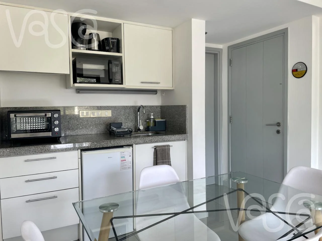 El apartamento está equipado con TV Smart de 43”, cortinas blackout en living-comedor y dormitorio, aire acondicionado en el área social, y una cocina completa con todo lo necesario para pasar una gran estadia.