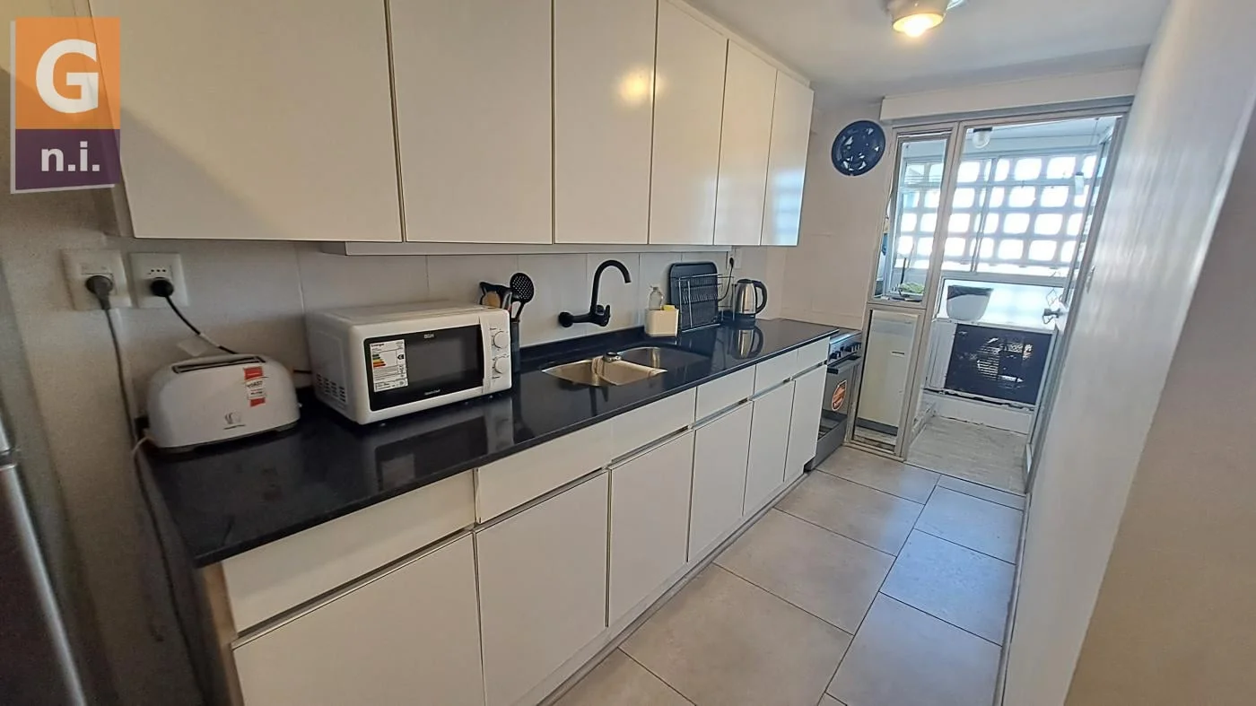 La unidad cuenta con amplio living, comedor, cocina definida, dos dormitorios, dos baños (uno en suite), dependencia de servicio con baño, balcón con cerramiento y cochera techada.