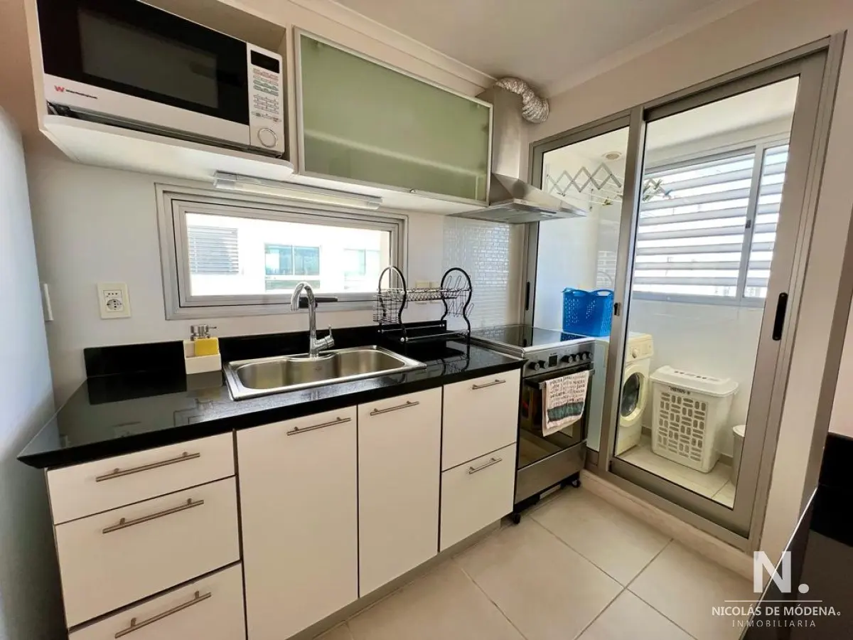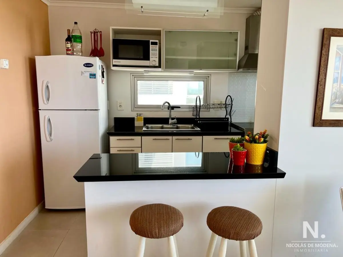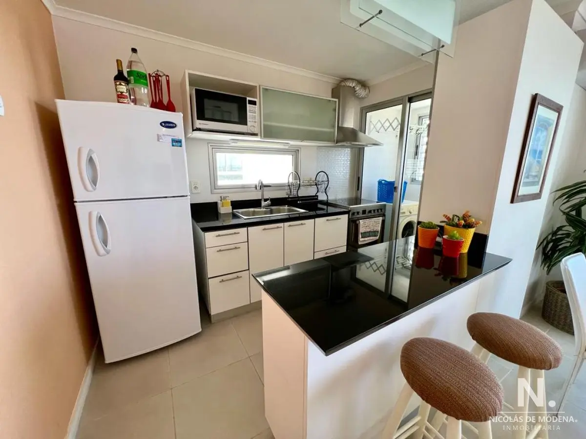 Este apartamento consta de un dormitorio y un baño, con capacidad para tres personas y dos camas disponibles. La cocina está equipada con anafe, microondas, lavarropas, heladera, campana y horno. El área de estar incluye una zona de living comedor, ofreciendo diferentes espacios para relajarse y socializar. Entre los equipamientos del apartamento se encuentran el aire acondicionado, televisión, placard en el dormitorio y en la cocina, lo que contribuye al orden y almacenamiento.