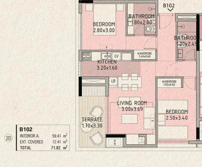 Apartamentos de 2 Dormitorios cuentan con living comedor, salida a terraza y cocina semi-integrada. Dos dormitorios, el principal en suite y un baño completo con posibilidad de hacerlo en suite también.