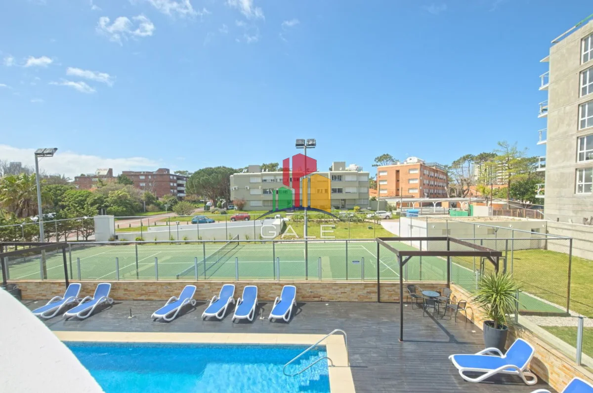 Piscina climatizada cerrada, piscina exterior, cancha de tenis, área de juegos infantiles al aire libre, sala de juegos, cine, gimnasio, sauna, 2 barbacoas cerradas, salón para eventos, lavandería, servicio de playa en Parada 5 de Playa Mansa, portería y seguridad 24 horas.