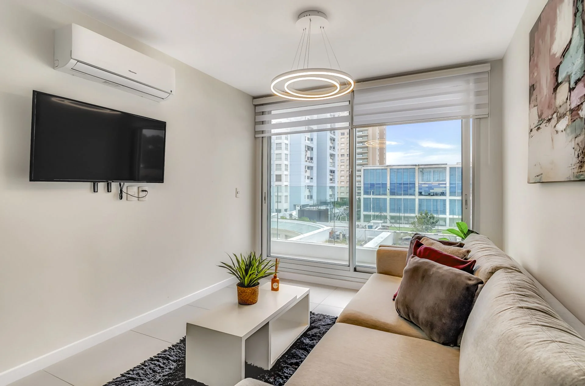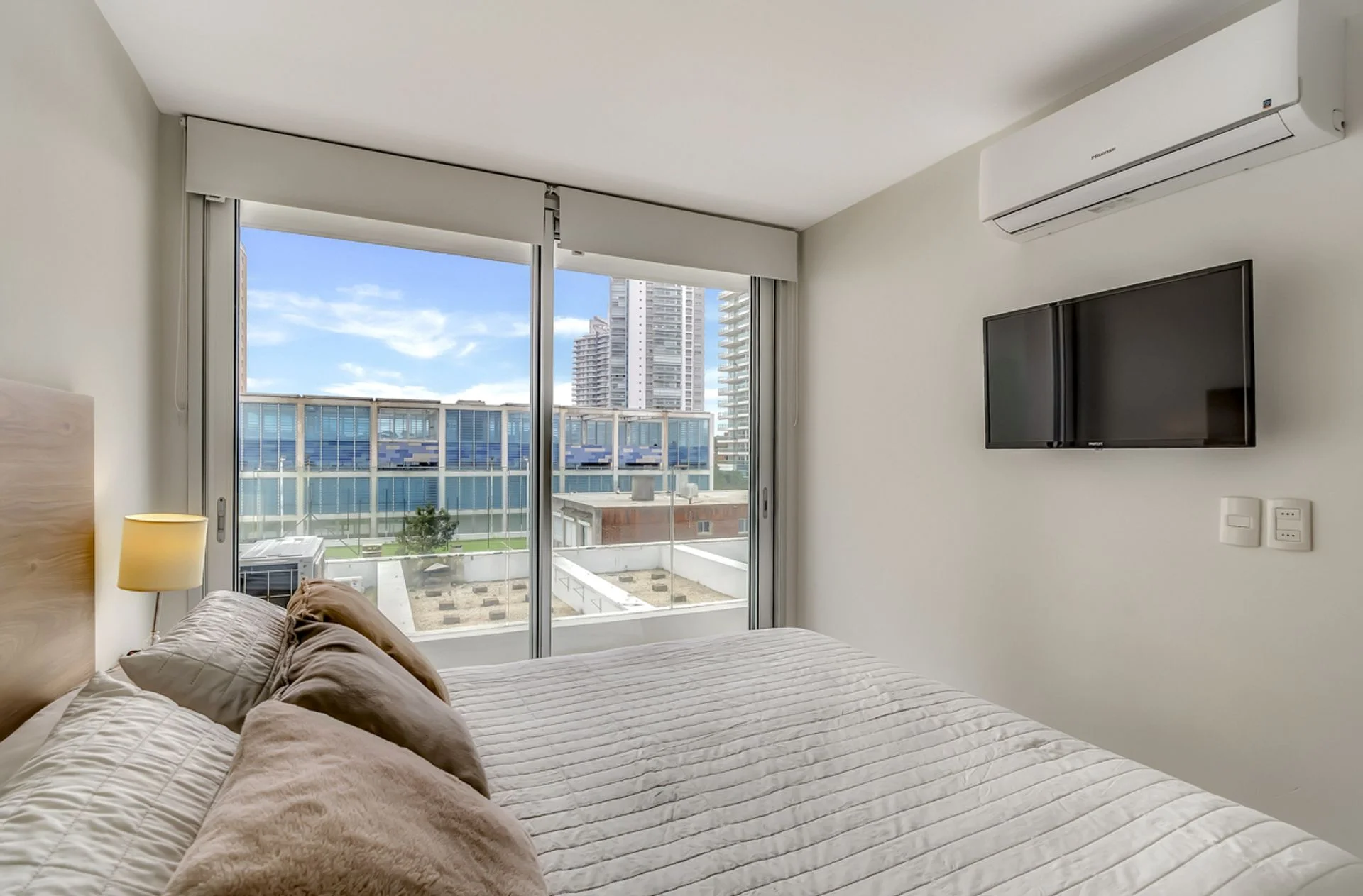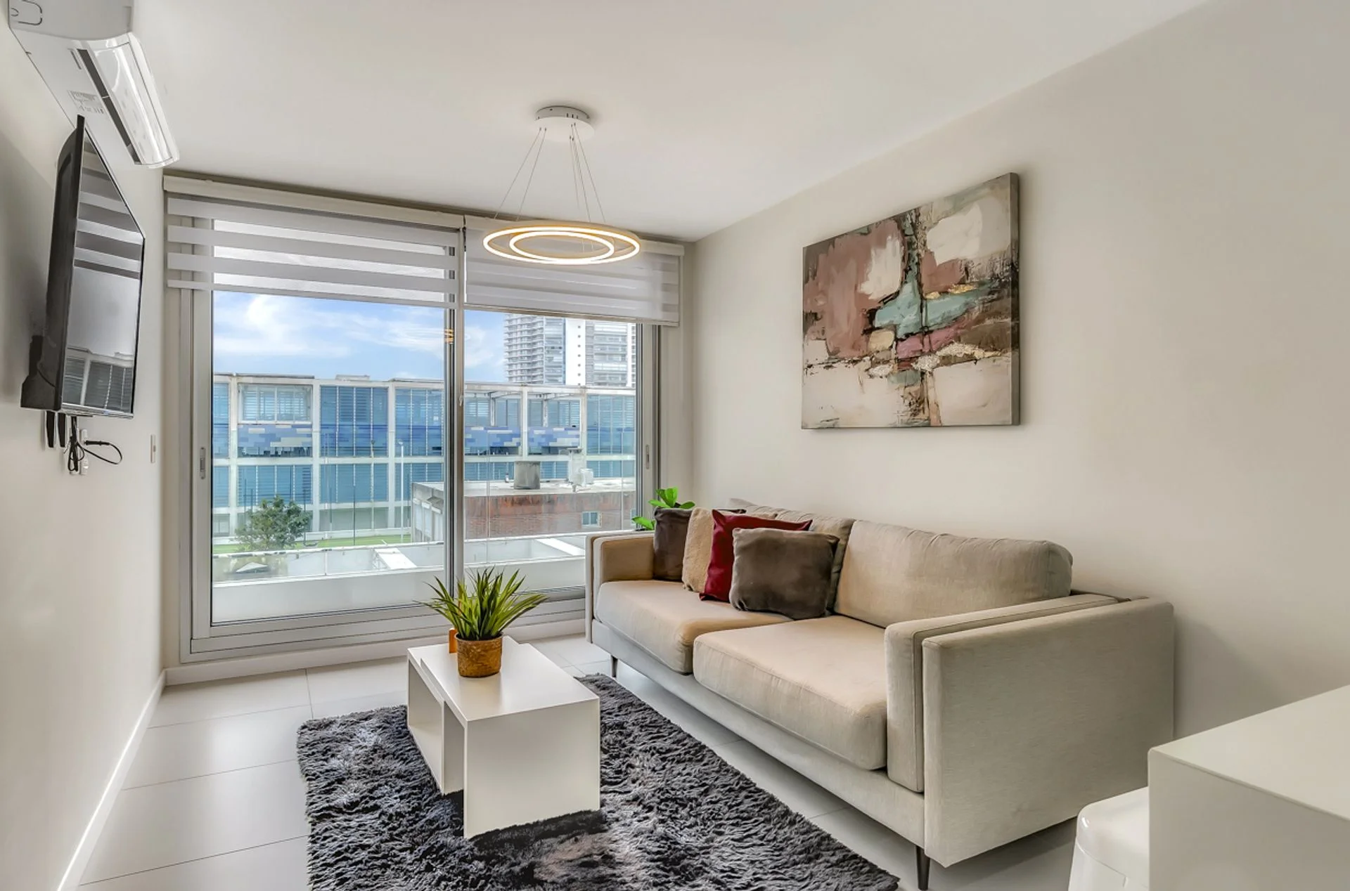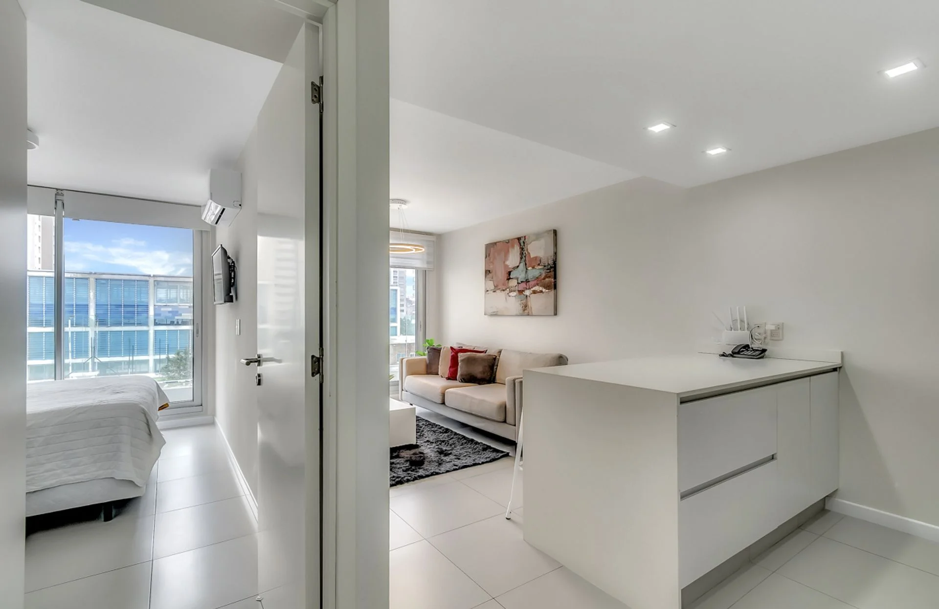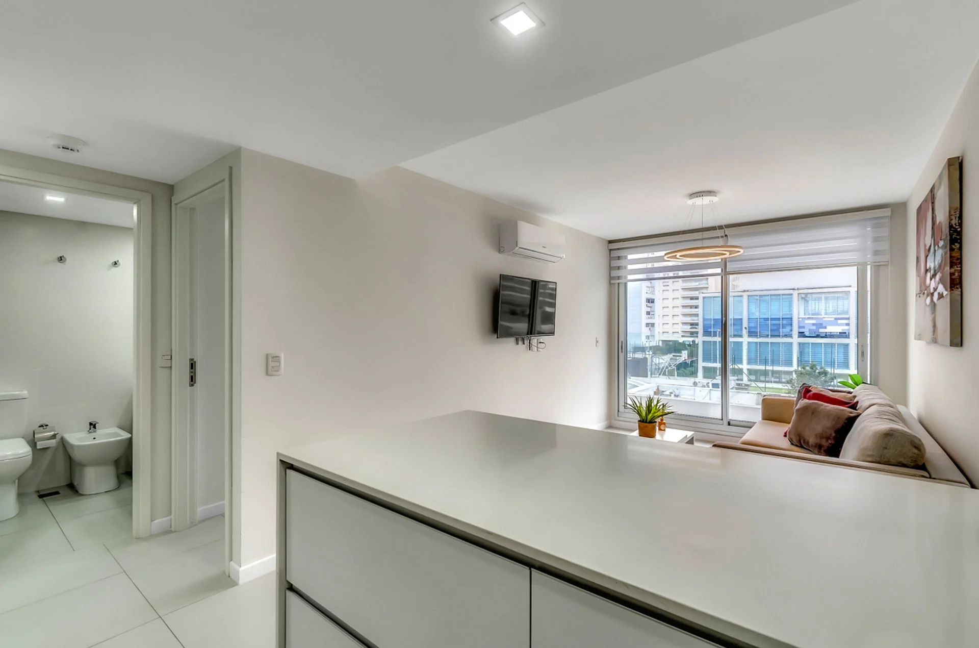 Se distribuye en una planta, living-comedor con amplios ventanales con salida a terraza. Cocina americana integrada con barra desayunadora. Un dormitorio con salida al balcón. Baño. Todos los ambientes poseen aire acondicionado frio calor. Tiene garage y baulera.