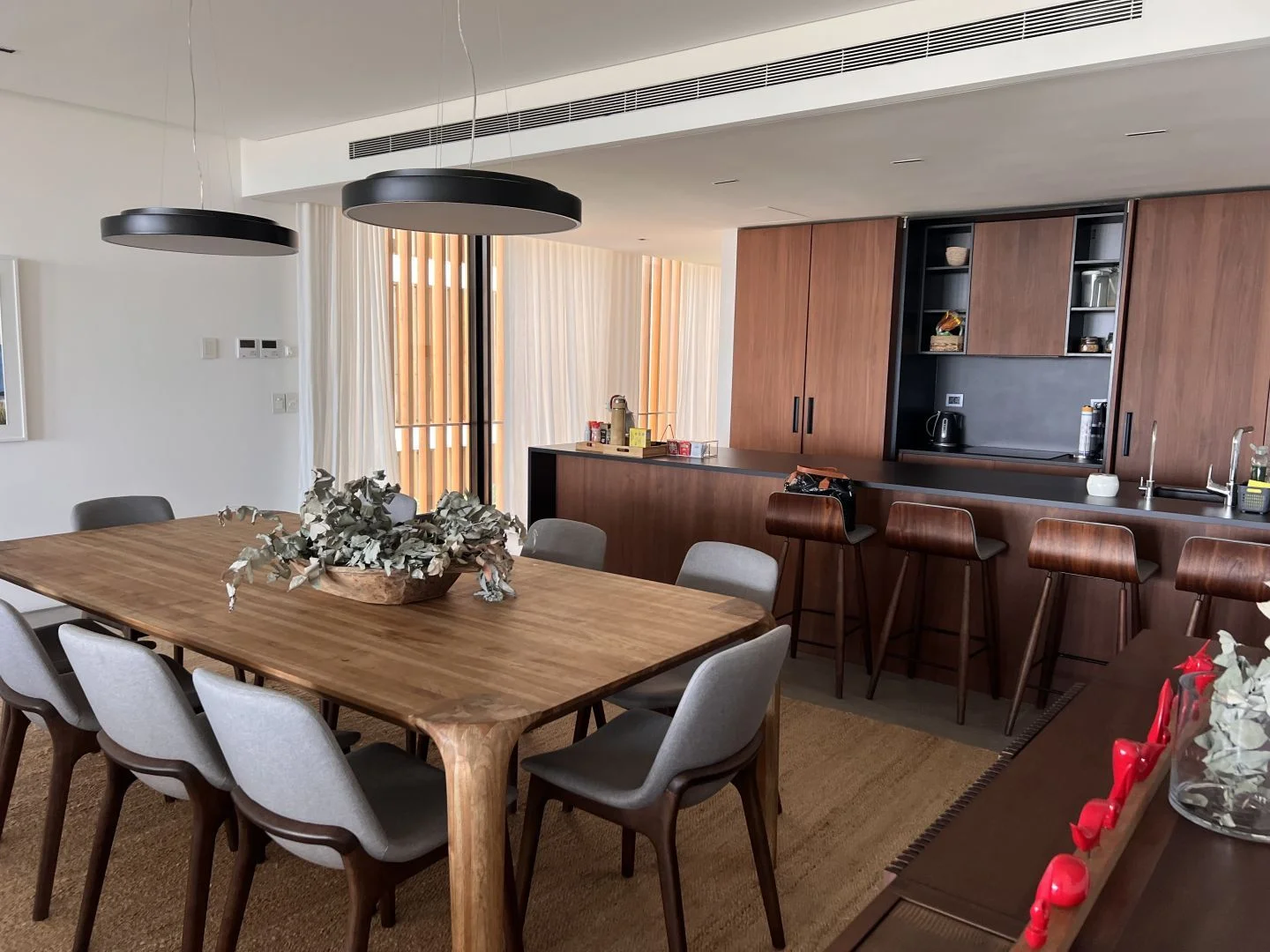 Sus espectaculares líneas rectas, volumenes, bloques y materiales conjugan una excelente armonía. Los elegidos para las terminaciones exteriores fueron el hormigón a la vista, la madera y la piedra local, además de sus terrazas vidriadas.