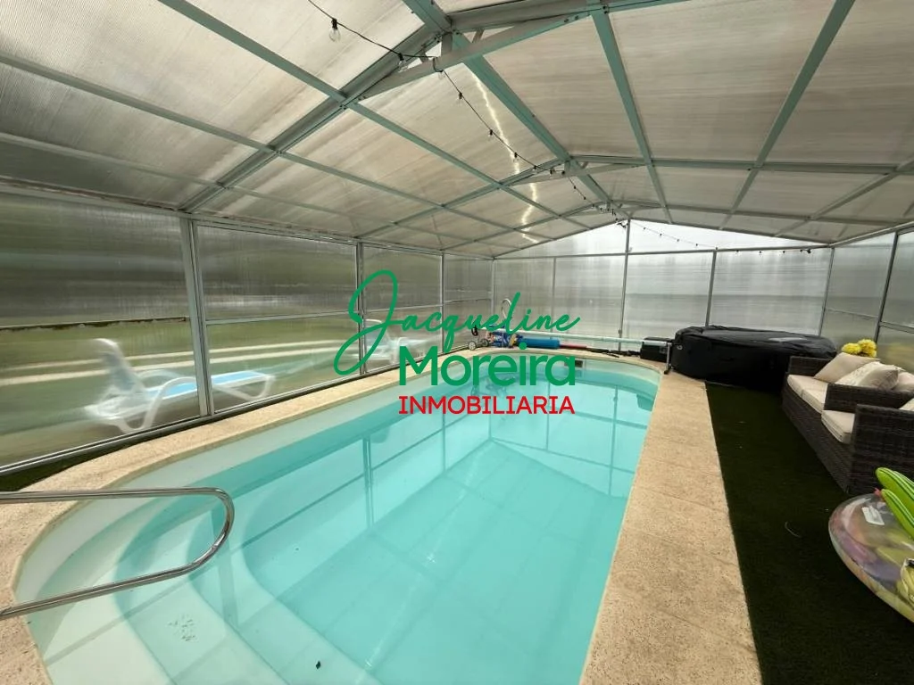 Destaca la piscina totalmente cerrada, en estructura de policarbonato y aluminio pero con posibilidad de abrir puertas en verano, con bomba de calor y jacuzzi.