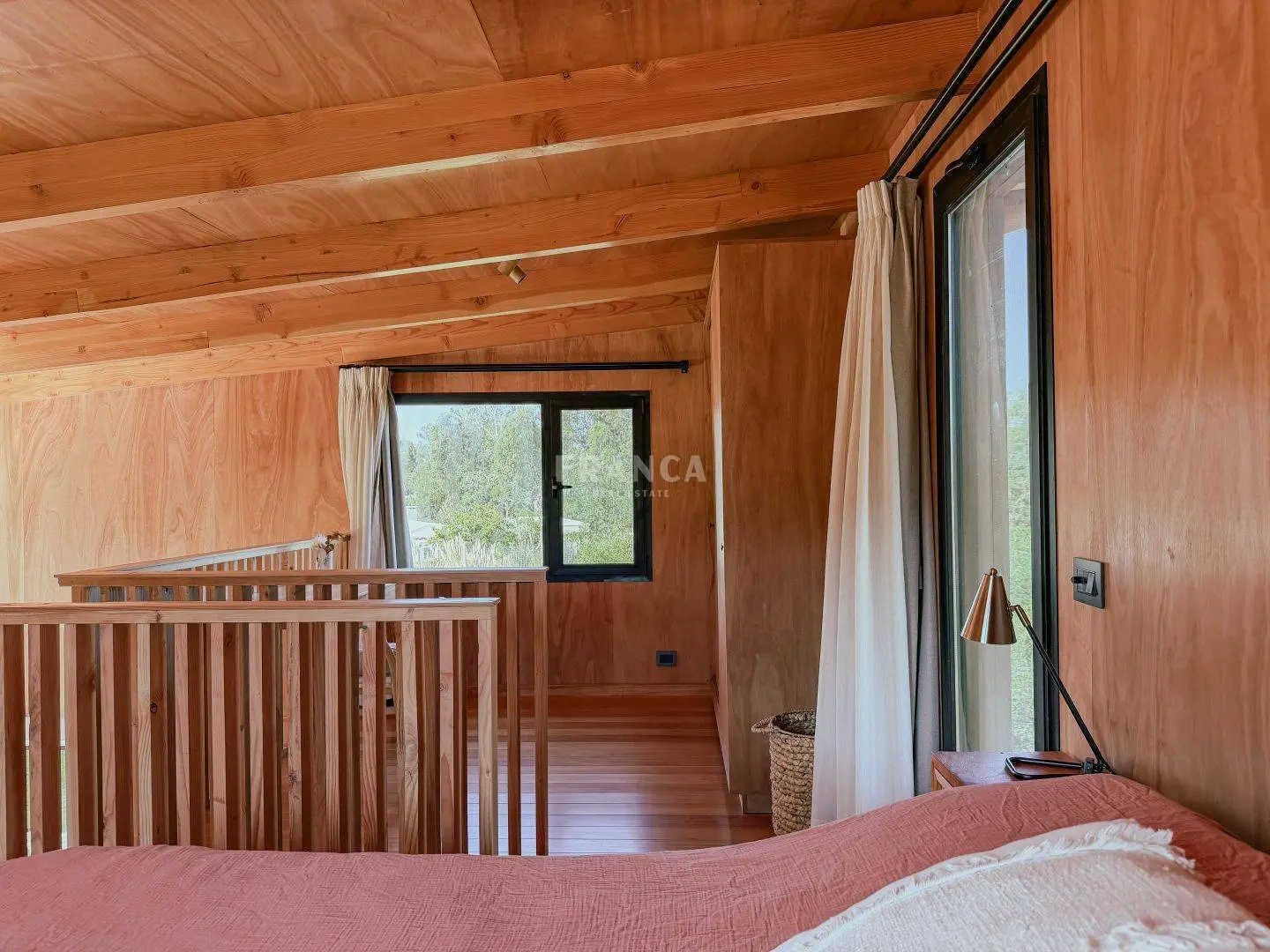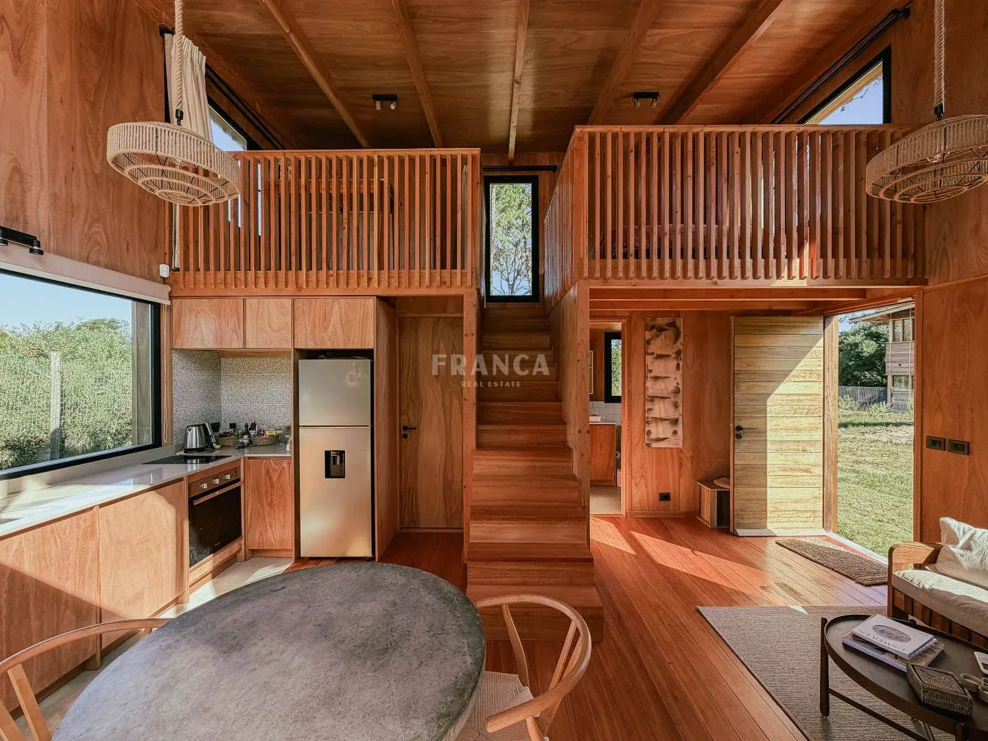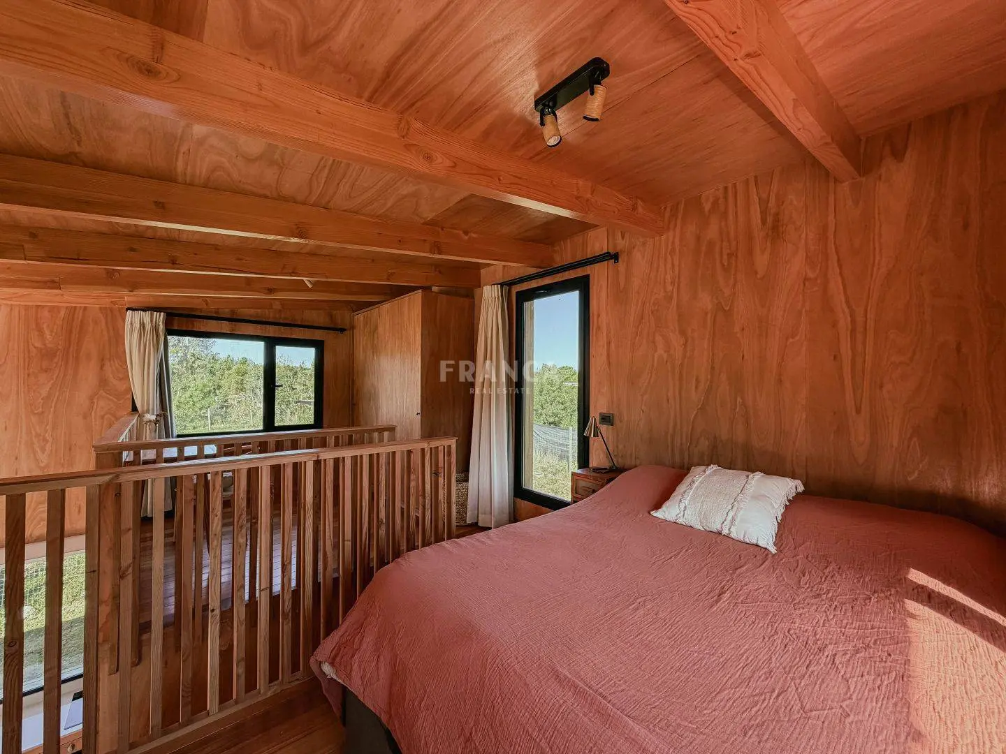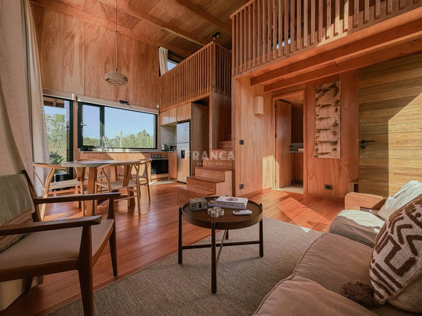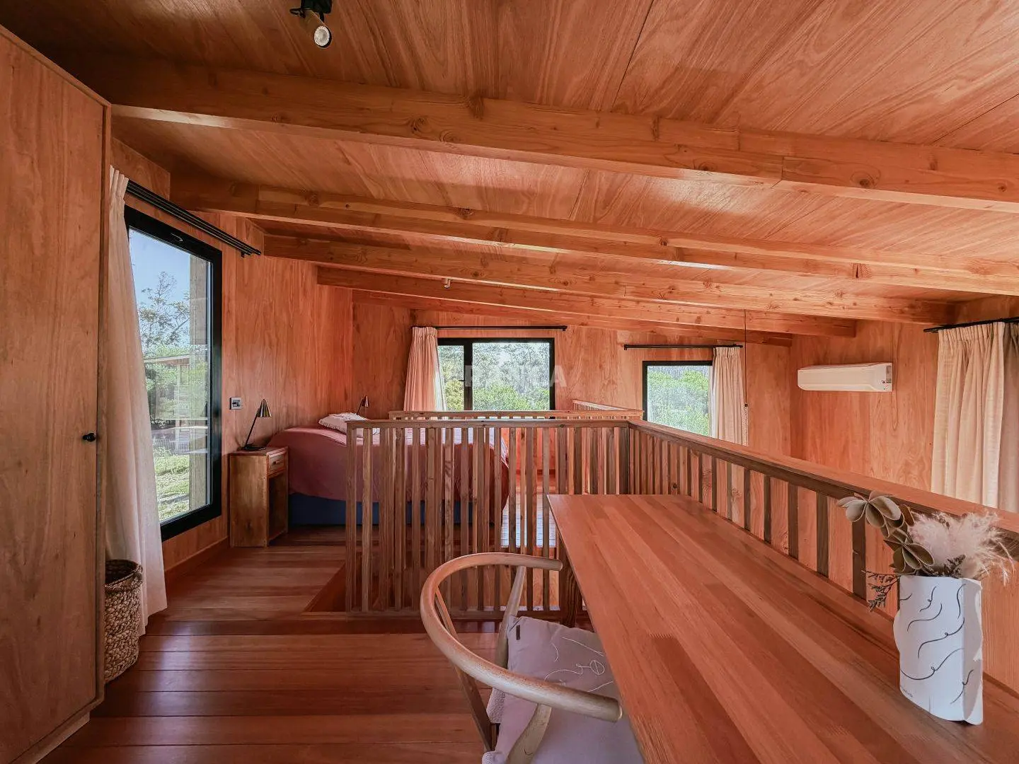 Moderna propiedad de madera muy cálida ubicada en zona residencial en cercanías de Barra Verde. Cuenta con un excelente diseño constructivo con materiales de calidad. Se distribuye en dos plantas, en planta baja living comedor muy luminoso y cálido, además un dormitorio definido con una cama simple y escritorio. En un altillo subiendo por una cómoda escalera se encuentra una cama doble. Para calefaccionar cuenta con un gran equipo de AC frio calor y ademas una estufa a pellets.