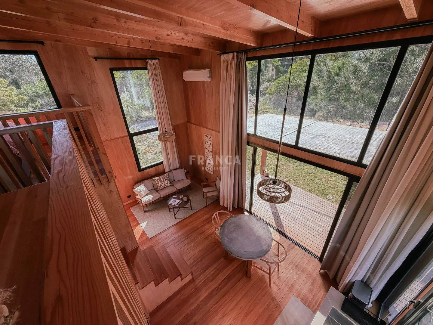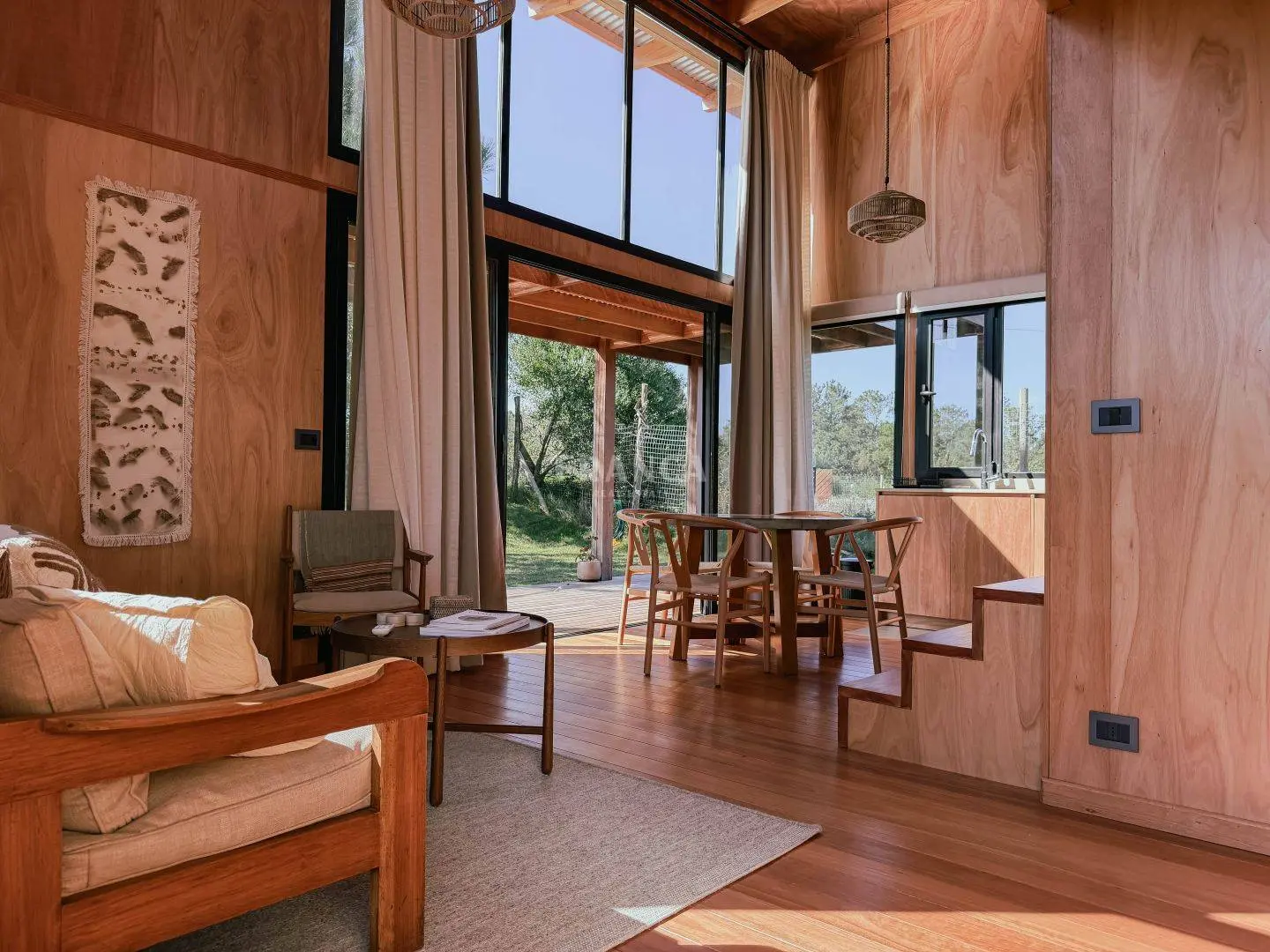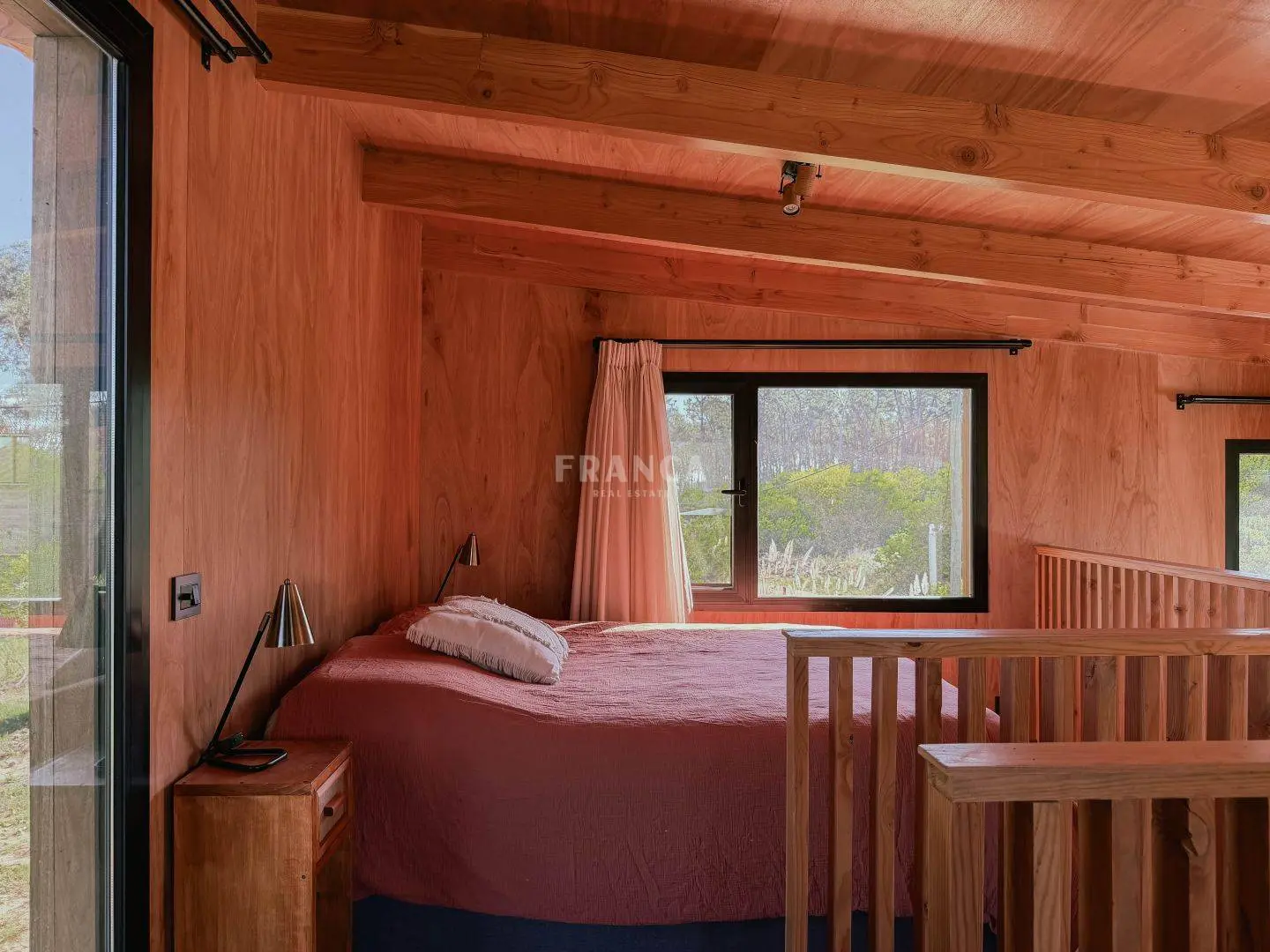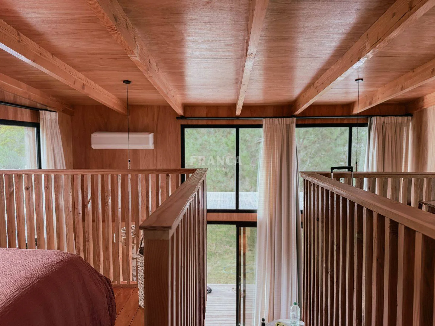 Moderna propiedad de madera muy cálida ubicada en zona residencial en cercanías de Barra Verde. Cuenta con un excelente diseño constructivo con materiales de calidad. Se distribuye en dos plantas, en planta baja living comedor muy luminoso y cálido, además un dormitorio definido con una cama simple y escritorio. En un altillo subiendo por una cómoda escalera se encuentra una cama doble. Para calefaccionar cuenta con un gran equipo de AC frio calor y ademas una estufa a pellets.