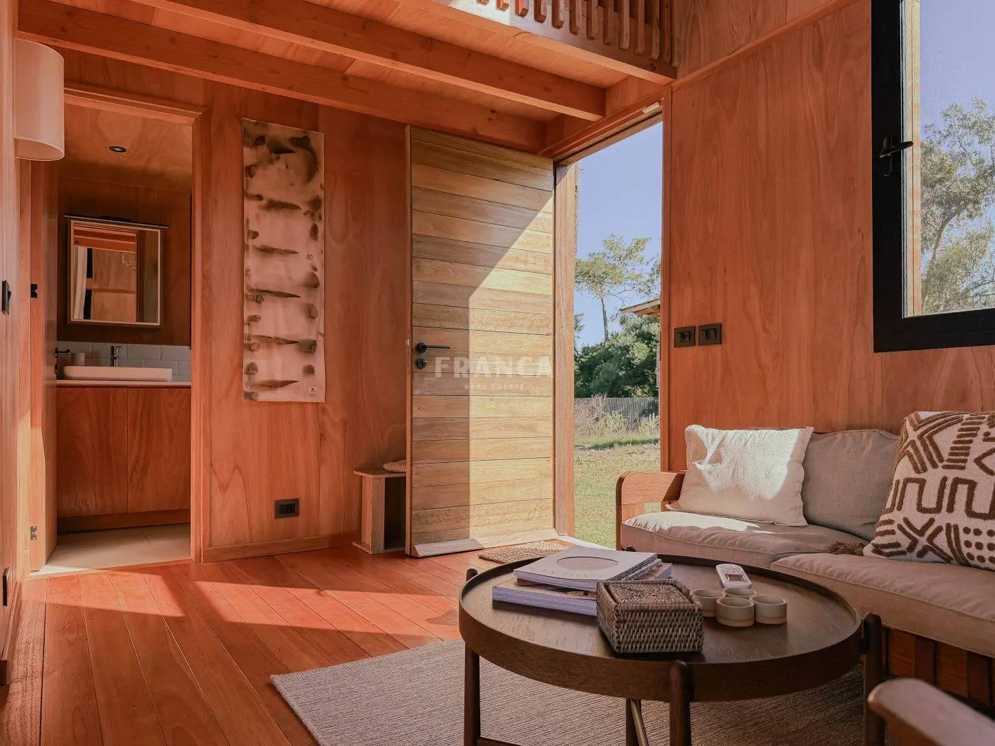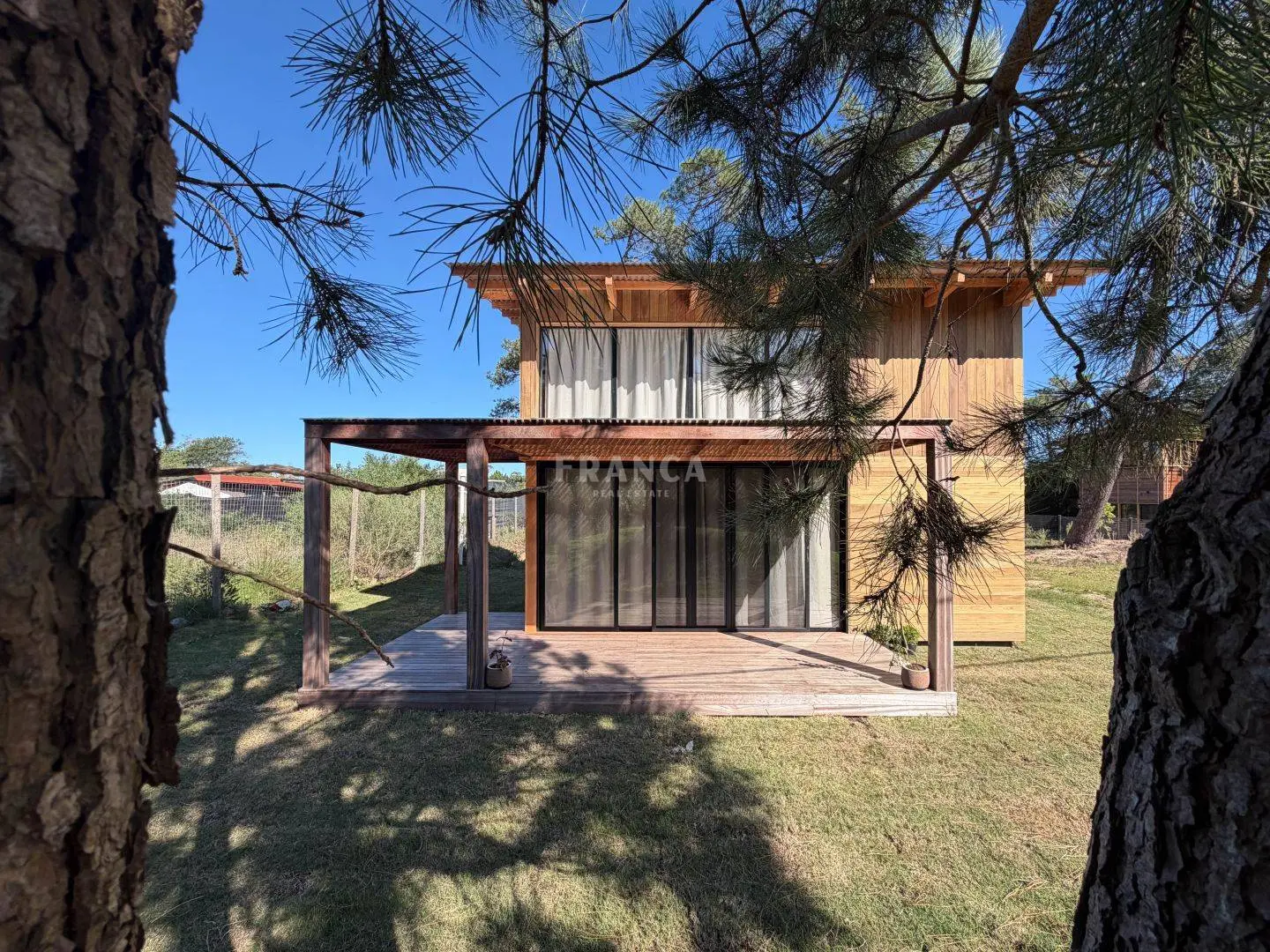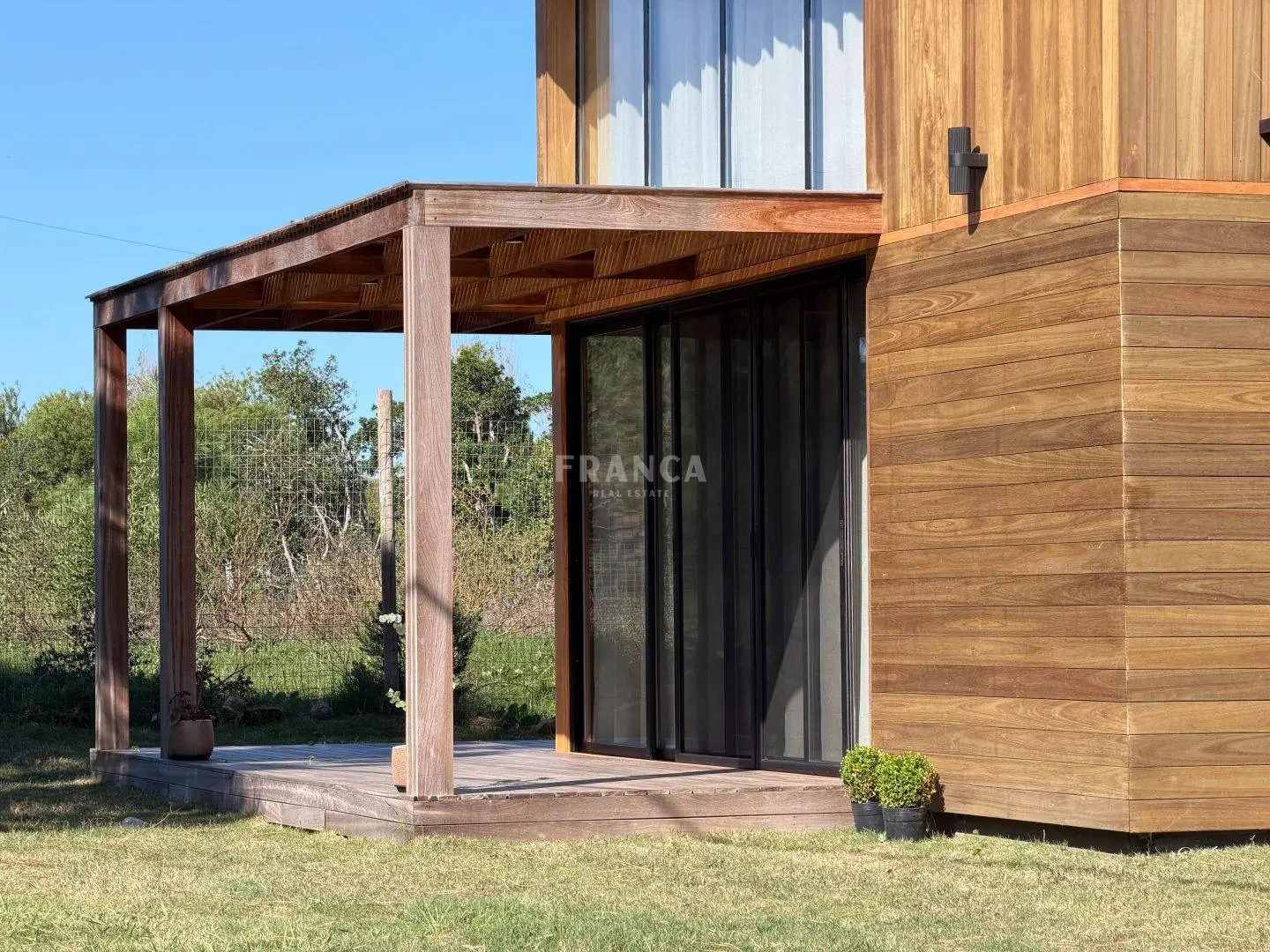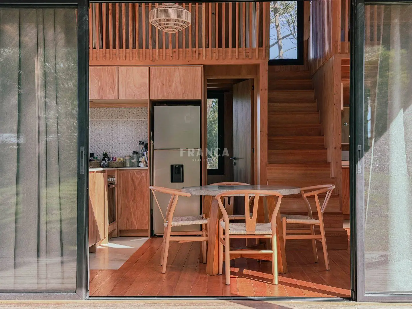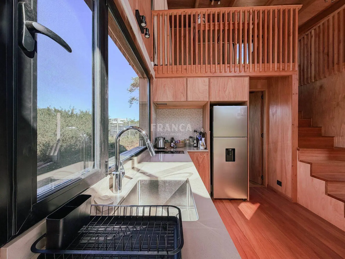 Moderna propiedad de madera muy cálida ubicada en zona residencial en cercanías de Barra Verde. Cuenta con un excelente diseño constructivo con materiales de calidad. Se distribuye en dos plantas, en planta baja living comedor muy luminoso y cálido, además un dormitorio definido con una cama simple y escritorio. En un altillo subiendo por una cómoda escalera se encuentra una cama doble. Para calefaccionar cuenta con un gran equipo de AC frio calor y ademas una estufa a pellets.