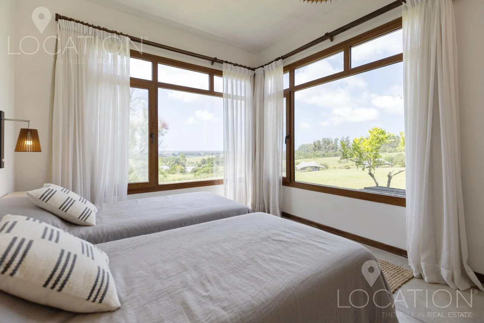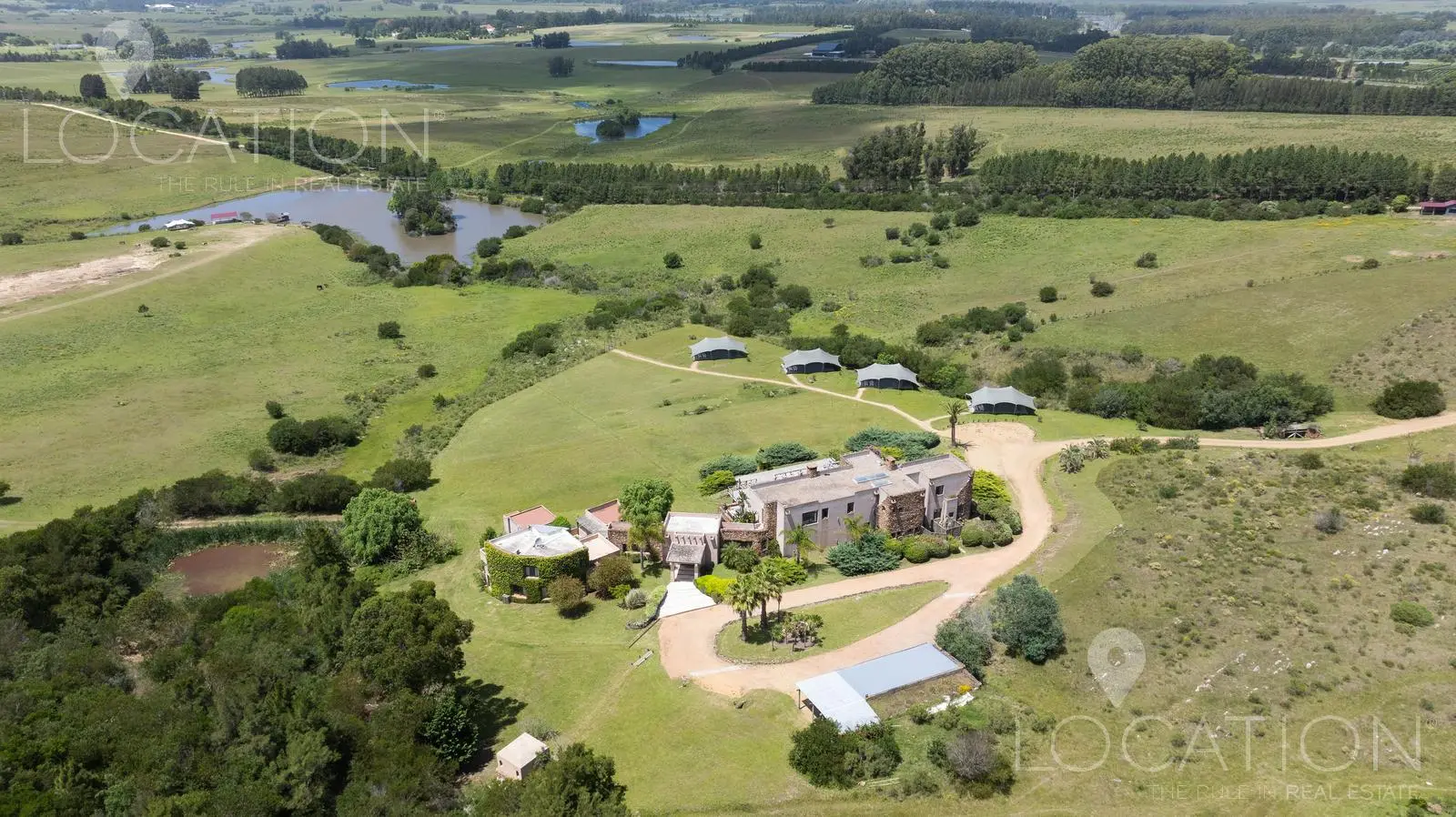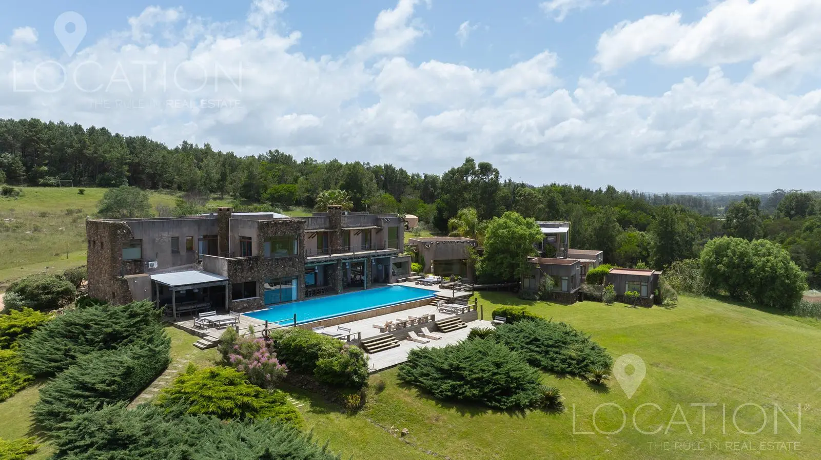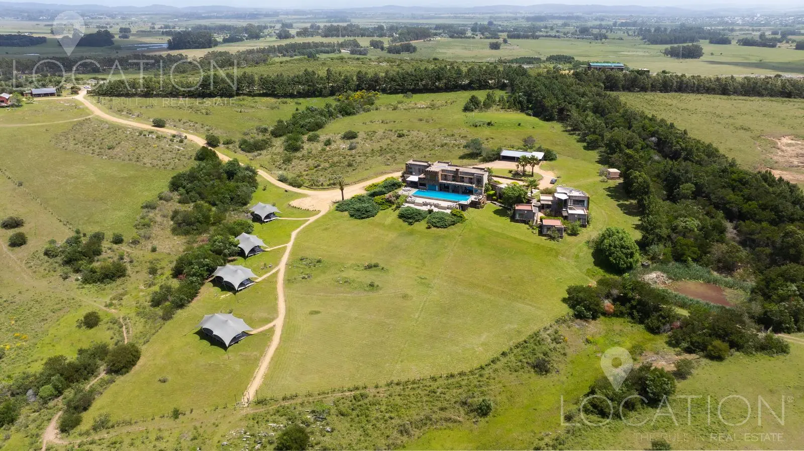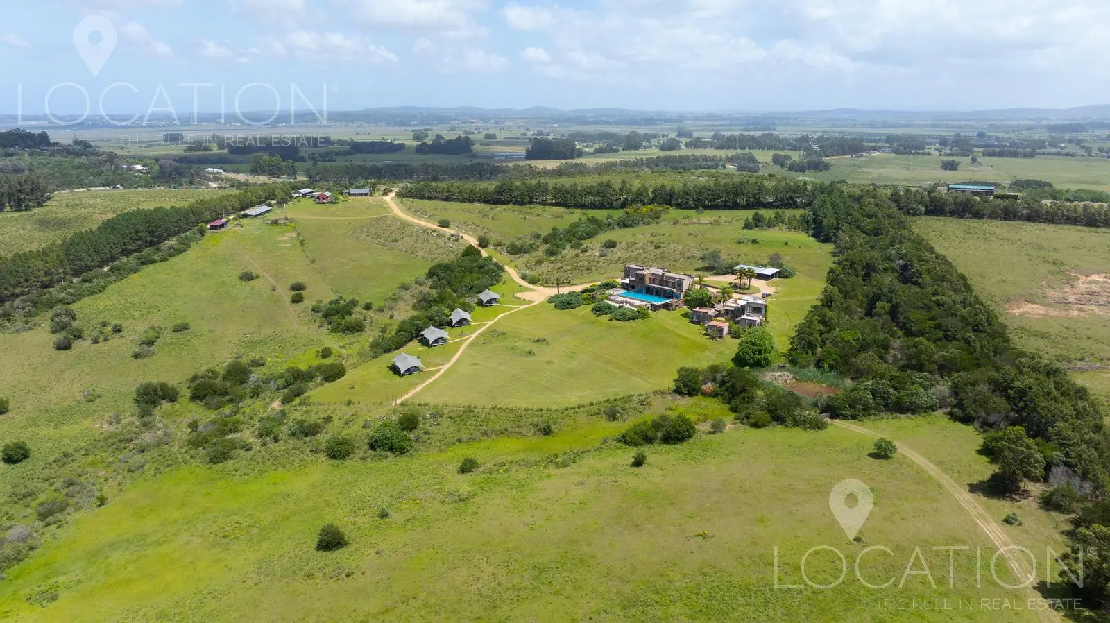 Espectacular casa en chacra de 20 hectáreas, ubicada en Camino Eguzquiza, La Barra. Cuenta con 9 habitaciones en suite, cada una de ellas con aire acondicionado y frigobar. También cuenta con 4 glampings casa uno con cama matrimonial. En la casa principal se encuentran las 9 habitaciones (una de ellas cuenta con sauna), un espacio para gym, living, comedor y cocina definica. En el exterior cuenta con una gran piscina, galería y parrillero. Tiene lago propio con una isla y cuenta con caballos y además un fogón. Capacidad para 26 personas