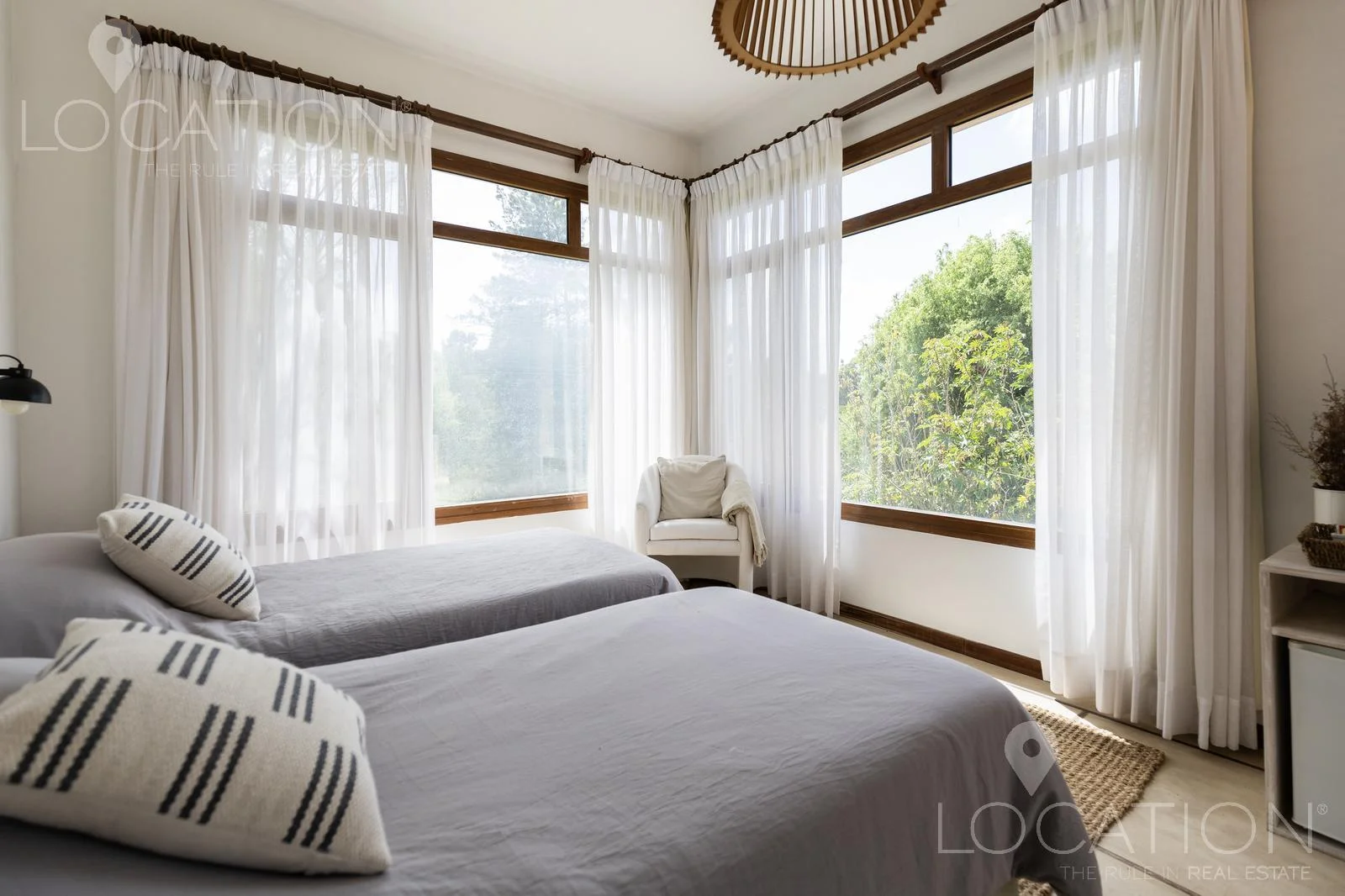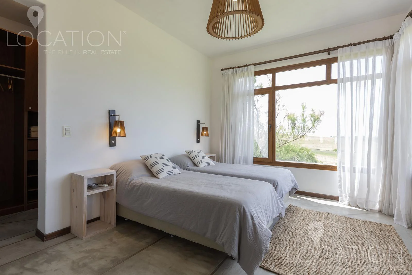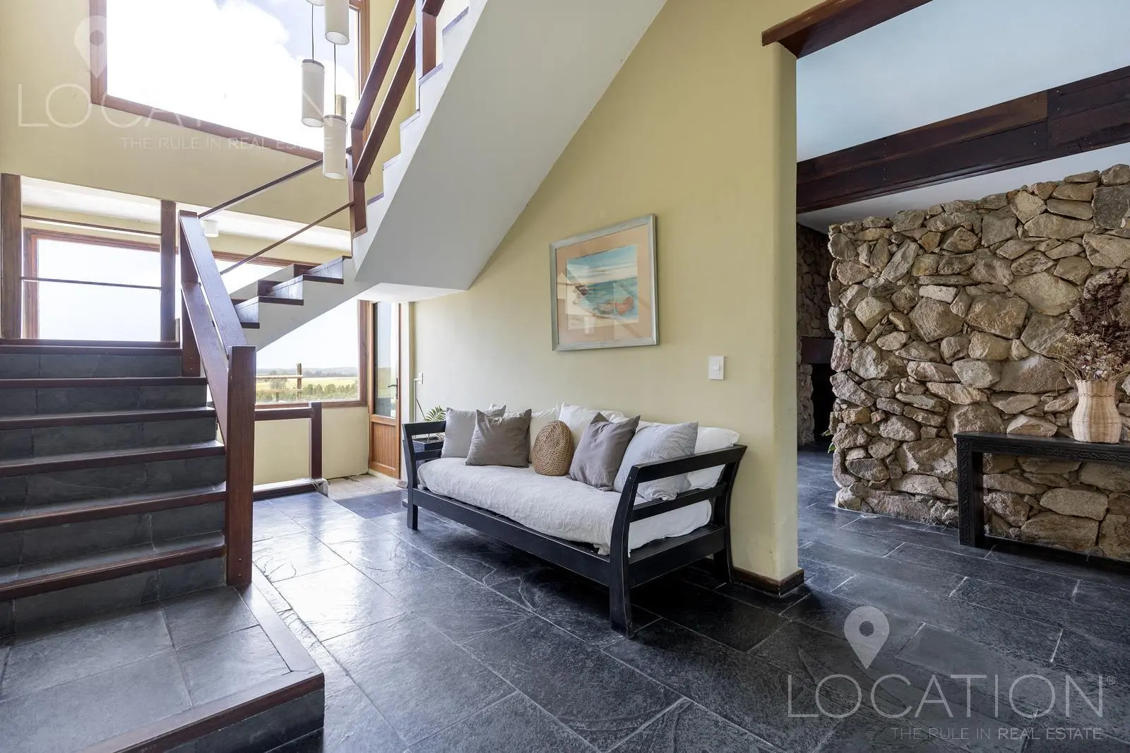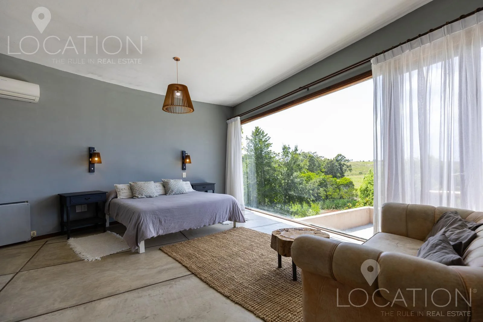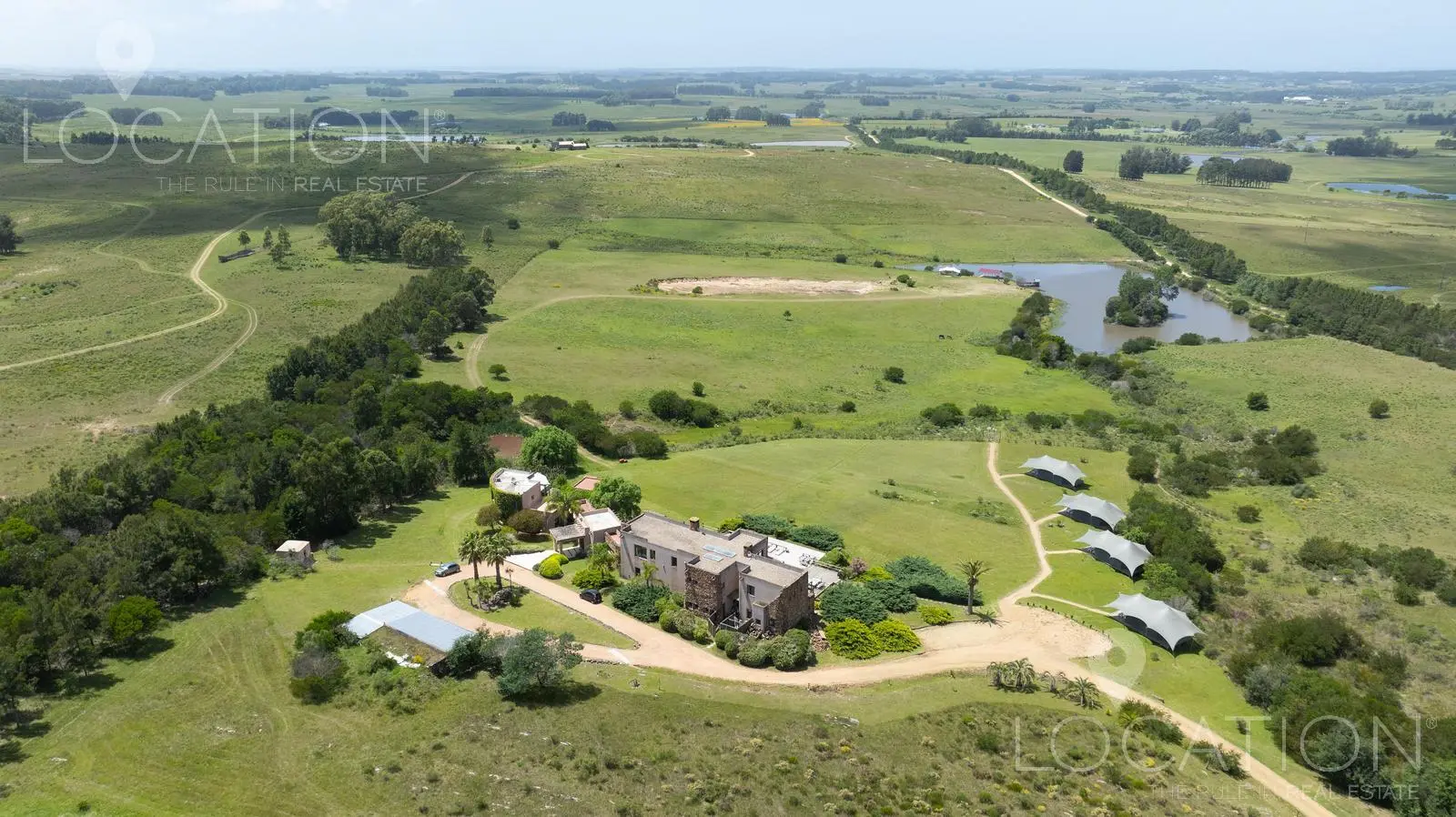 Espectacular casa en chacra de 20 hectáreas, ubicada en Camino Eguzquiza, La Barra. Cuenta con 9 habitaciones en suite, cada una de ellas con aire acondicionado y frigobar. También cuenta con 4 glampings casa uno con cama matrimonial. En la casa principal se encuentran las 9 habitaciones (una de ellas cuenta con sauna), un espacio para gym, living, comedor y cocina definica. En el exterior cuenta con una gran piscina, galería y parrillero. Tiene lago propio con una isla y cuenta con caballos y además un fogón. Capacidad para 26 personas