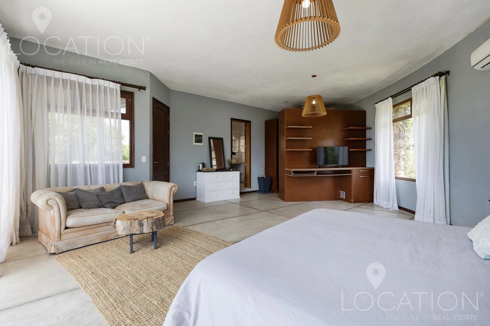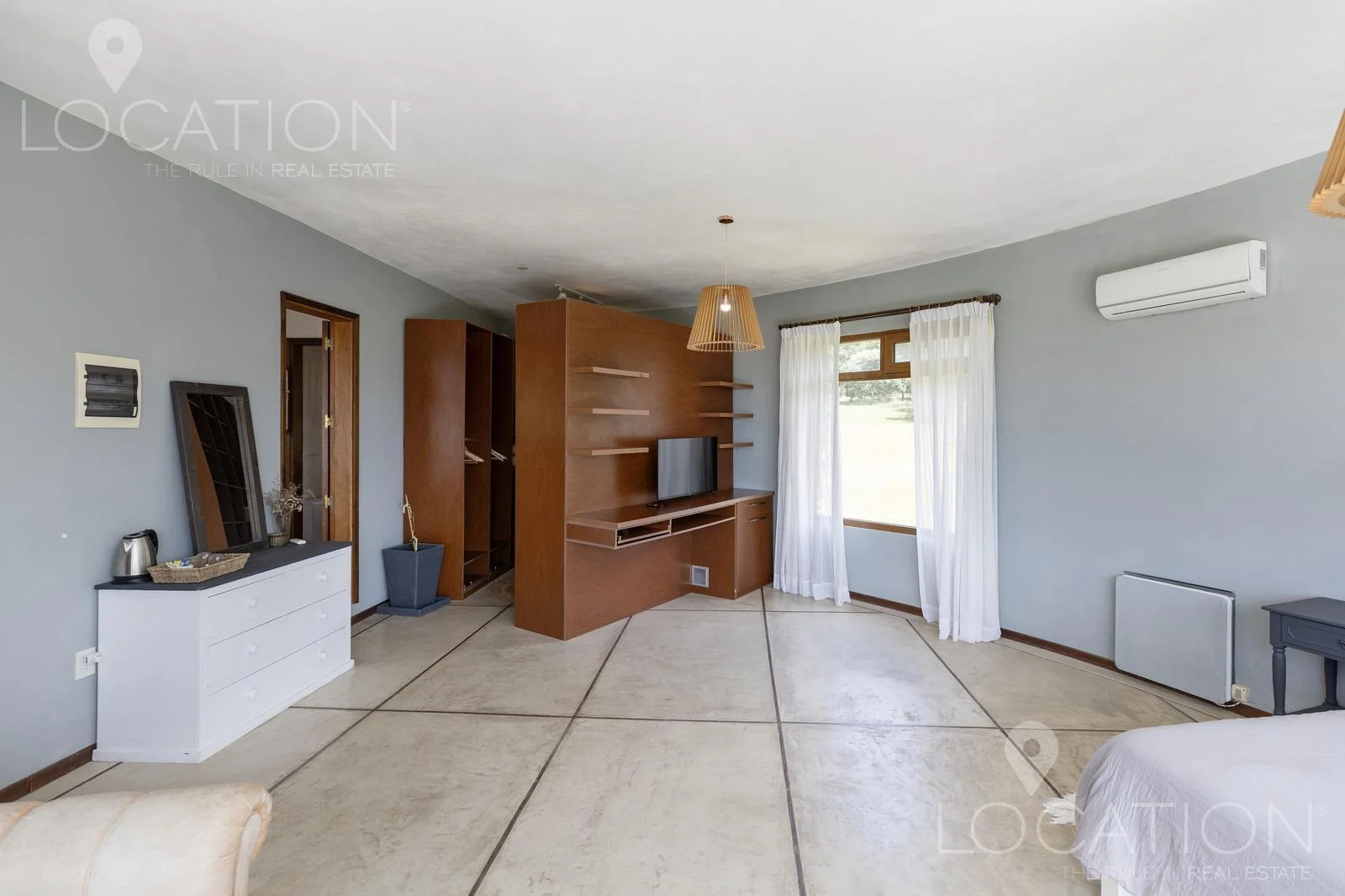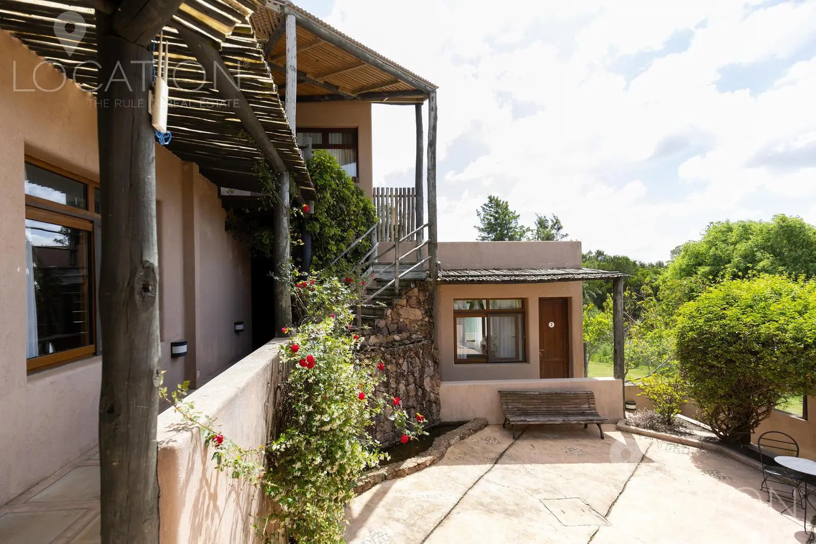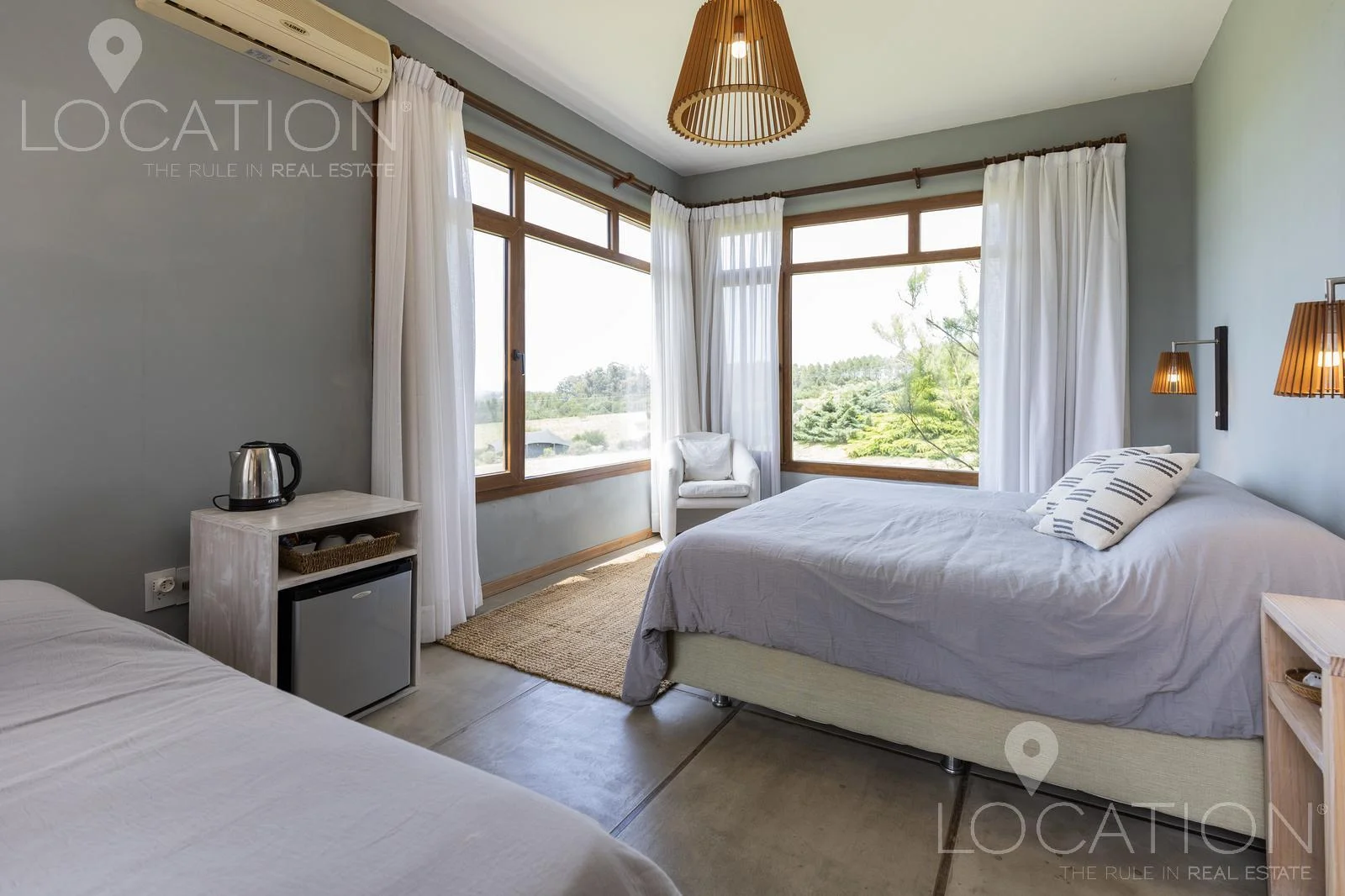 Espectacular casa en chacra de 20 hectáreas, ubicada en Camino Eguzquiza, La Barra. Cuenta con 9 habitaciones en suite, cada una de ellas con aire acondicionado y frigobar. También cuenta con 4 glampings casa uno con cama matrimonial. En la casa principal se encuentran las 9 habitaciones (una de ellas cuenta con sauna), un espacio para gym, living, comedor y cocina definica. En el exterior cuenta con una gran piscina, galería y parrillero. Tiene lago propio con una isla y cuenta con caballos y además un fogón. Capacidad para 26 personas