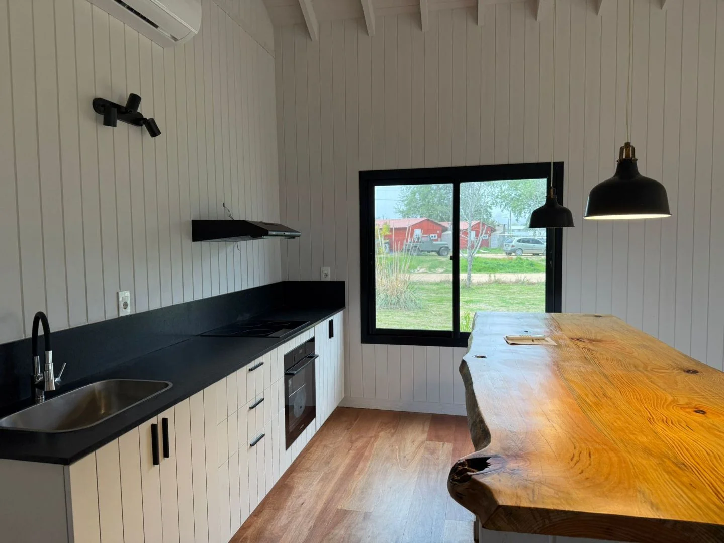 La cocina es moderna y funcional, con excelente capacidad de guardado y conexión directa con el área de servicio y lavadero.