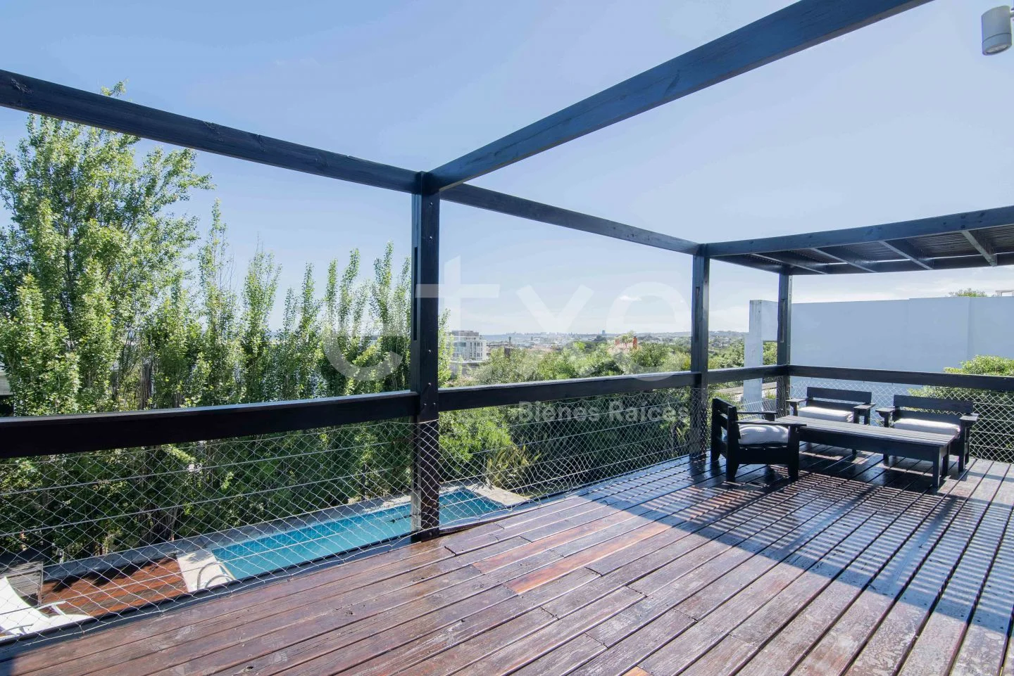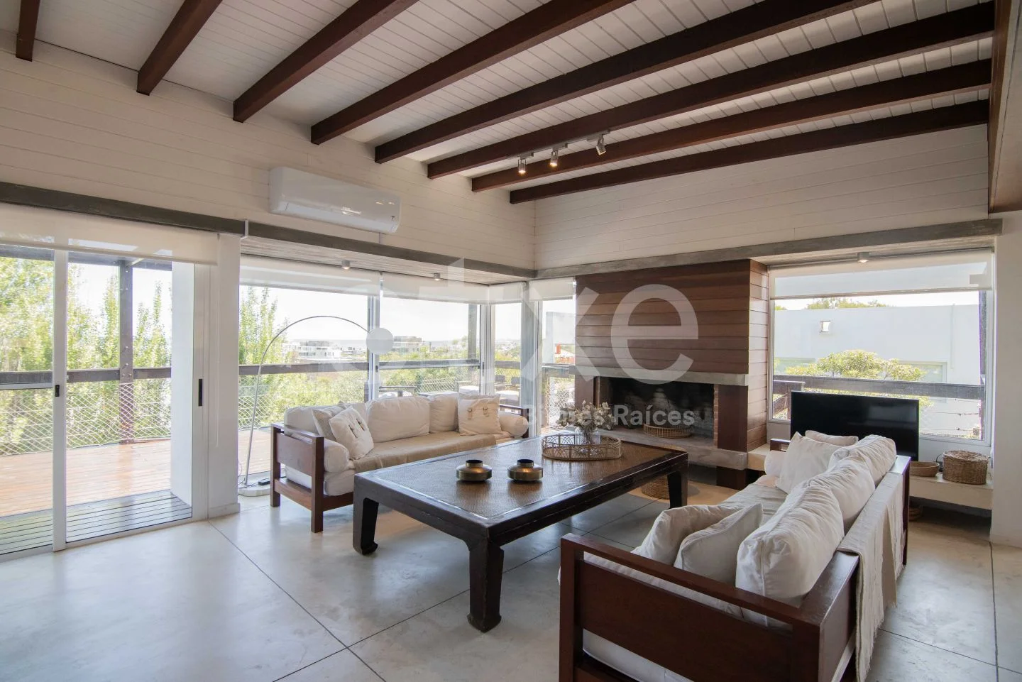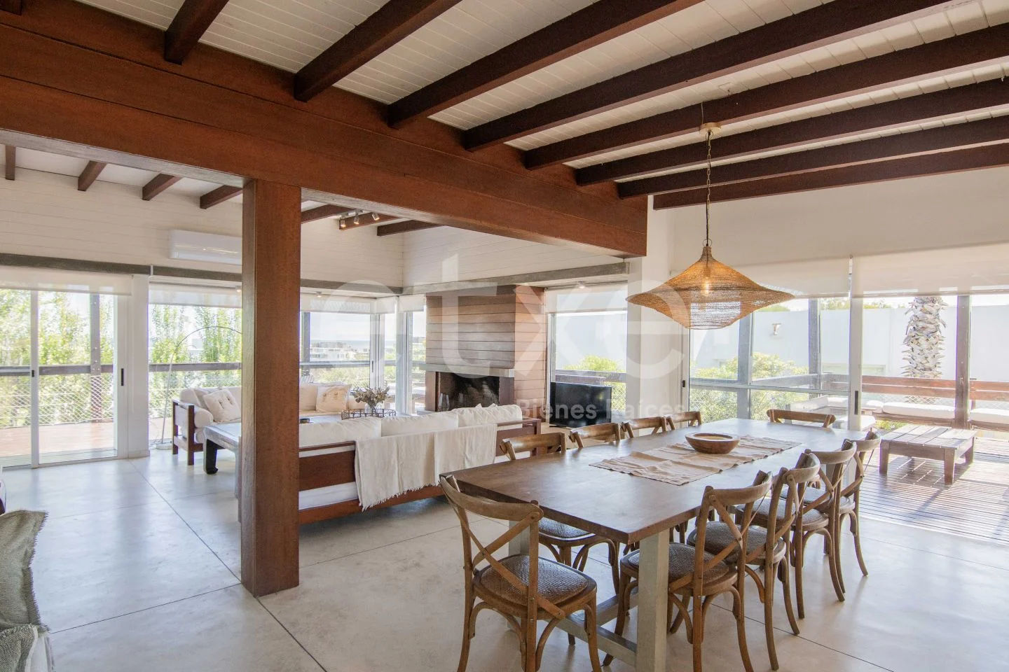 Living comedor con estufa a leña y cocina integrada con salida a enorme deck con parrillero.