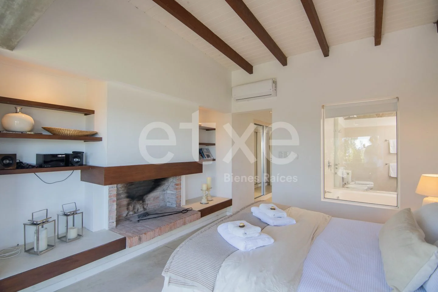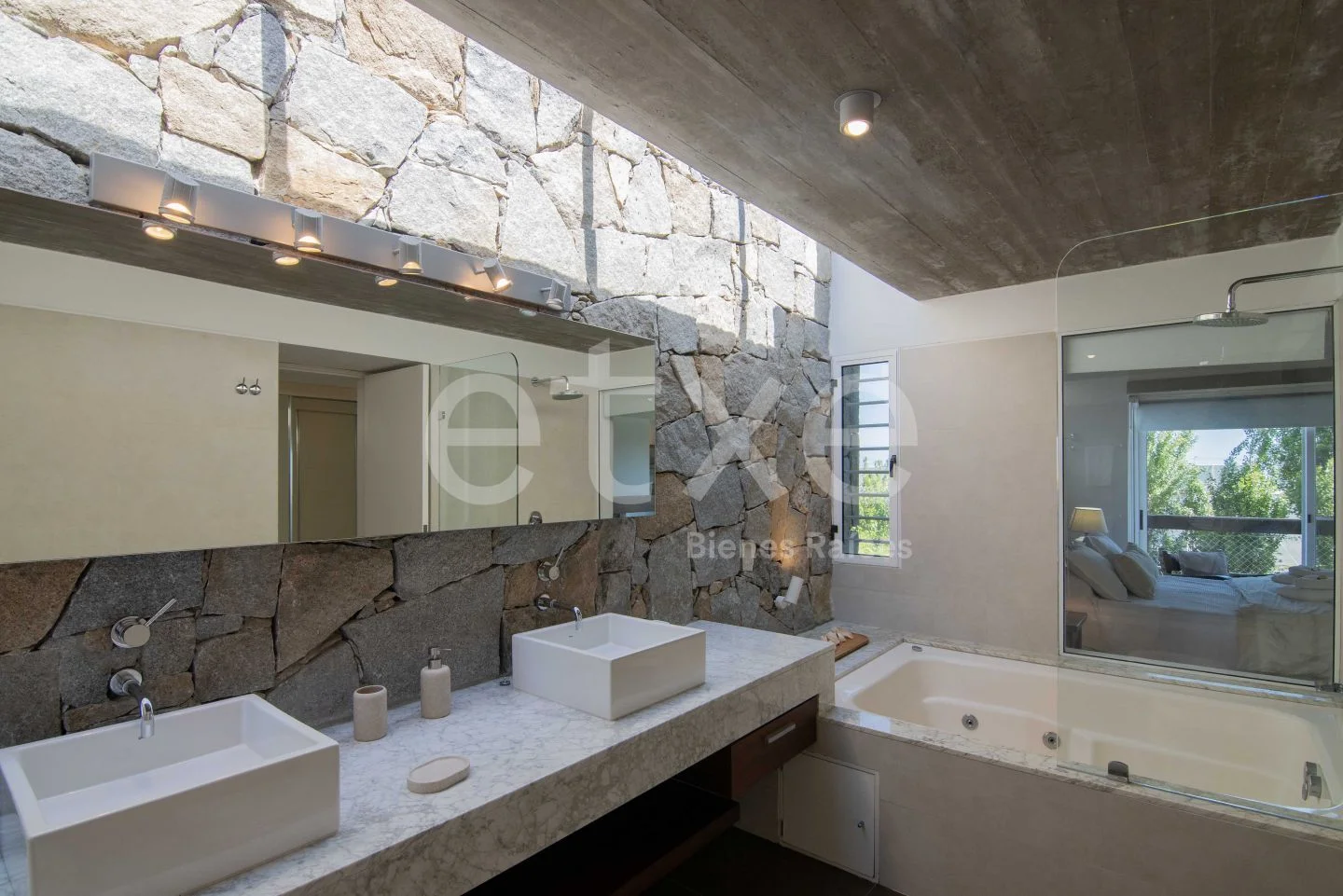 Dormitorio principal en suite con estufa a leña y baño con doble bacha y jacuzzi.