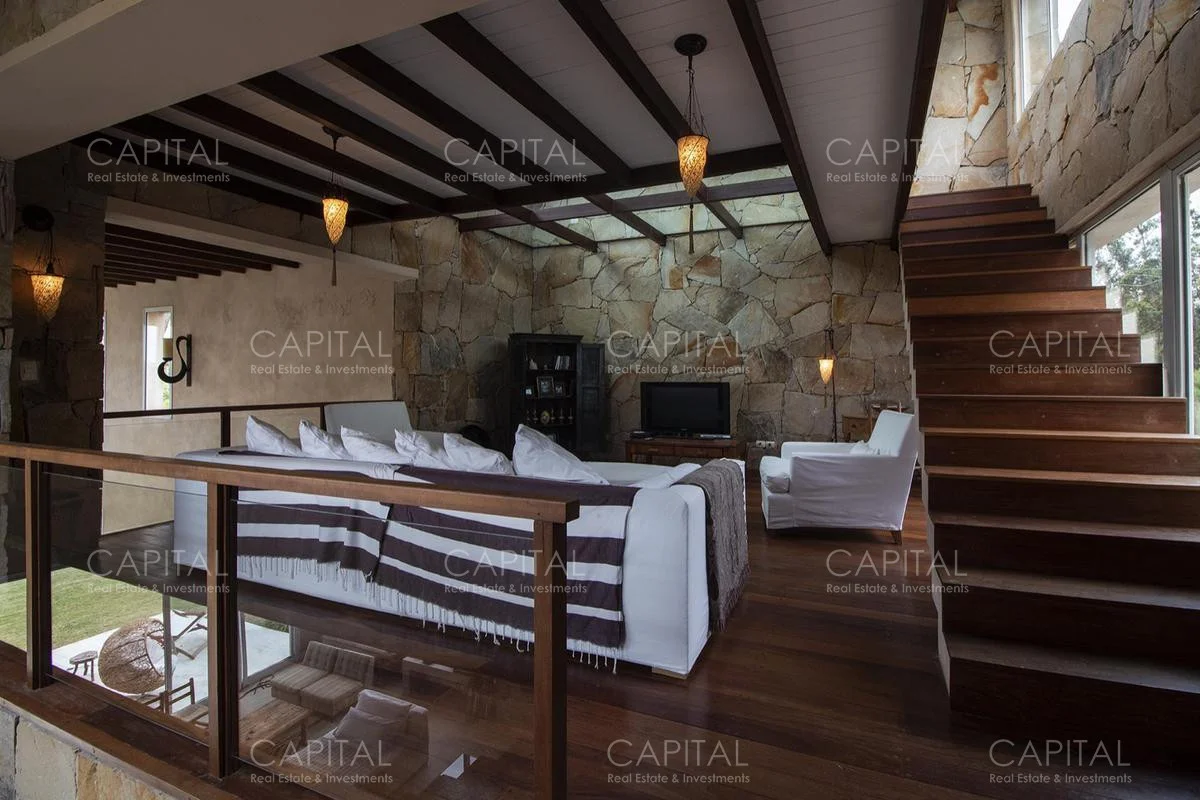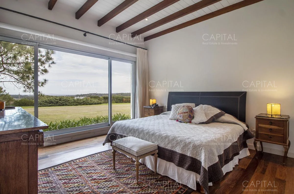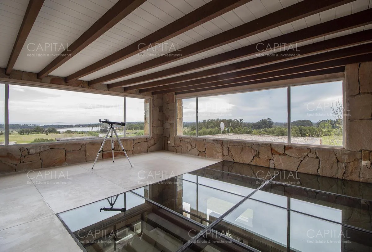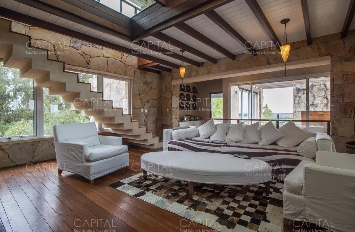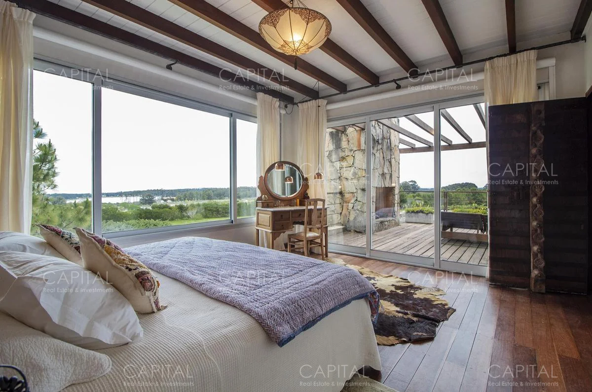 Cuenta con ambientes amplios y luminosos con grandes ventanales que ofrecen vistas espectaculares a la laguna, el mar y todo Punta Del Este. El aislamiento y la privacidad son las características principales de esta casa de 8 dormitorios todos con vistas magnificas. Los detalles en piedra ofrecen una apariencia natural al interior. El espacioso comedor y la amplia sala de estar con chimenea de leña de gran tamaño al igual que la cocina con grandes ventanas que dejan entrar luz natural. La suite principal en la planta alta, con una pequeña sala de estar con TV, vestidor y su propia terraza con impresionantes vistas. A través de puentes se llega a un hermoso refugio, donde se encuentra el cine en casa, con otra suite de invitados muy privada en el piso de arriba con vistas privilegiadas. El área de la piscina ofrece un patio con chimenea y asador se convierten en el lugar ideal para