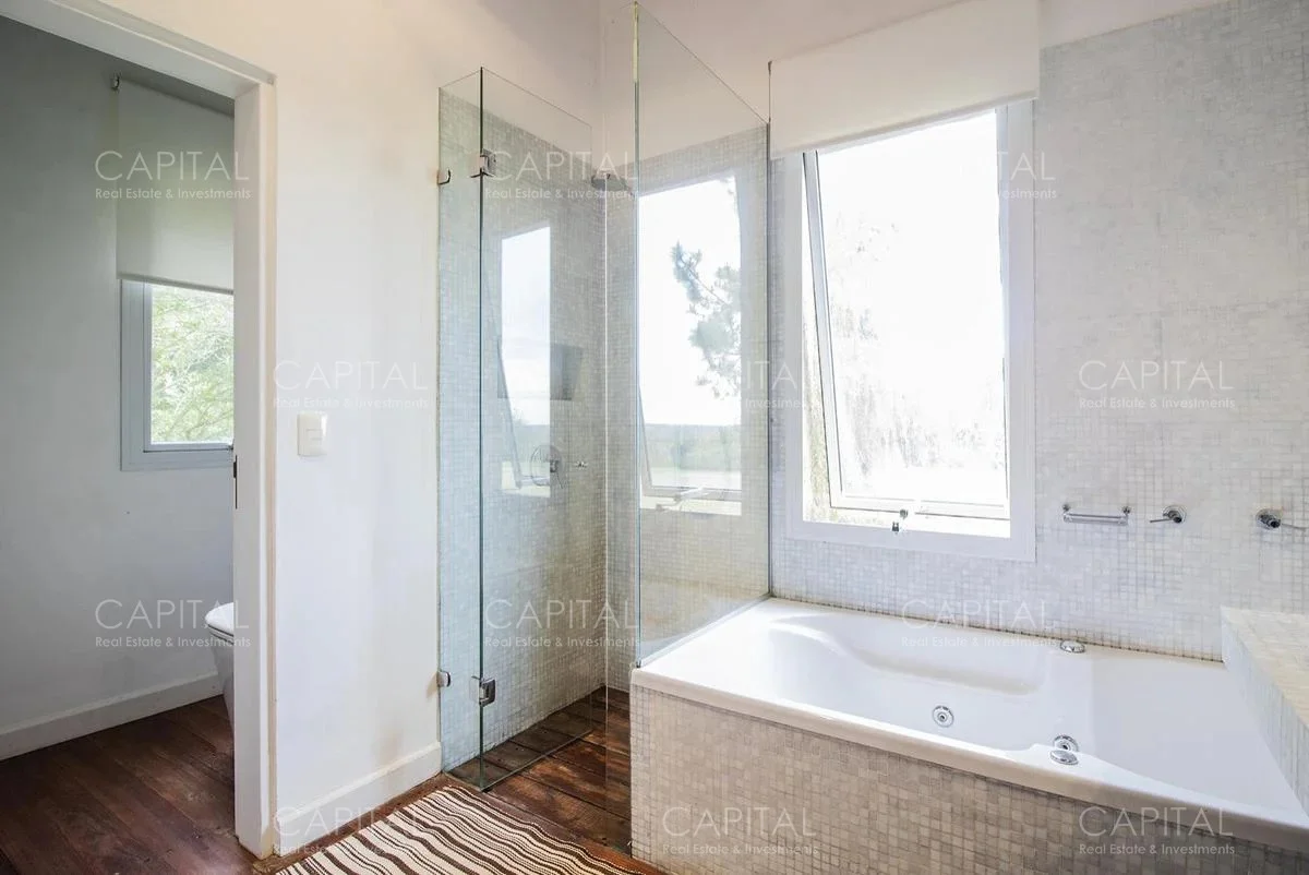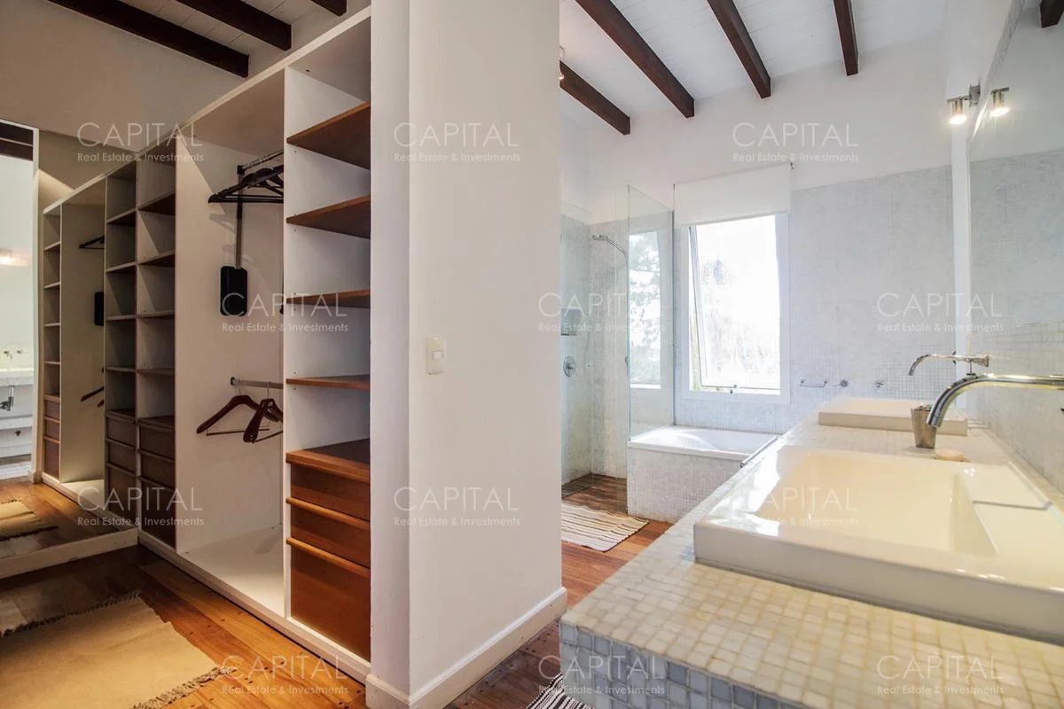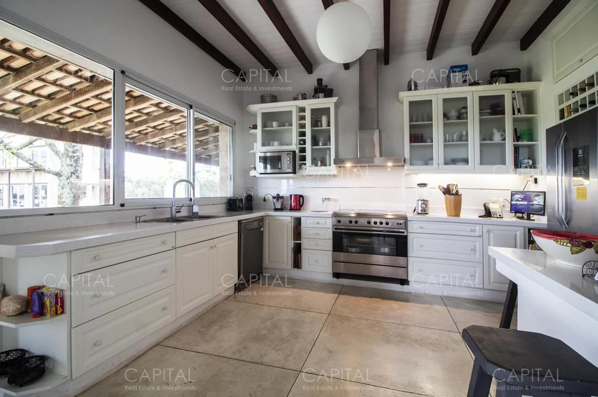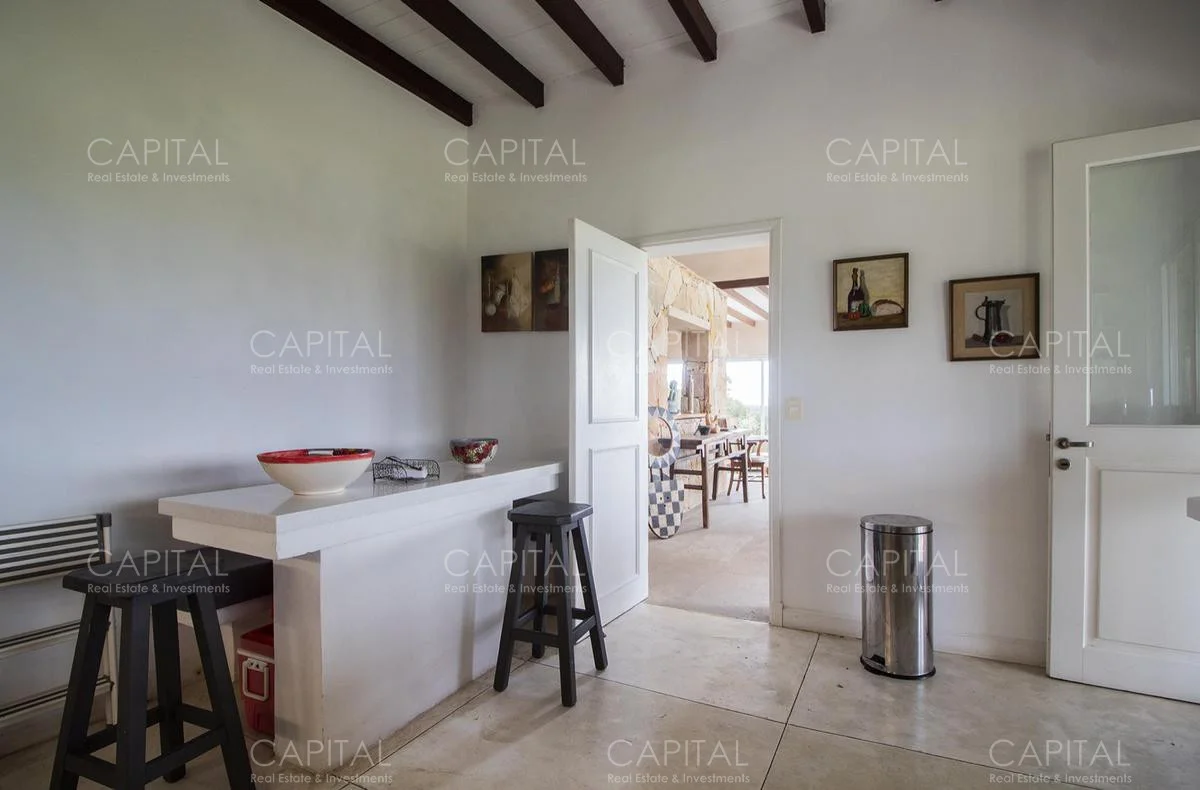 Cuenta con ambientes amplios y luminosos con grandes ventanales que ofrecen vistas espectaculares a la laguna, el mar y todo Punta Del Este. El aislamiento y la privacidad son las características principales de esta casa de 8 dormitorios todos con vistas magnificas. Los detalles en piedra ofrecen una apariencia natural al interior. El espacioso comedor y la amplia sala de estar con chimenea de leña de gran tamaño al igual que la cocina con grandes ventanas que dejan entrar luz natural. La suite principal en la planta alta, con una pequeña sala de estar con TV, vestidor y su propia terraza con impresionantes vistas. A través de puentes se llega a un hermoso refugio, donde se encuentra el cine en casa, con otra suite de invitados muy privada en el piso de arriba con vistas privilegiadas. El área de la piscina ofrece un patio con chimenea y asador se convierten en el lugar ideal para
