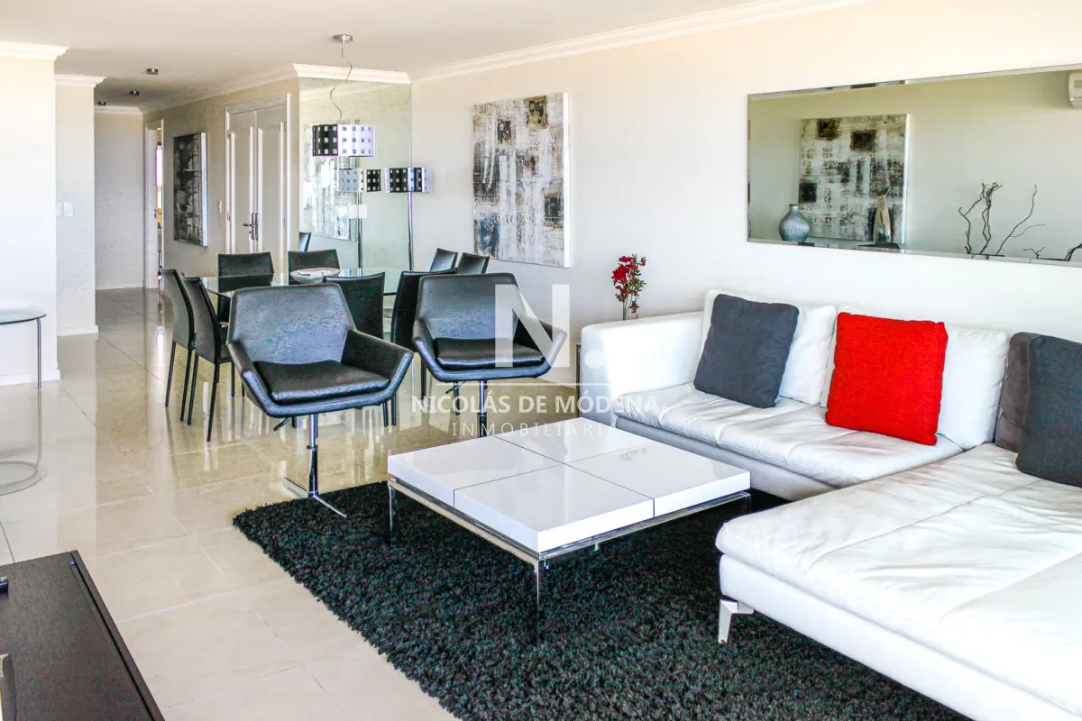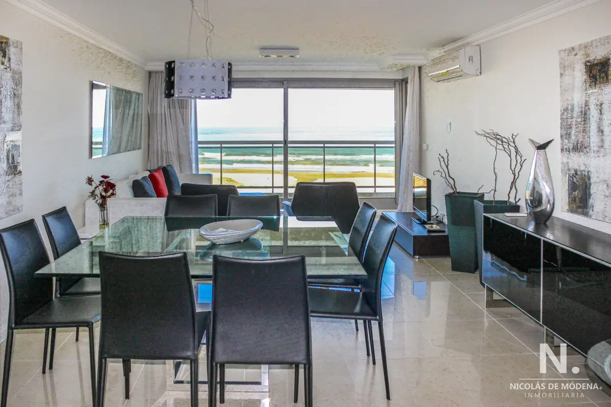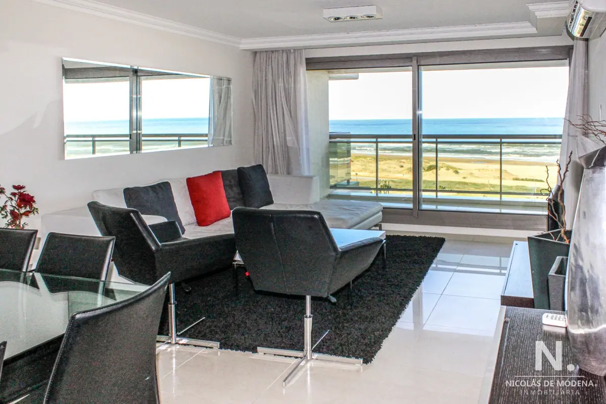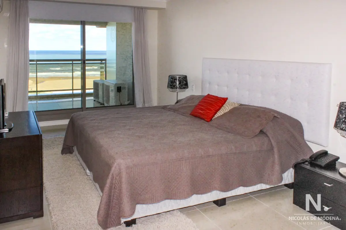 DEPARTAMENTO EN TORRE IMPERIALE, 3 SUITES, PUNTA DEL ESTE, PLAYA BRAVA, VENTA Primera línea frente al mar, amplio y luminoso living comedor con salida a importante terraza, toilette, suite principal con vista al mar, 2 dormitorios en suite con vista a la playa mansa, cocina definida con comedor diario, terraza lavadero, garaje, baulera, totalmente equipado! El edificio premium con excelentes servicios a pasos del mar y de la Península. Consulte con nuestros Agentes. Referencia Interna : Tera-6178