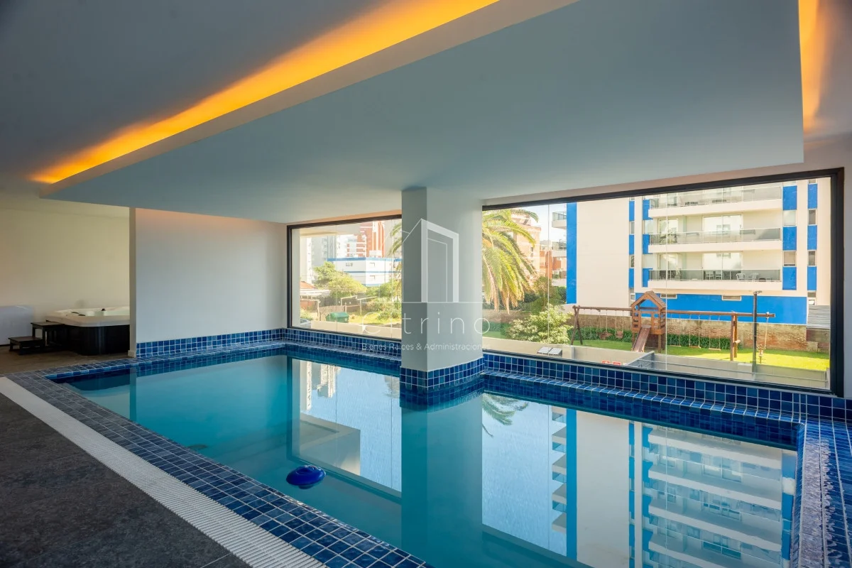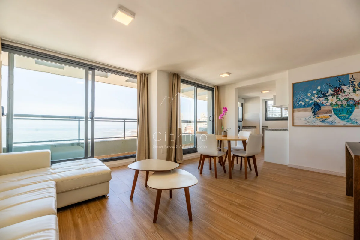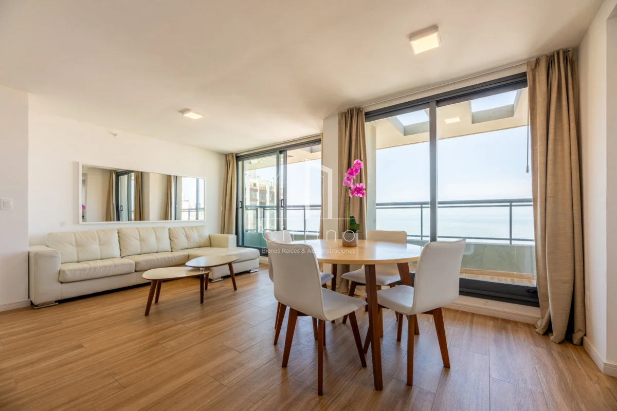 Piso alto en playa brava. Cuenta con 2 dormitorios, 2 baños (principal en siute), living-comedor con cocina integrada, terraza al frente con vista al mar y garage en subsuelo. Torre con servicio de recepcion 24hs, lavadero, piscina interna climatizada, piscina exterior, gym y parrilleros.