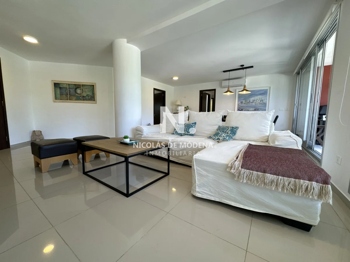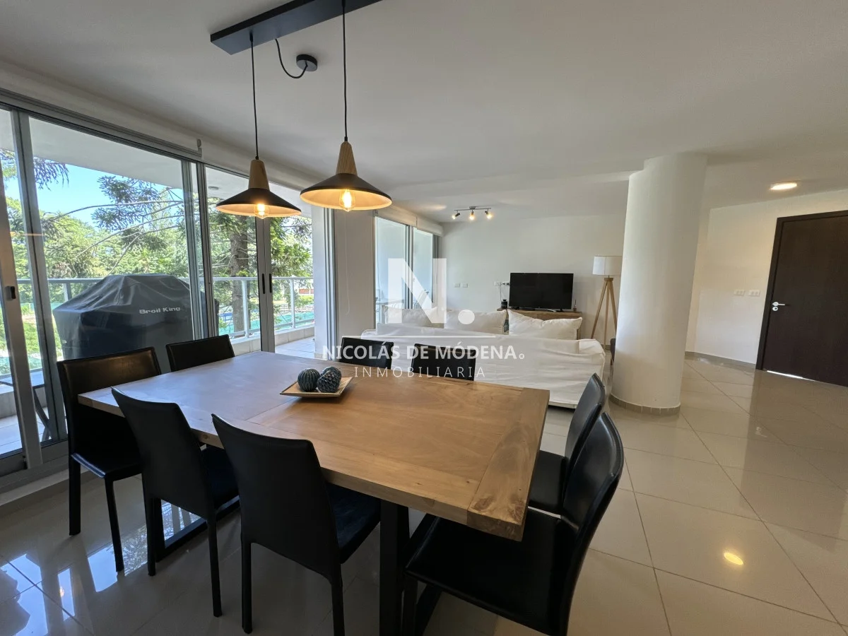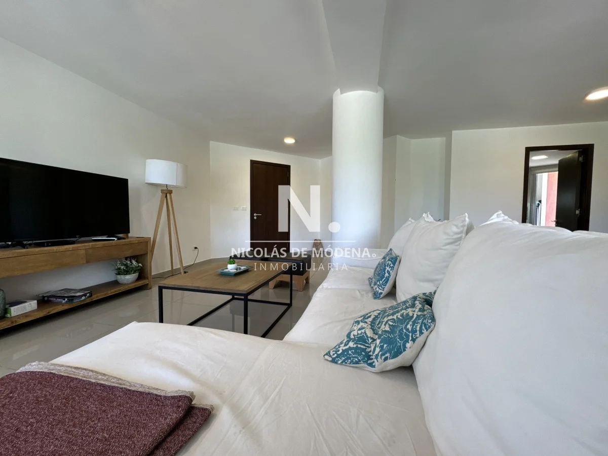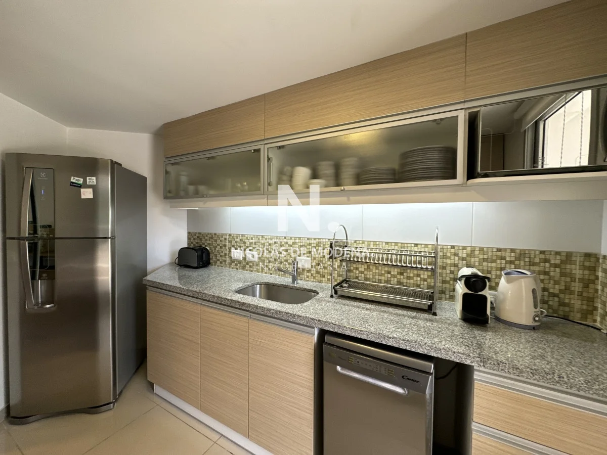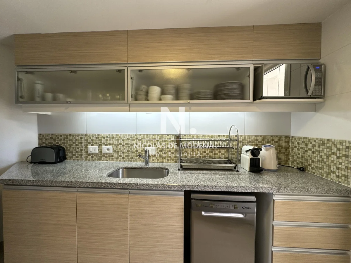 El diseño interior incluye una cocina definida, un amplio y espacioso living comedor, proporcionando múltiples áreas para el entretenimiento y la convivencia. El apartamento está equipado con todas las comodidades necesarias para una estancia confortable, como anafe, microondas, lavavajillas, heladera con freezer, tostadora, aire acondicionado, televisión y más.