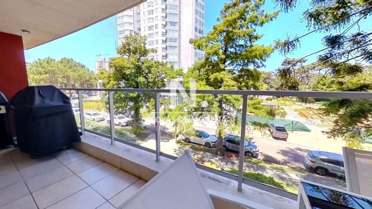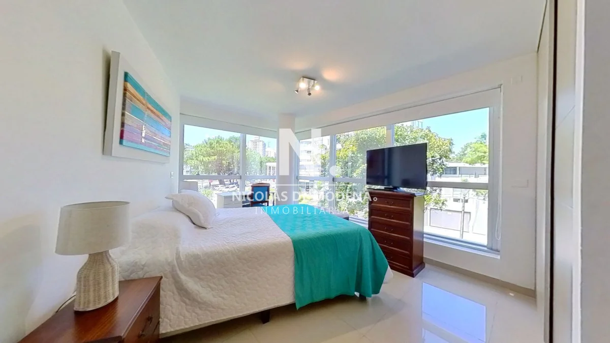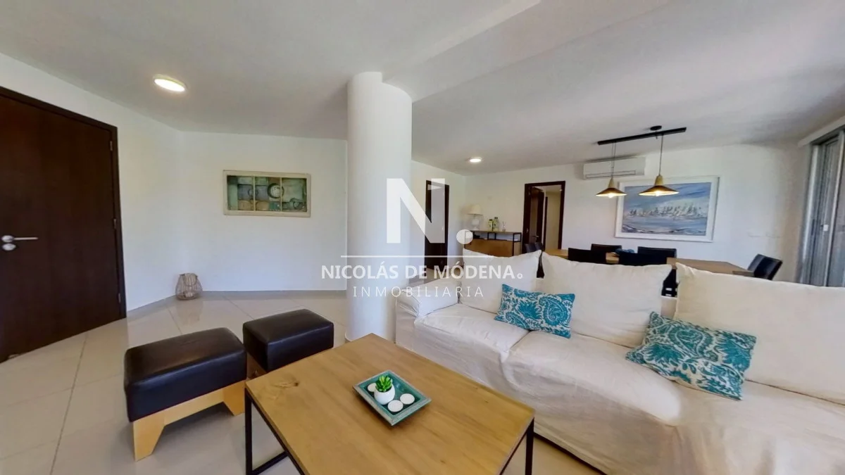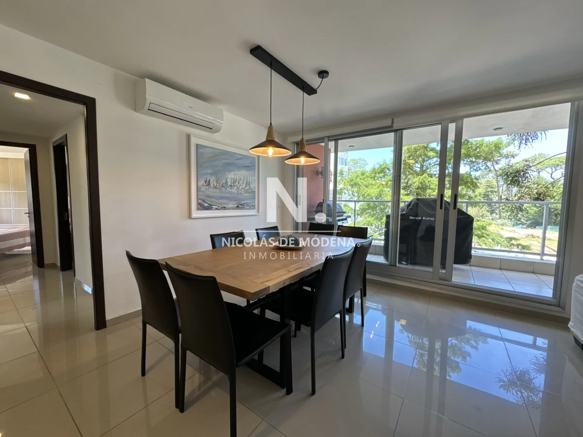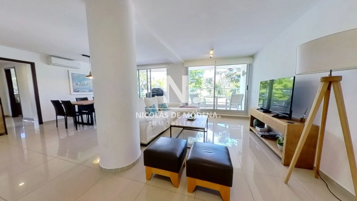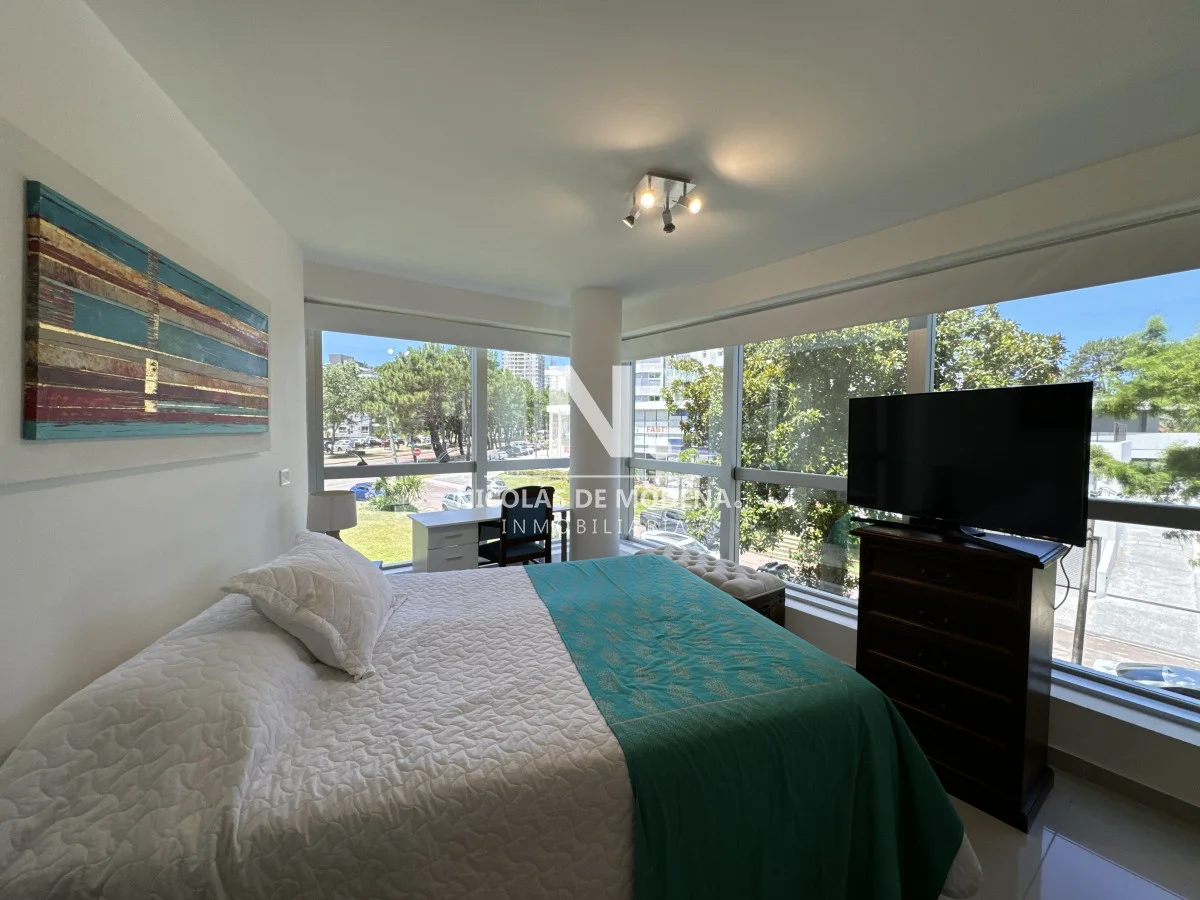 El diseño interior incluye una cocina definida, un amplio y espacioso living comedor, proporcionando múltiples áreas para el entretenimiento y la convivencia. El apartamento está equipado con todas las comodidades necesarias para una estancia confortable, como anafe, microondas, lavavajillas, heladera con freezer, tostadora, aire acondicionado, televisión y más.