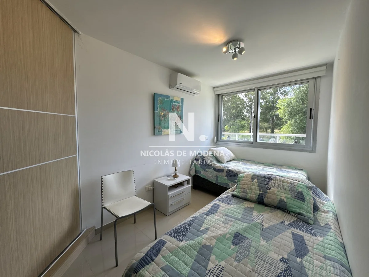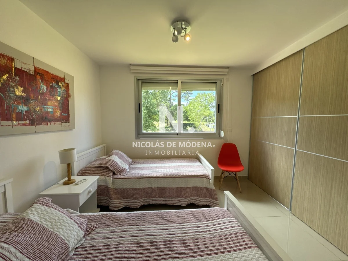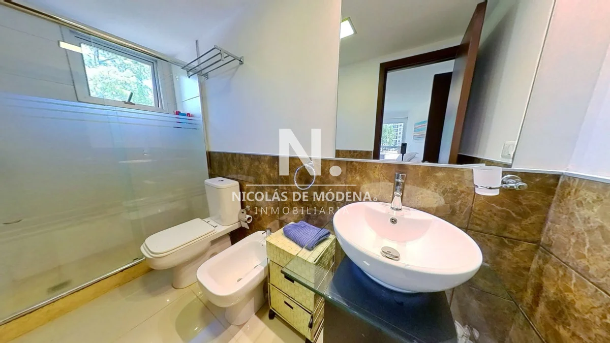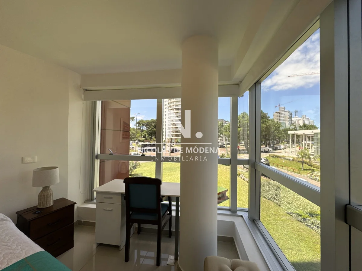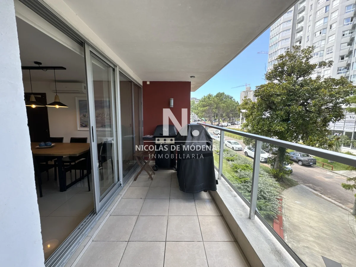 El diseño interior incluye una cocina definida, un amplio y espacioso living comedor, proporcionando múltiples áreas para el entretenimiento y la convivencia. El apartamento está equipado con todas las comodidades necesarias para una estancia confortable, como anafe, microondas, lavavajillas, heladera con freezer, tostadora, aire acondicionado, televisión y más.