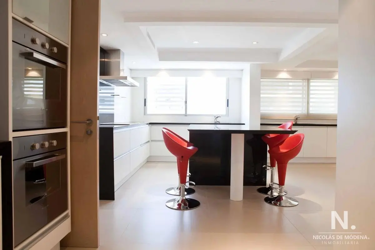 La cocina muy moderna tiene 3 freezer y dos heladeras incorporadas a los muebles, lo mismo que el lava-vajilla, isla central , profusión de muebles para guardar elementos de cocina. Una parte de la cocina tiene incorporado el lavadero con lavarropas y secarropas, pileta y mueble para elementos de limpieza. Dentro de la cocina hay otra habitación de servicio con su baño.