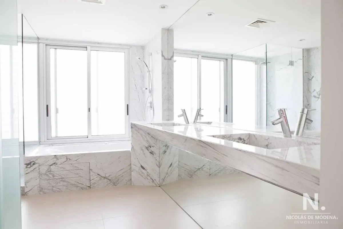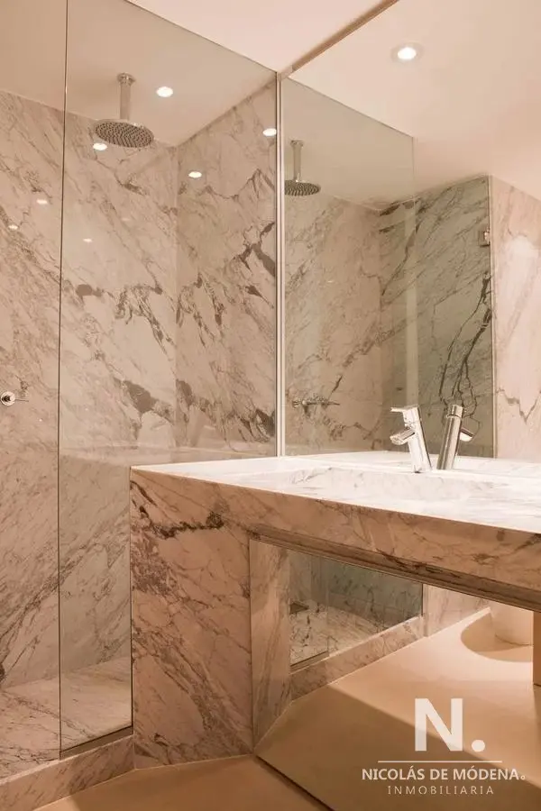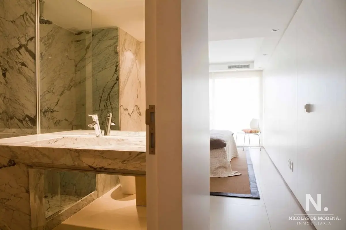 La suite principal que también se conecta con el escritorio que puede ser cerrada también con puerta corrediza. El sector del vestidor, se conecta con el baño principal, que consta de dos bachas y dos compartimentos, uno cerrado con ducha, inodoro y bidet, y otro abierto con inodoro -bidet, jacuzzi y ducha aparte.