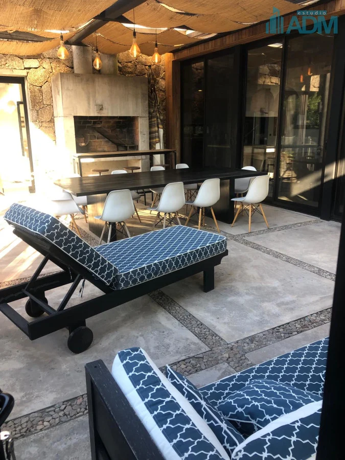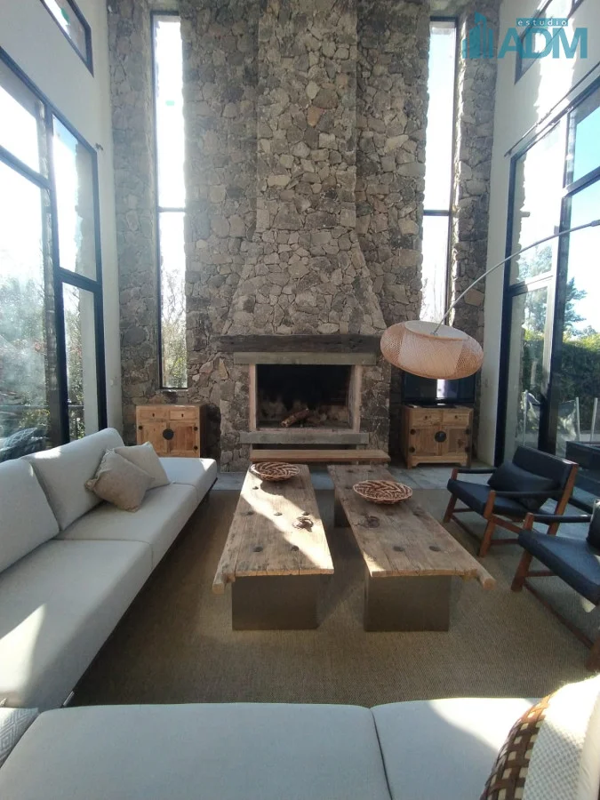 Gran living, de techos altos paredes revestidas en piedra con hogar y salida hacia jardín y parrillero a través de amplios ventanales.