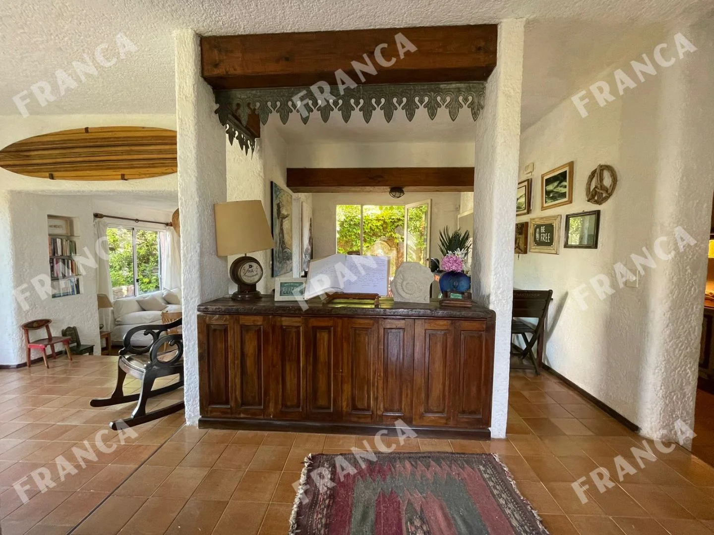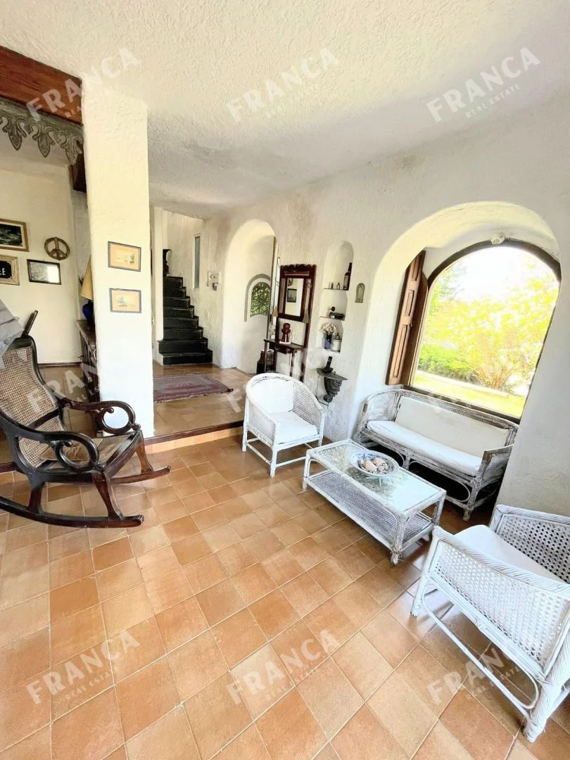 Cuenta con 5 dormitorios, 4 baños, diferentes salas de estar, cocina. El jardín cuenta con variados espacios. Tiene un espacio de Parrilla con grandes mesas.