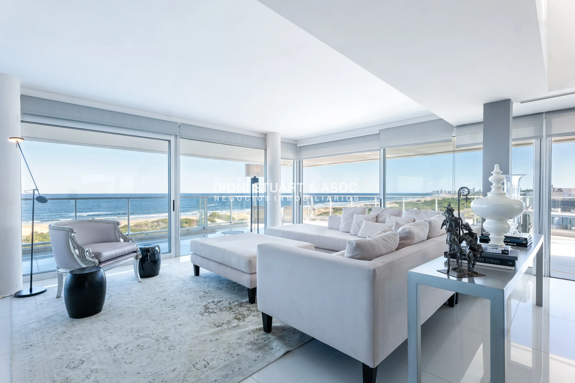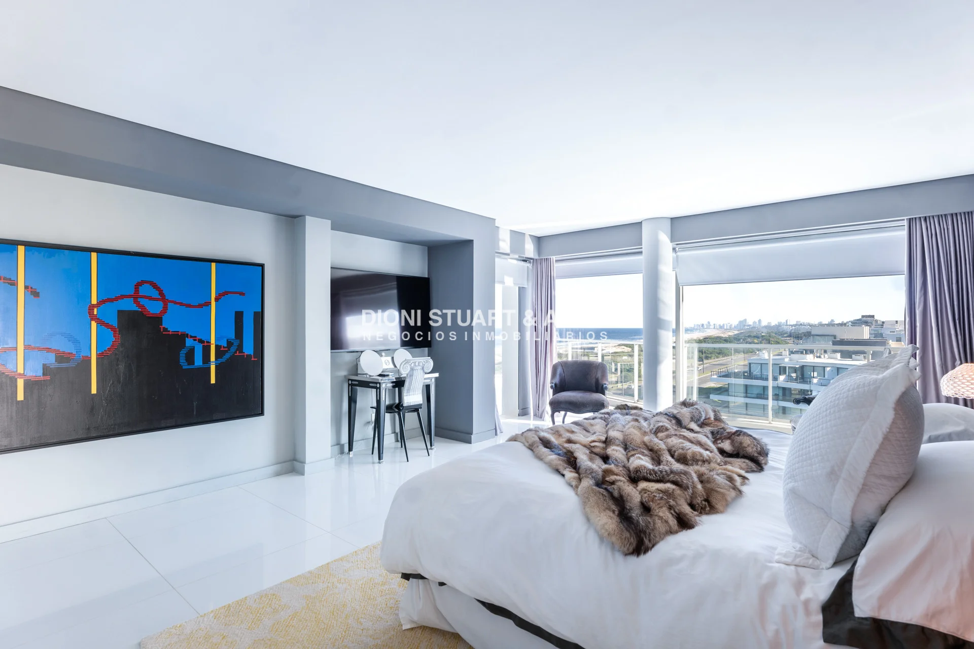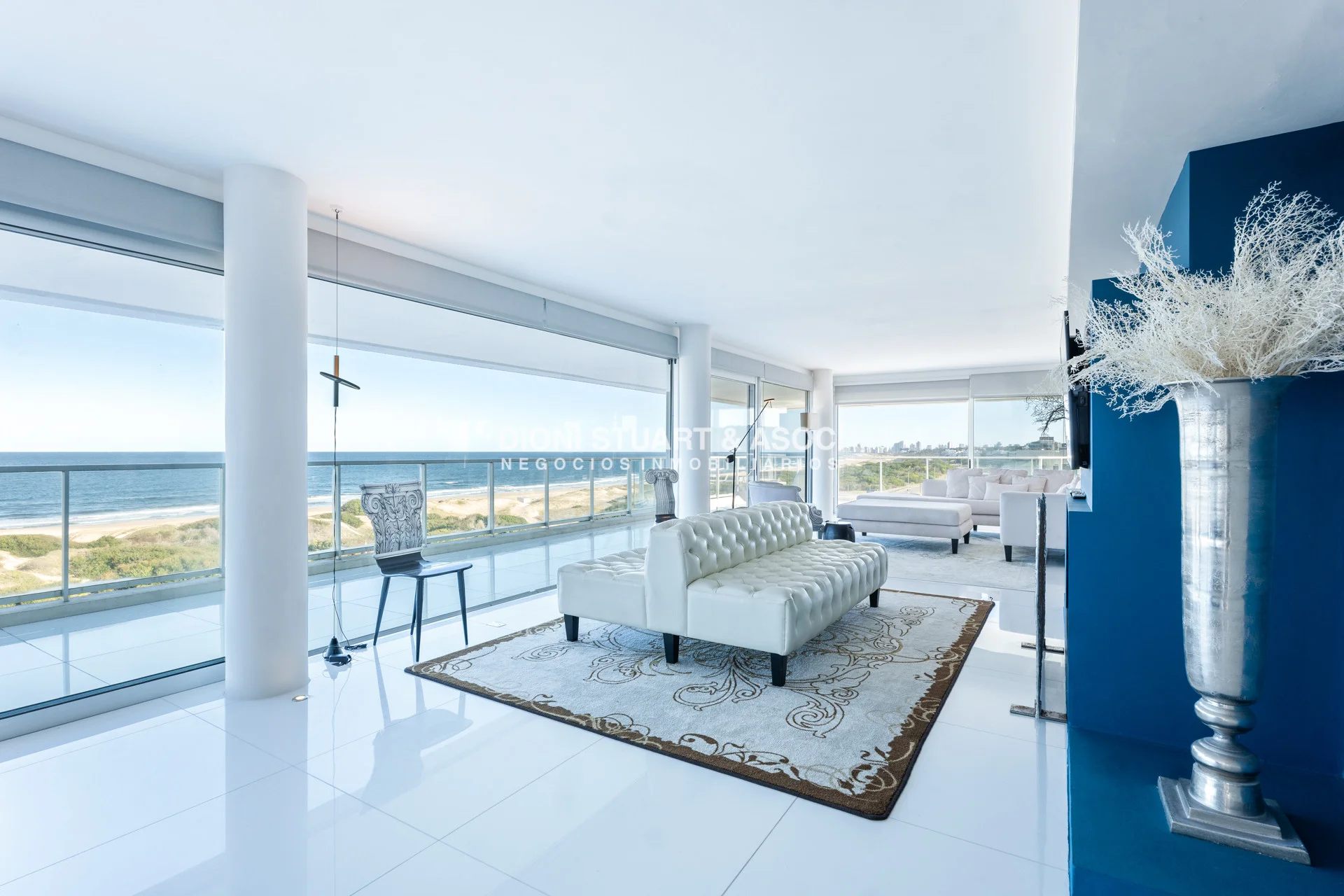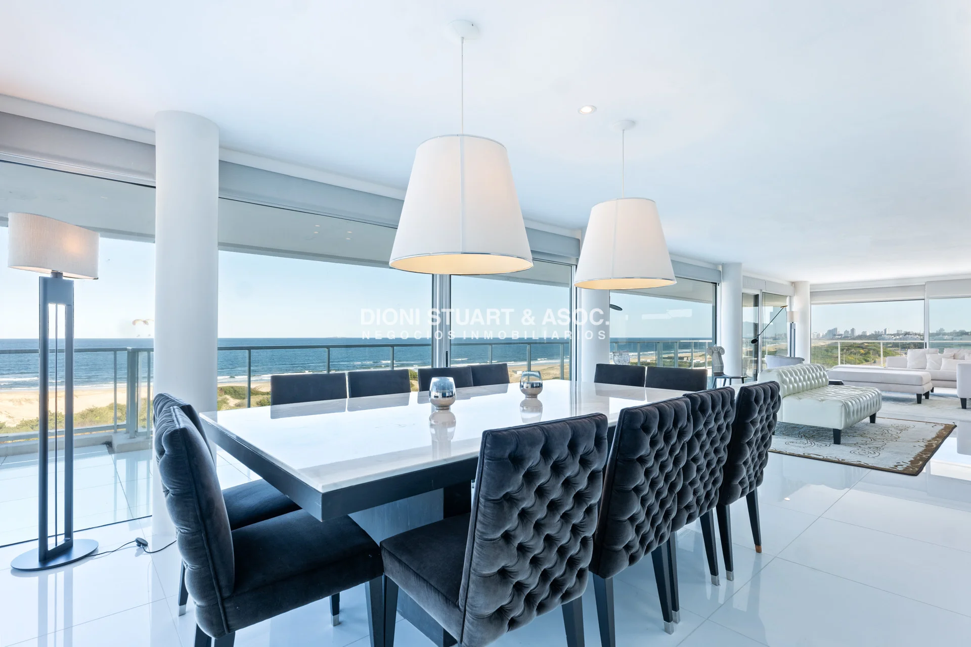 El departamento fue diseñado de una forma muy versátil, ofreciendo grandes áreas de estar, y 4 muy comodos dormitorios en suite. Su master suite cuenta con doble vestidor y baño (uno de ellos con jacuzzi). Living con hogar a leña, orientado todo hacia el mar, lugar desde donde accedemos a una terraza que rodea todo el perimetro del apartamento y permite disfrutar de excelentes vistas al mar. Cocina definida con isla estilo americana. A demás, desde el mismo piso a través de un ascensor interno se accede al duplex con parrillero y piscina. Cuenta con 4 garages, doble baulera y cava de vino.