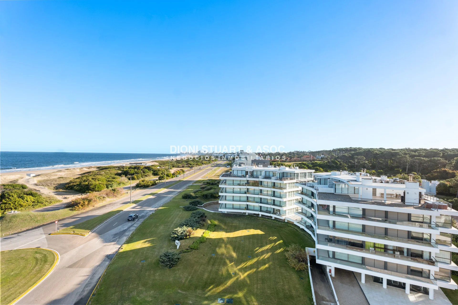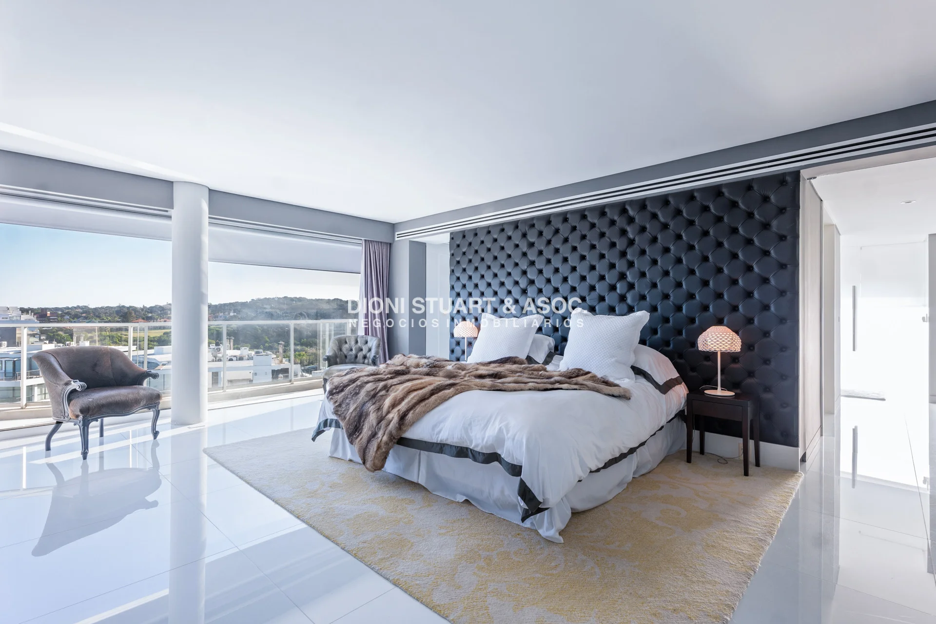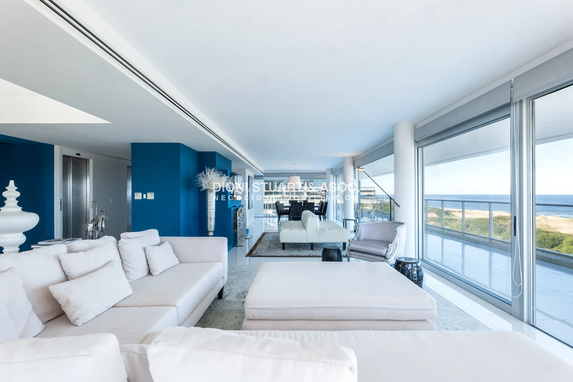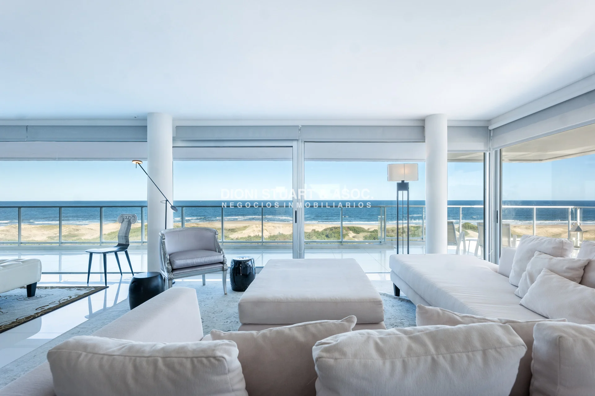 El departamento fue diseñado de una forma muy versátil, ofreciendo grandes áreas de estar, y 4 muy comodos dormitorios en suite. Su master suite cuenta con doble vestidor y baño (uno de ellos con jacuzzi). Living con hogar a leña, orientado todo hacia el mar, lugar desde donde accedemos a una terraza que rodea todo el perimetro del apartamento y permite disfrutar de excelentes vistas al mar. Cocina definida con isla estilo americana. A demás, desde el mismo piso a través de un ascensor interno se accede al duplex con parrillero y piscina. Cuenta con 4 garages, doble baulera y cava de vino.