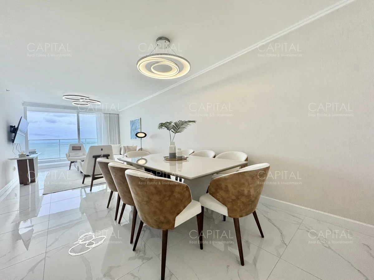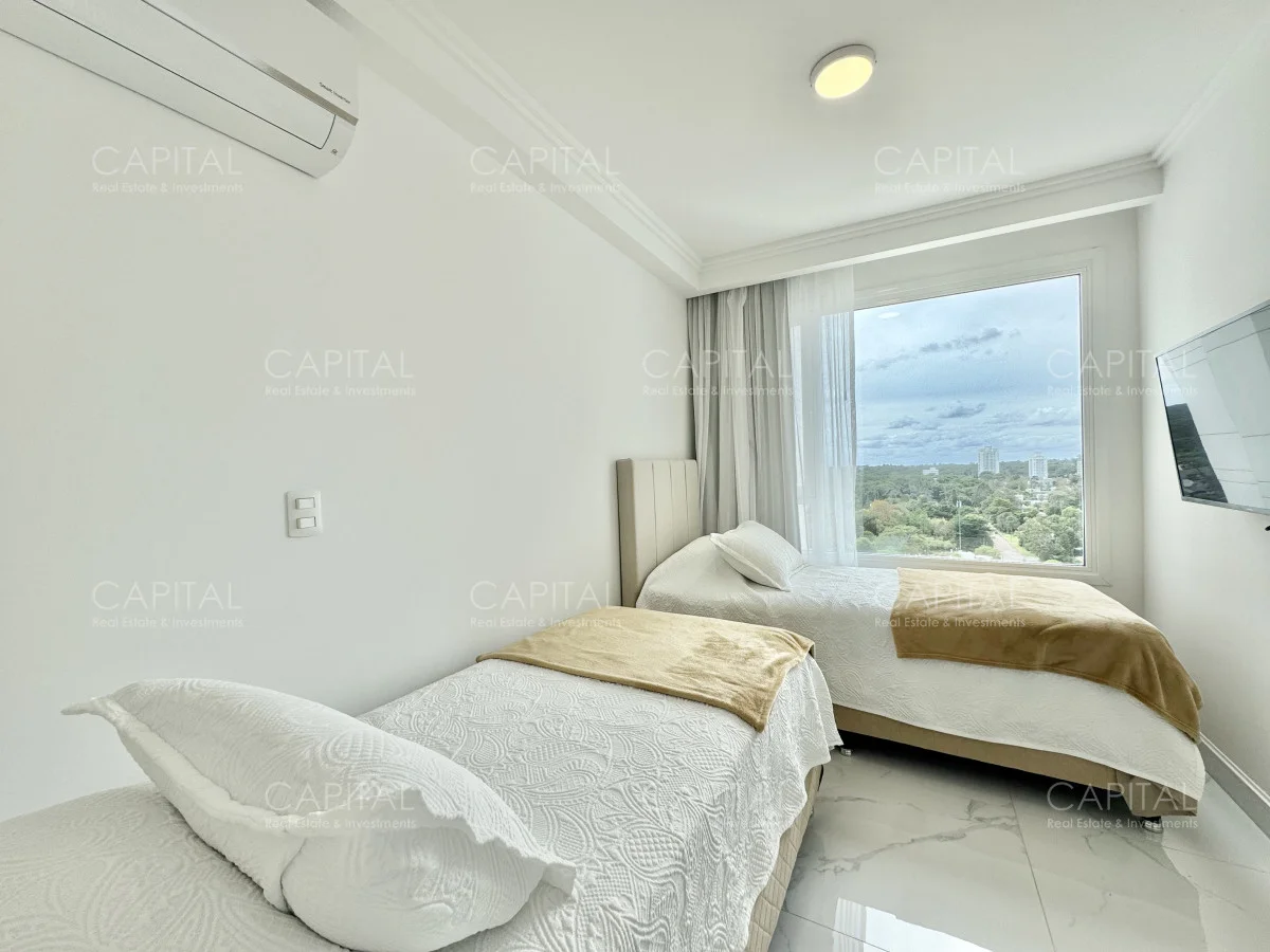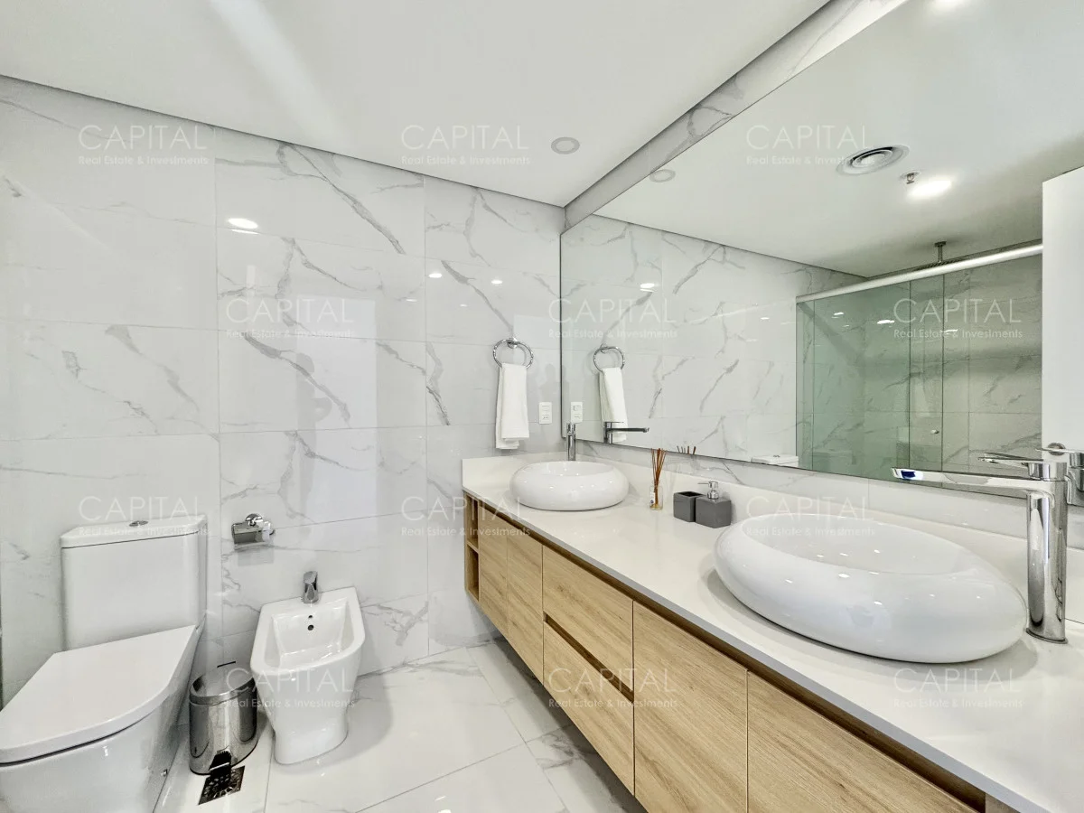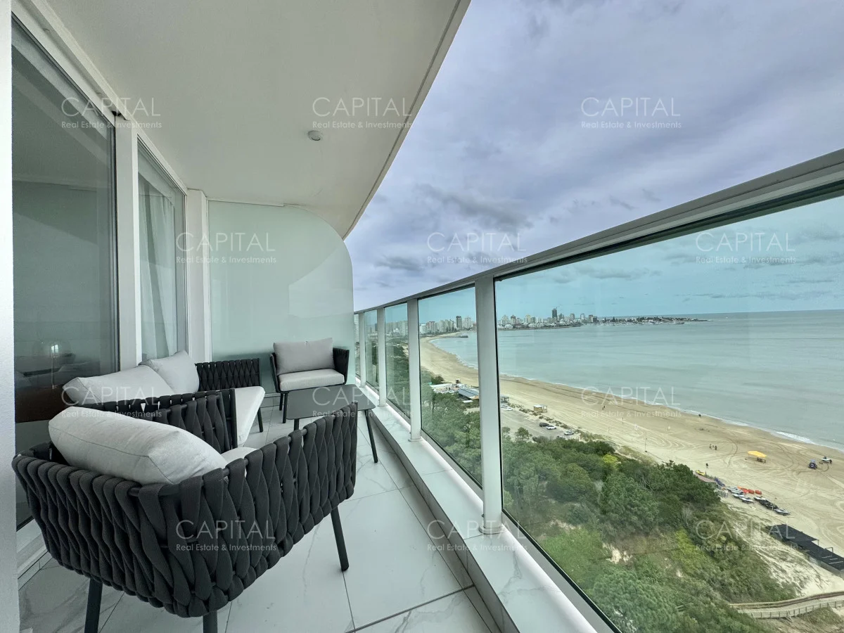 Apartamento de dos dormitorios uno en suite mas toilette social, palier privado con ocho ascensores de gran velocidad, la ubicación del edificio en primera linea frente al mar ofrece una vista totalmente panorámica de la Playa Mansa.