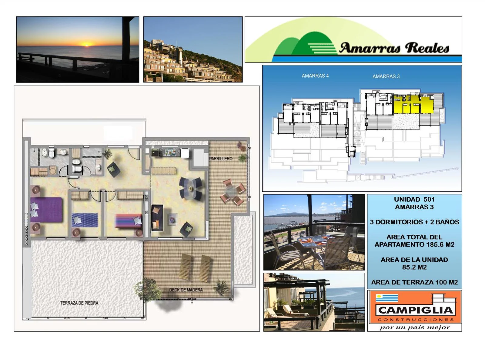 Amarras reales es un emprendimiento residencial situado frente al mar en un lugar privilegiado por la naturaleza, donde las líneas de energía se fusionan con el entorno transmitiendo paz y armonía. Espléndidos apartamentos de estilo mediterráneo, amplias terrazas y magníficas vistas de la puesta de sol. Esta obra es un verdadero balcón de más de 170 metros sobre el puerto de Piriápolis y constituye la postal de bienvenida para navegantes y turistas.