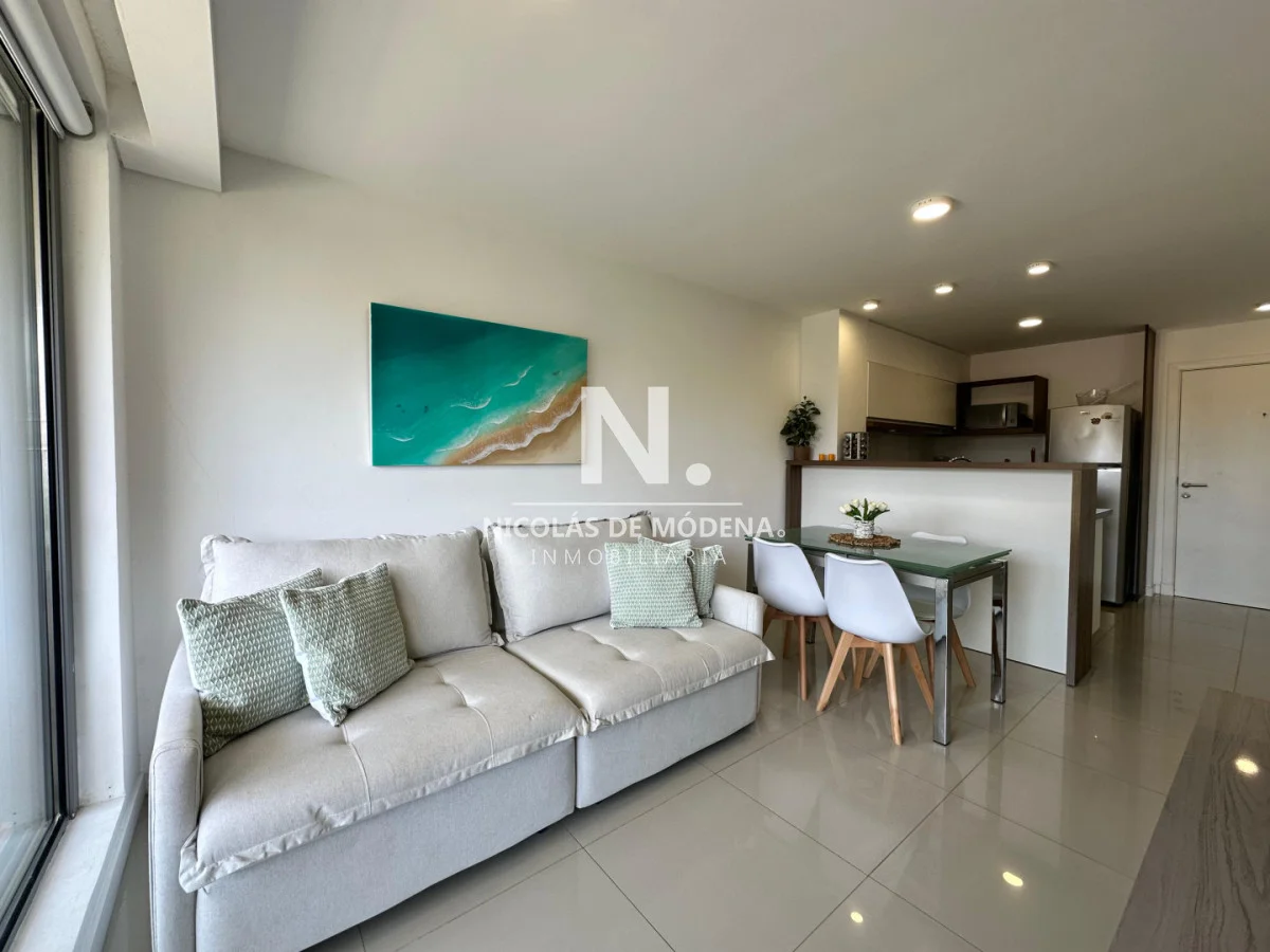El área social se compone de un living-comedor amplio y acogedor, con ventanales que brindan excelente luminosidad natural. La cocina, completamente equipada, dispone de anafe, horno, microondas, heladera con freezer, campana, placard y aire acondicionado, complementando un espacio moderno y práctico. El dormitorio, con placard empotrado, invita al descanso y al confort, mientras que el baño cuenta con bidet y terminaciones de calidad.